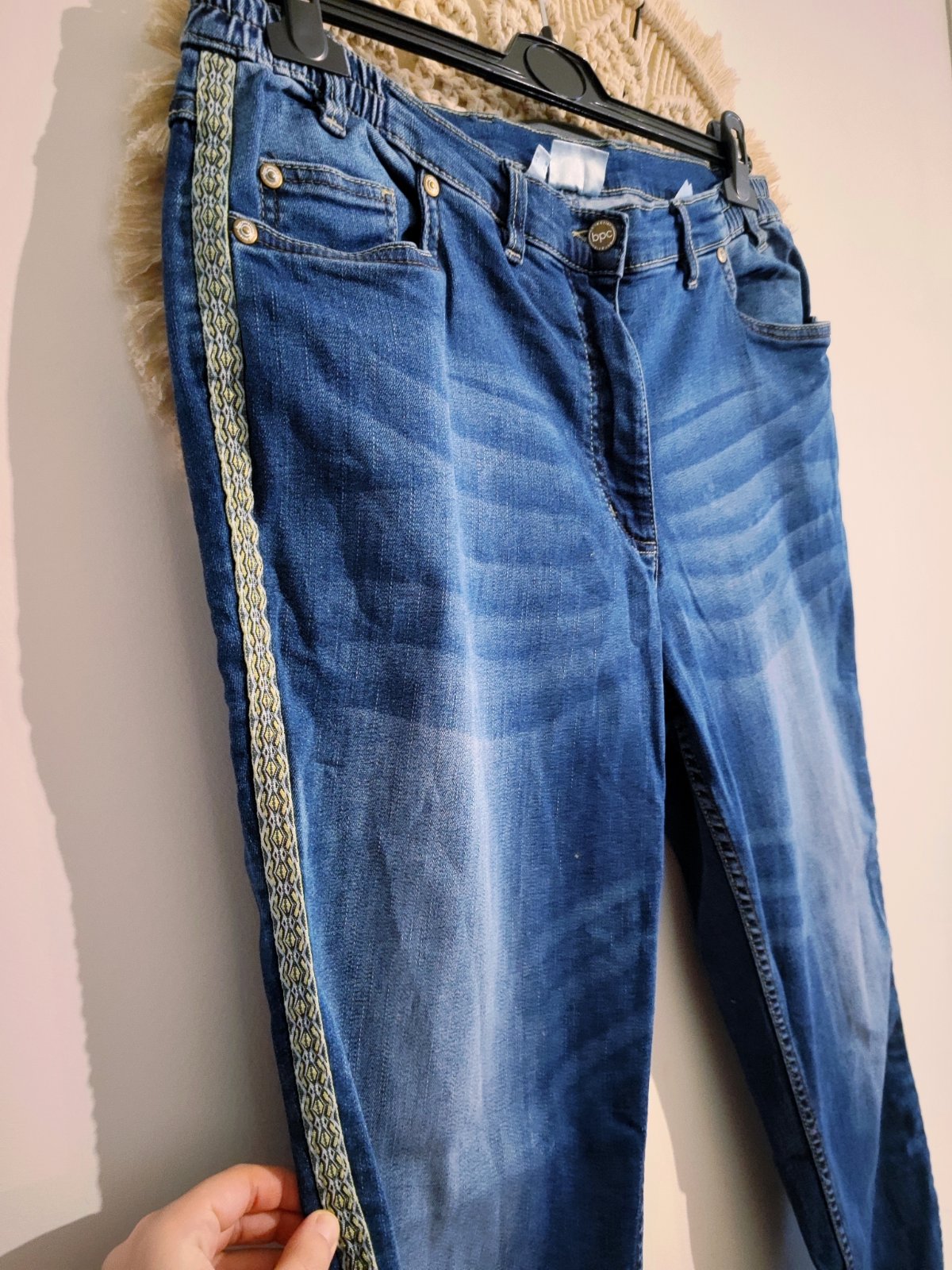 nové, boli mi veľké a nestíhala som vrátiť. Farba ako na detailnej fotke. Vpredu aj vzadu po 2 funkčné vrecká Veľkosť uvedená 44, ale sedia na v. 46. Pridávam rozmery: pás v kľude 2 x 45 cm, natiah...