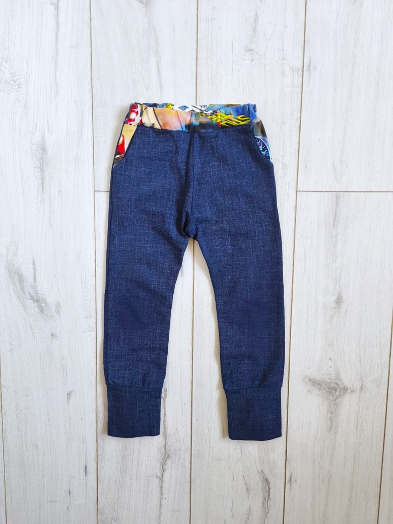 Ponúkam tieto tepláčiky zn. BERNIUKY, jeansového vzhľadu, s farebným pásom, bočnými vreckami, v perfektnom stave, veľkosť sedí na 110/116.