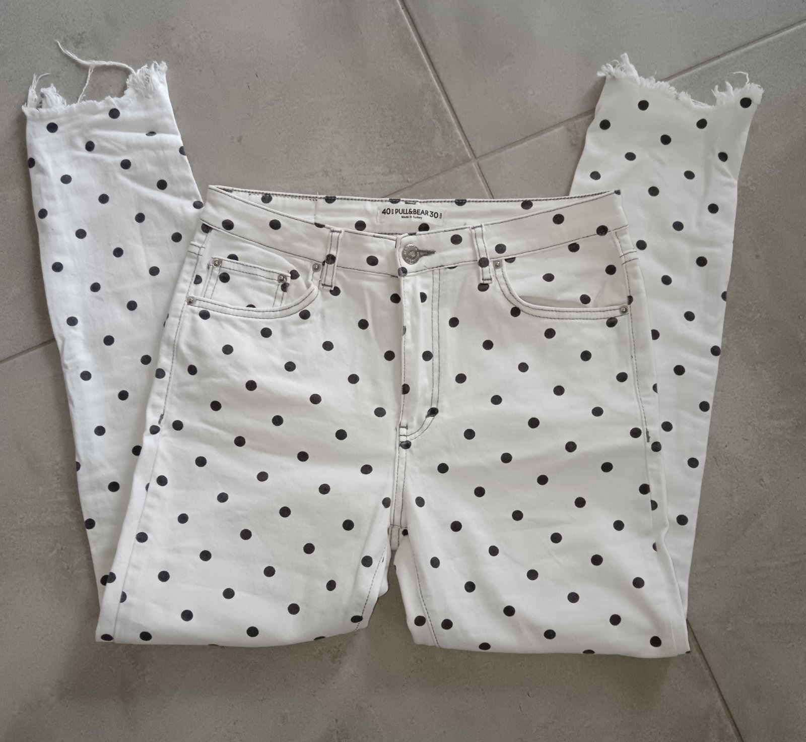 Predám krásne potrhané rifle s vysokým pásom.Strih MOM JEANS.Velkost 34,sedia skôr na 36.Pas 36cm.Dlzka 90cm.Cena 7€+pošta.