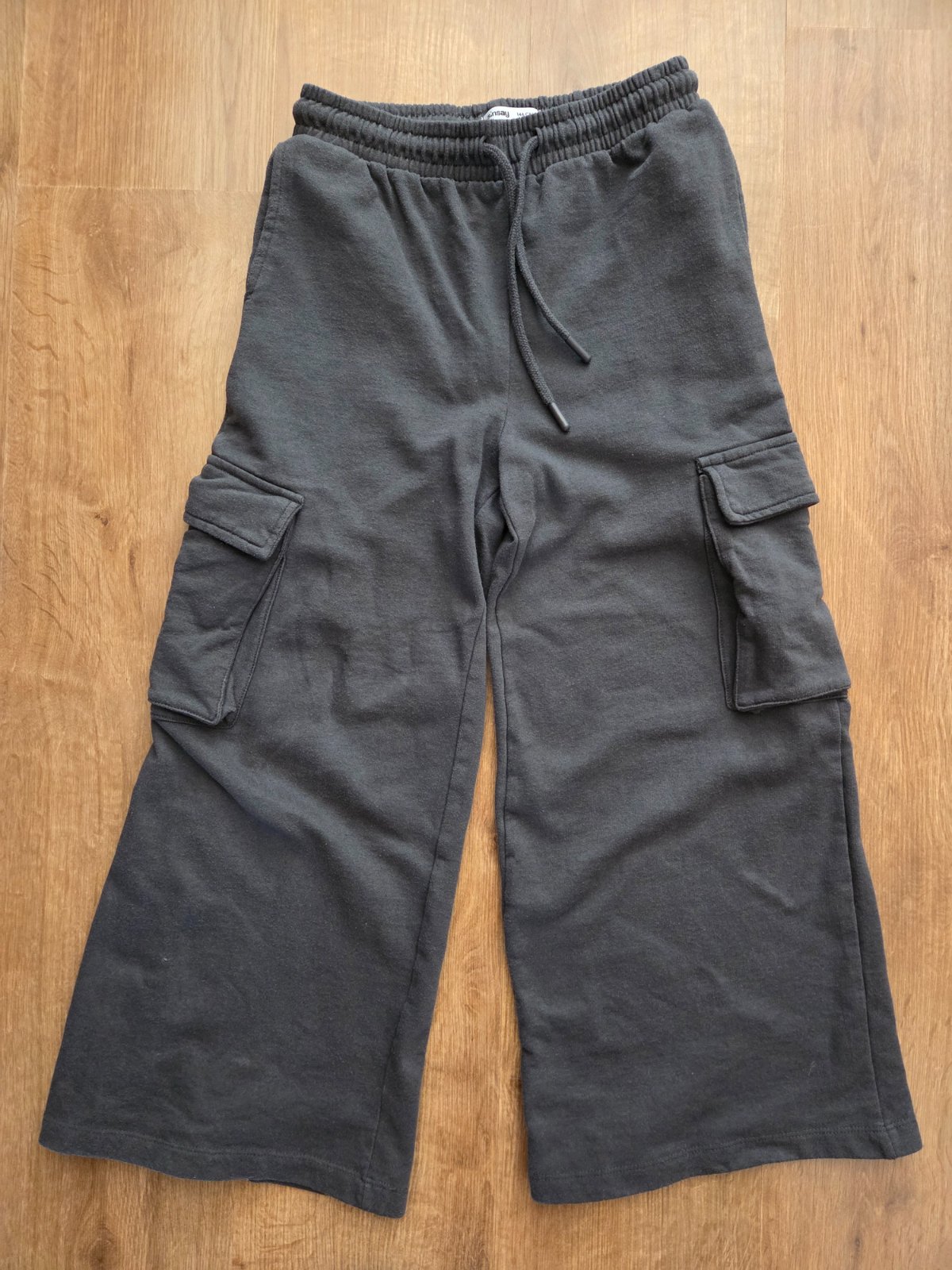 Tepláky kapsace v dobrom nosenom stave, hrubší materiál, dĺžka 80cm. Píšu 146, podla mňa nositeľne aj skôr.