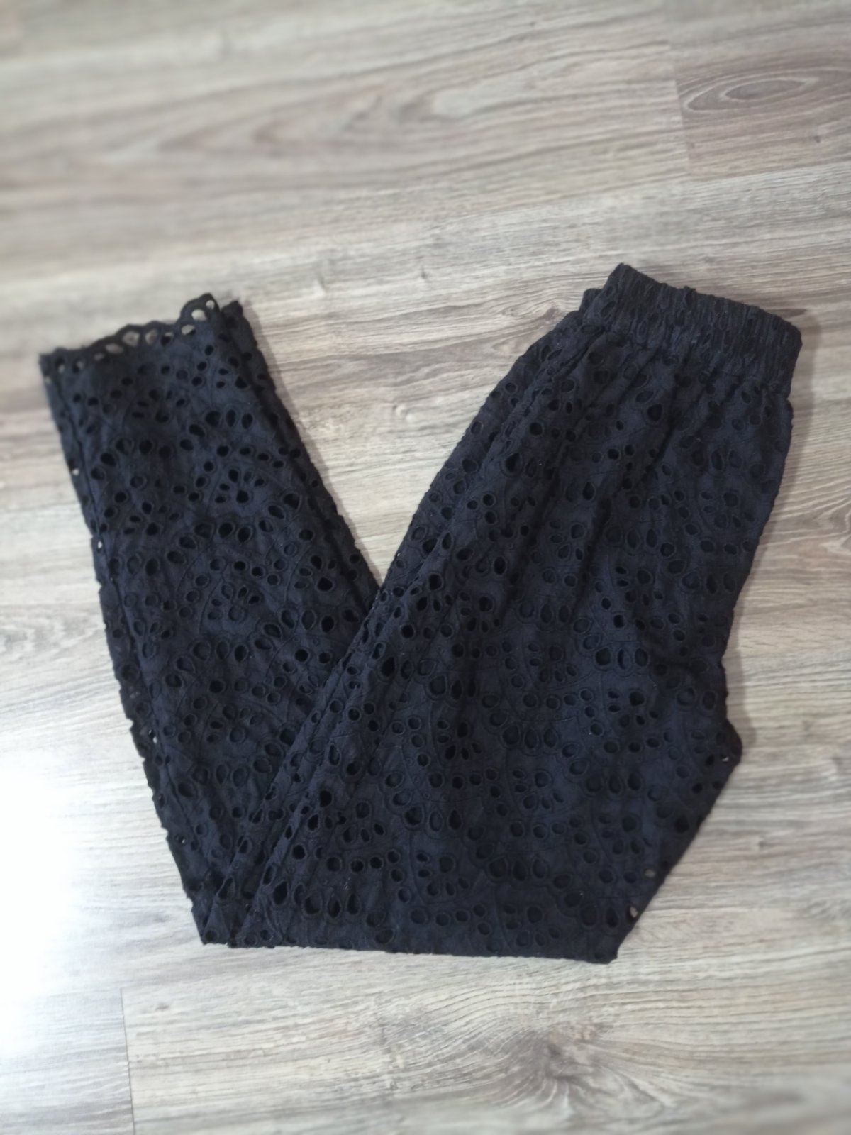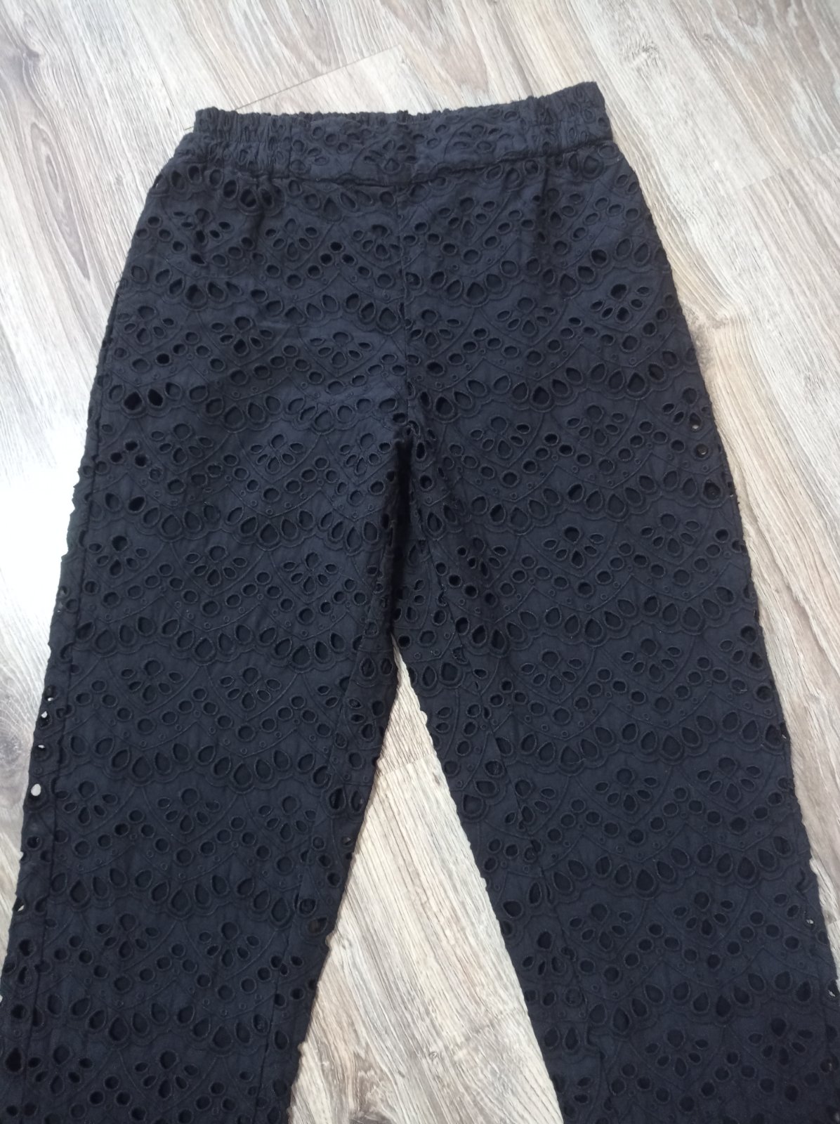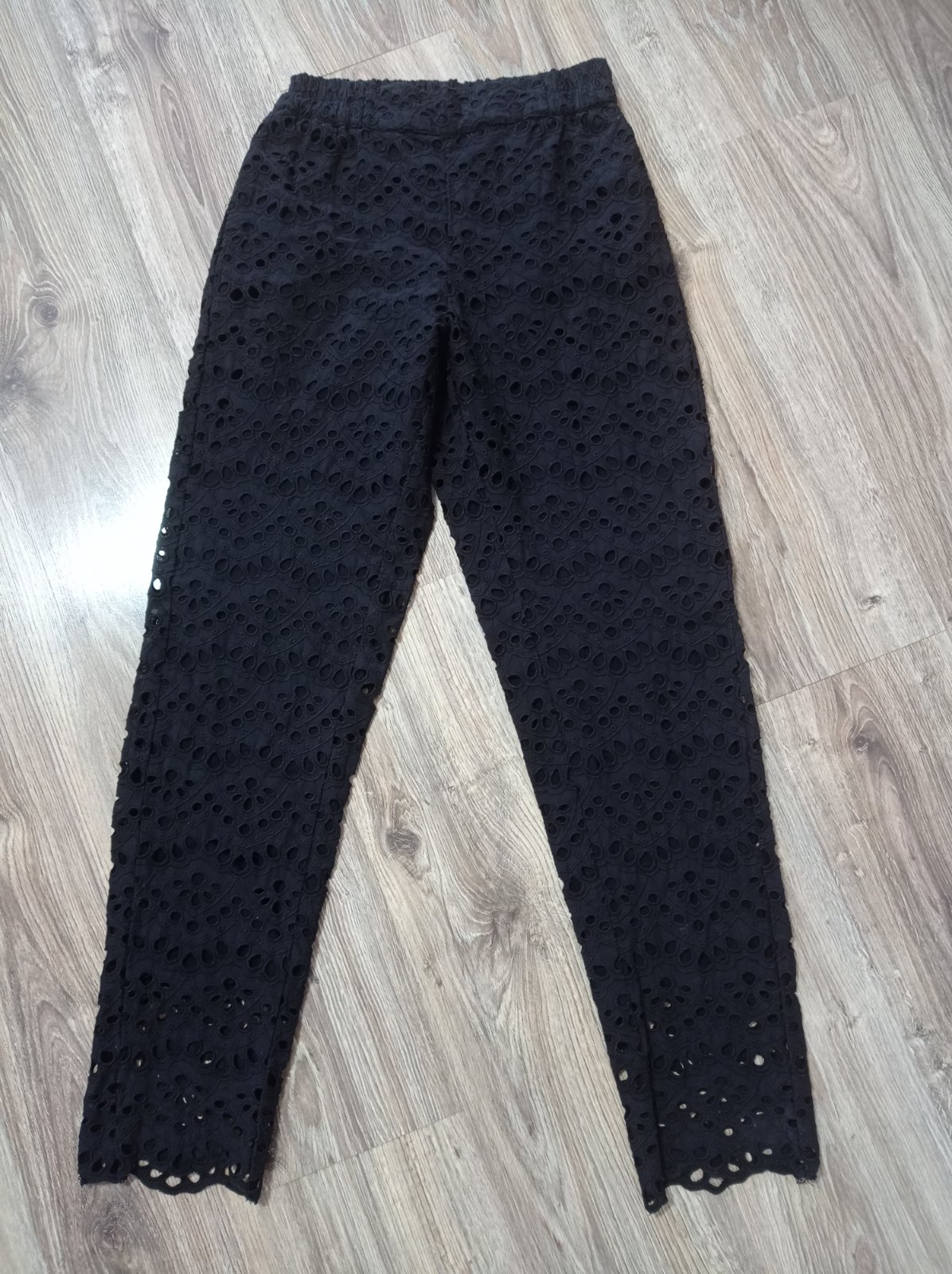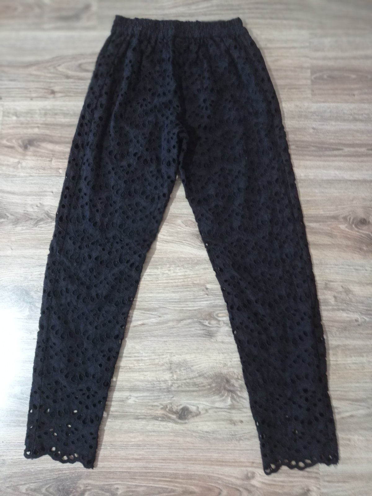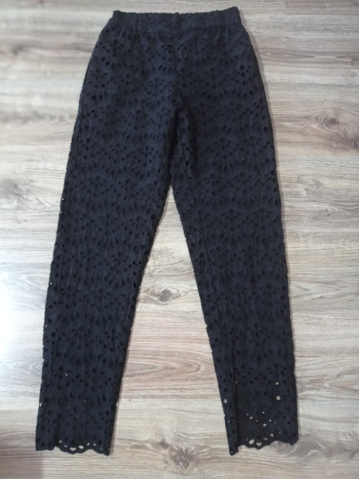 Nohavice sú vo výbornom stave, čierne, nepresvitajú, sú podšité. V páse majú širokú gumu. Veľkosť S, pás 35 cm x 2, natiahne sa do cca 40 cm x 2, dĺžka 106 cm.