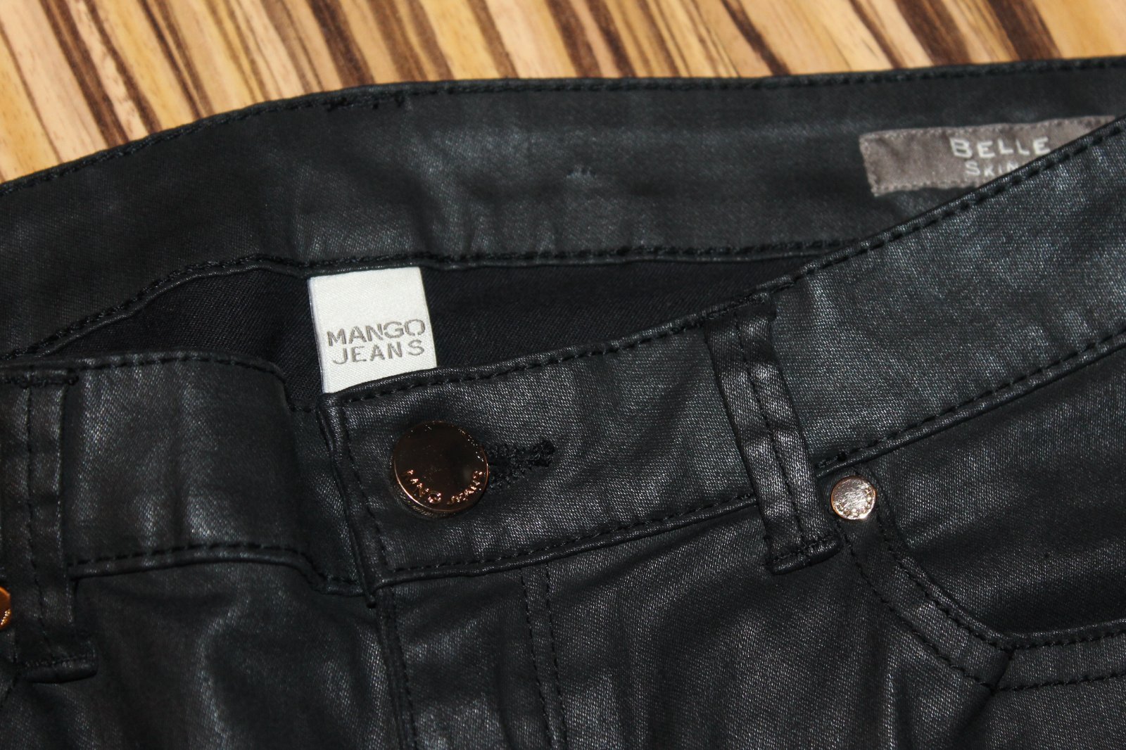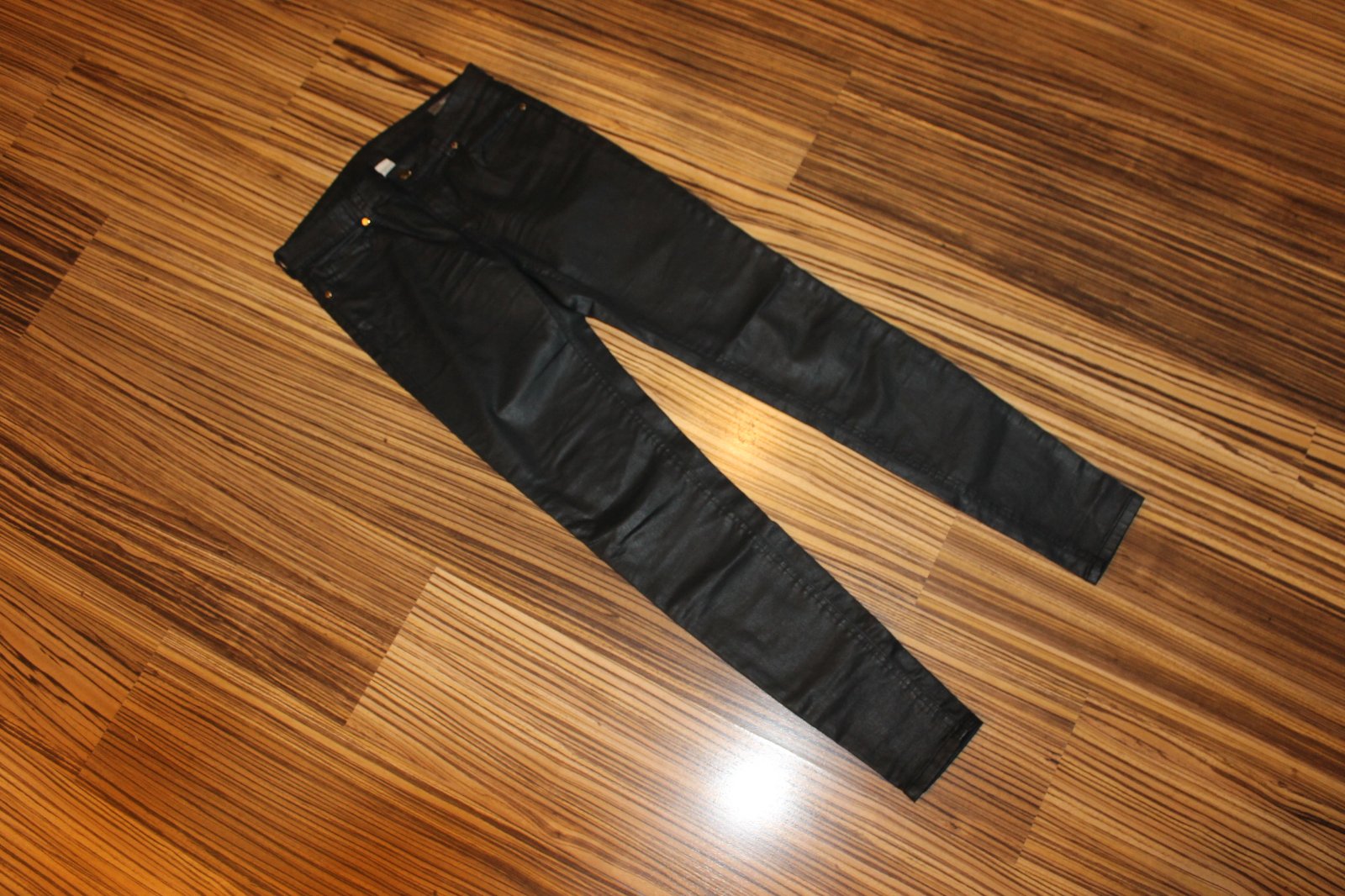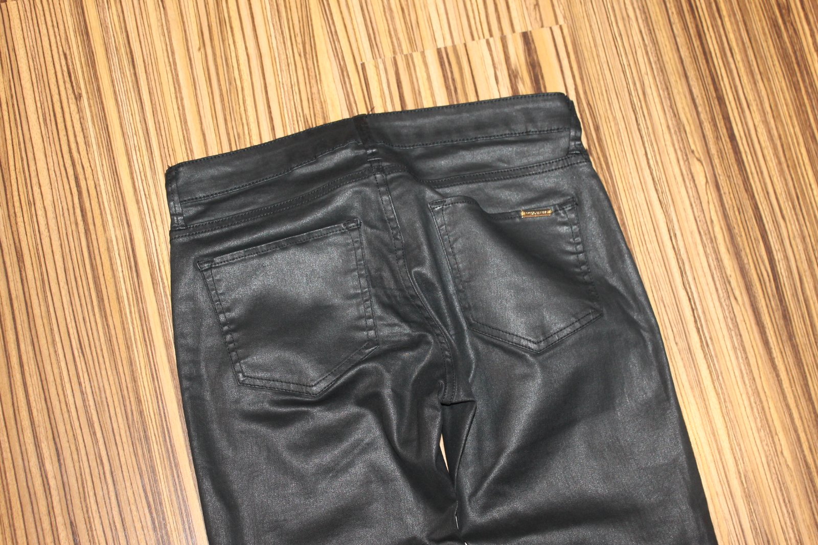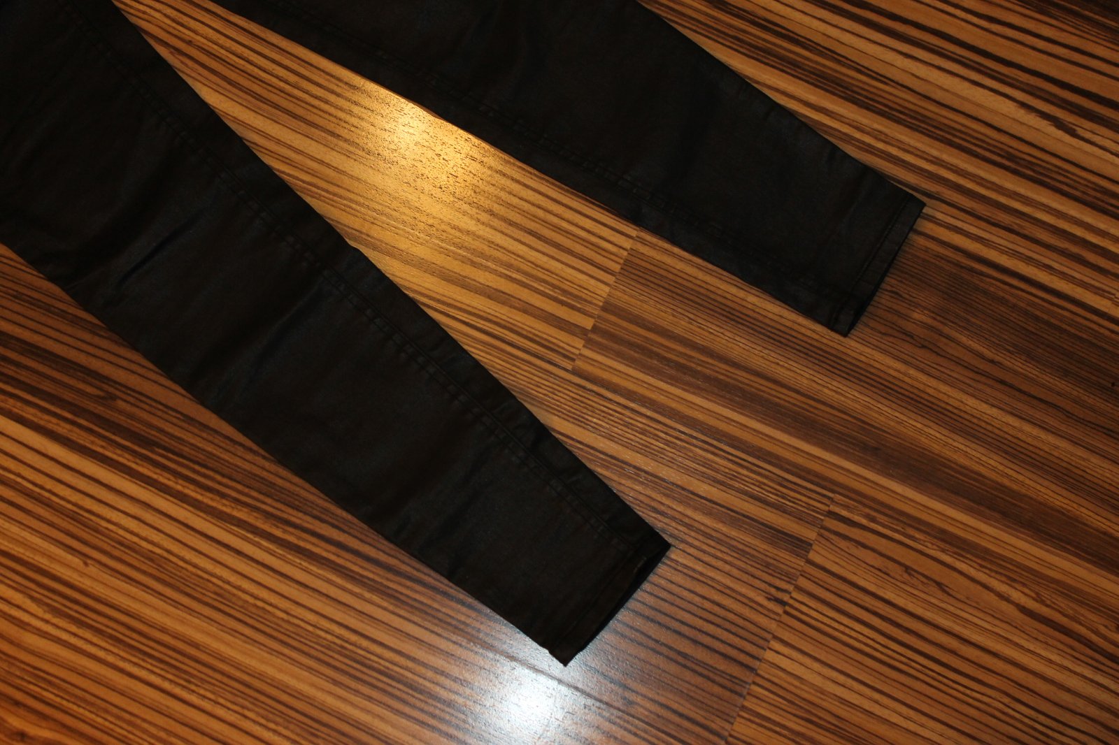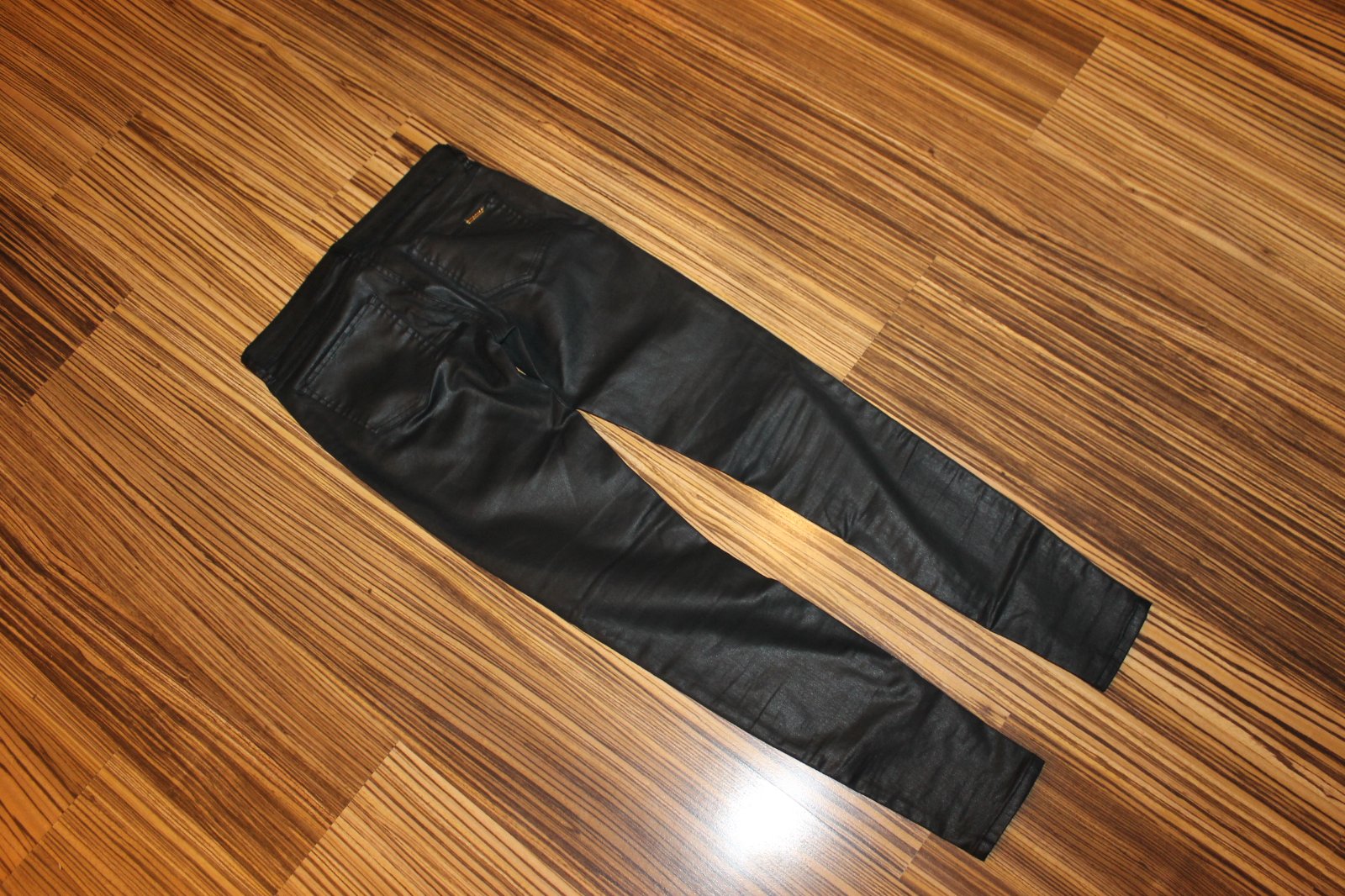 Málo nosené, ako nové, bez poškodení. Pogumovaný koženkový vzhľad, elastické. Veľ. 36, RO: pás 2x 36-49 cm, stehno 2x 24-28 cm, boky cca 2 x 46 cm, celk. dl. 94/75 cm vnútorná dĺžka, šírka dole 2x 11 cm. Váha 327 g.
