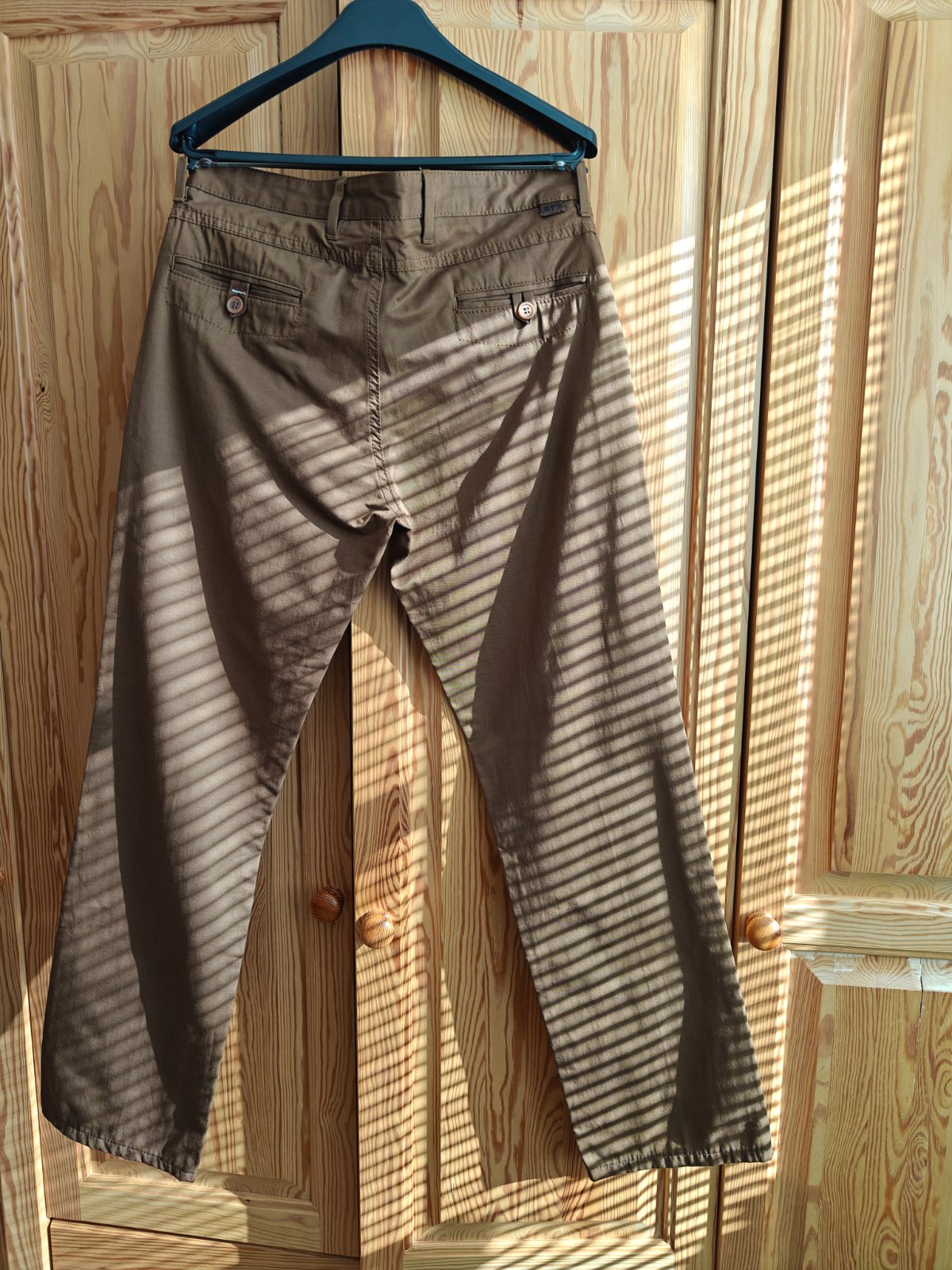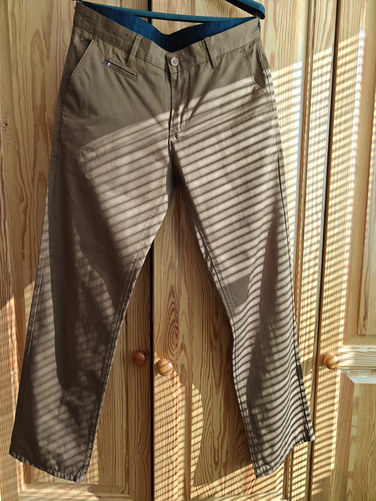 Nohavice vo vynikajúcom stave. Nosené iba príležitostne. Zloženie: 95 % bavlna, 5 % elastan. Tenké a príjemné. Skôr na jar, leto a jeseň. Synove obľúbené. Veľkosť uvádzaná 30. Ale radšej premerajte. Rozmery: pás cca. 2 x 40 cm, dĺžka vonkajšia 96 cm, dĺžka vnútorná 73 cm. Reálna farba ako na prvej a druhej foto.