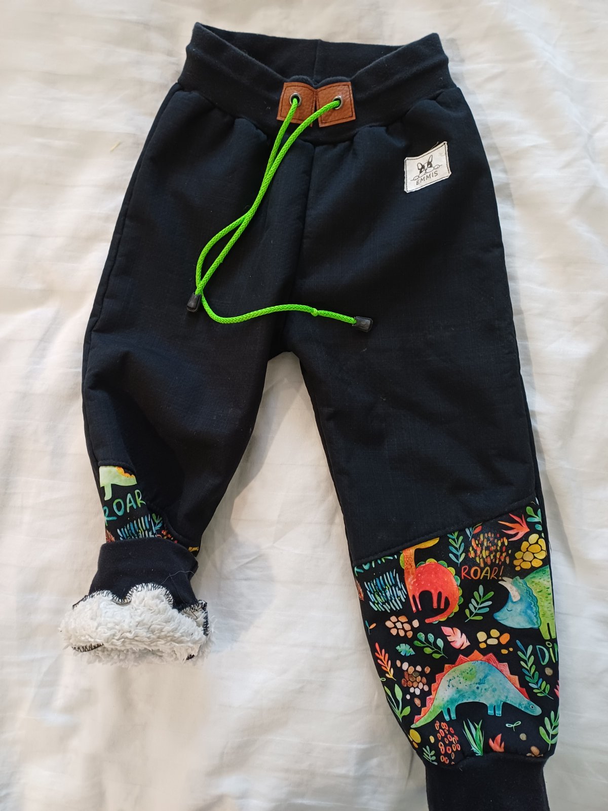 Softshelove nohavice zateplene barančekom, čierna farba a vzor dinosaurov. Šité pod značkou Emmis. Môžem premerať pri záujme.