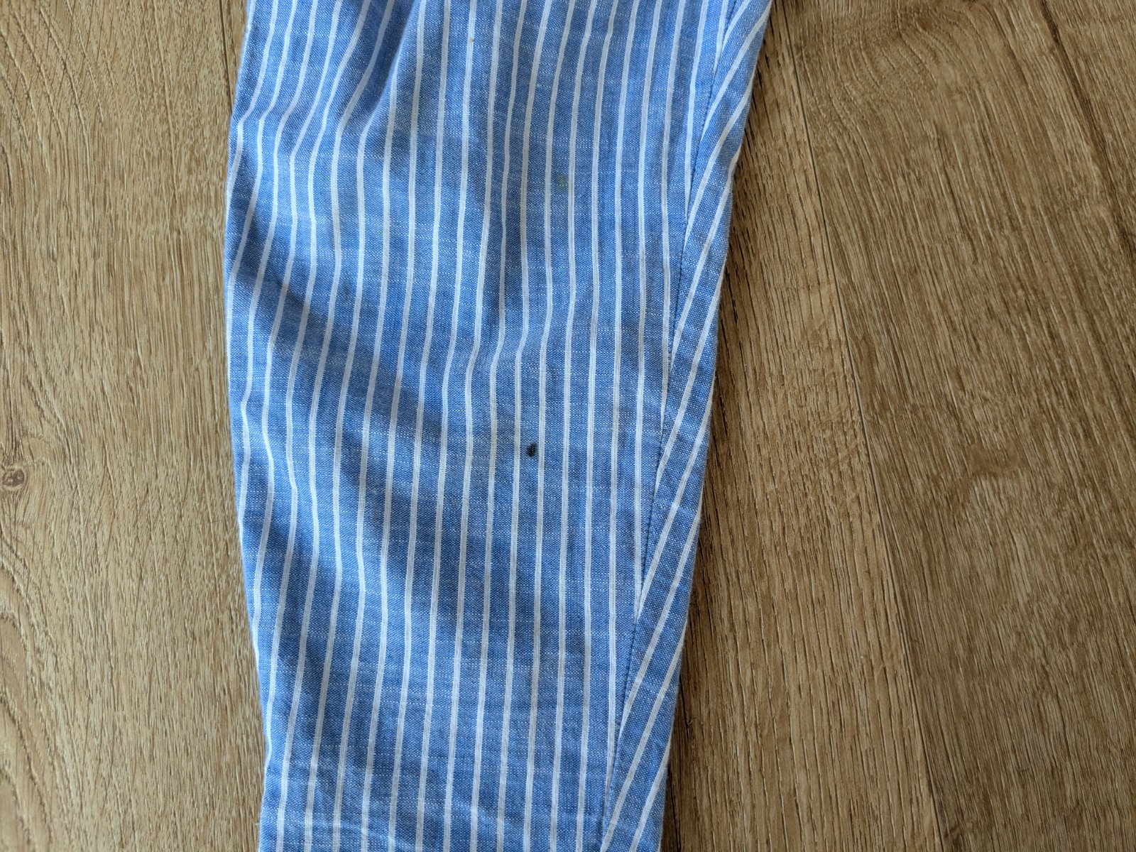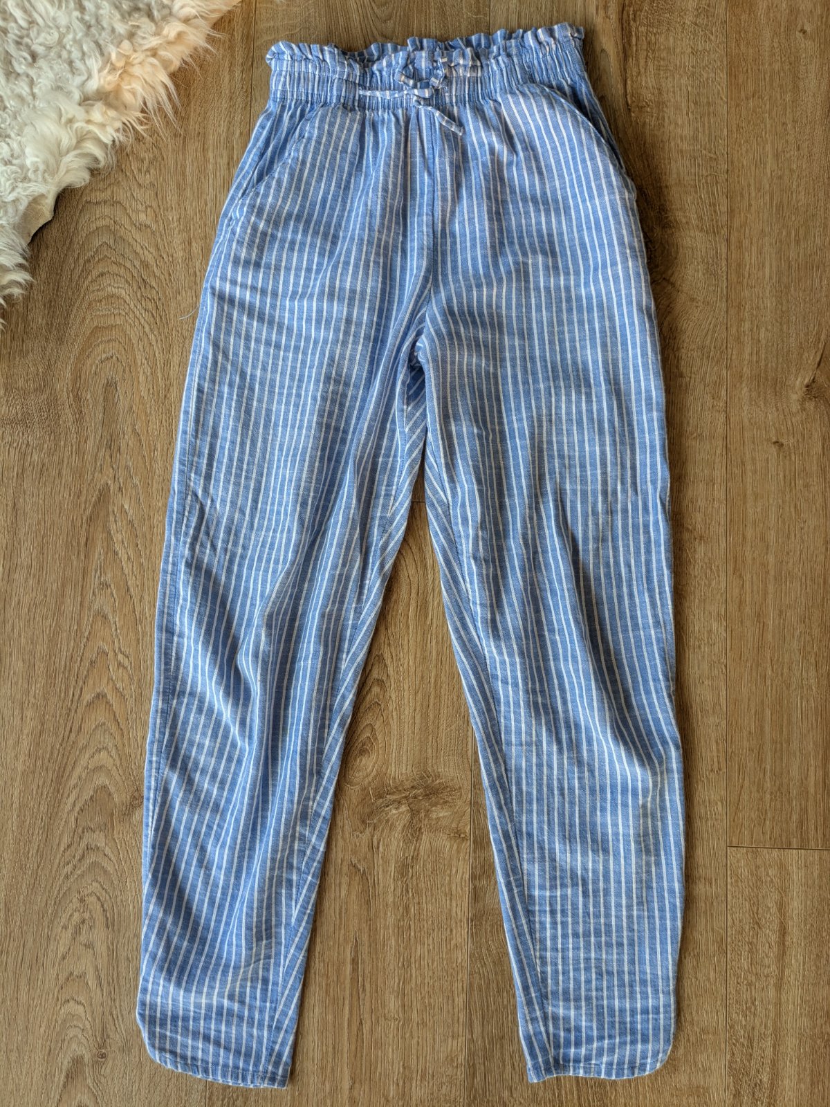 Ľahké letné bavlnené nohavice, v páse gumka, dve vrecká. Dobrý stav, akurát na jednom mieste v spodnej časti je bodka (viď foto), inak sú OK.
