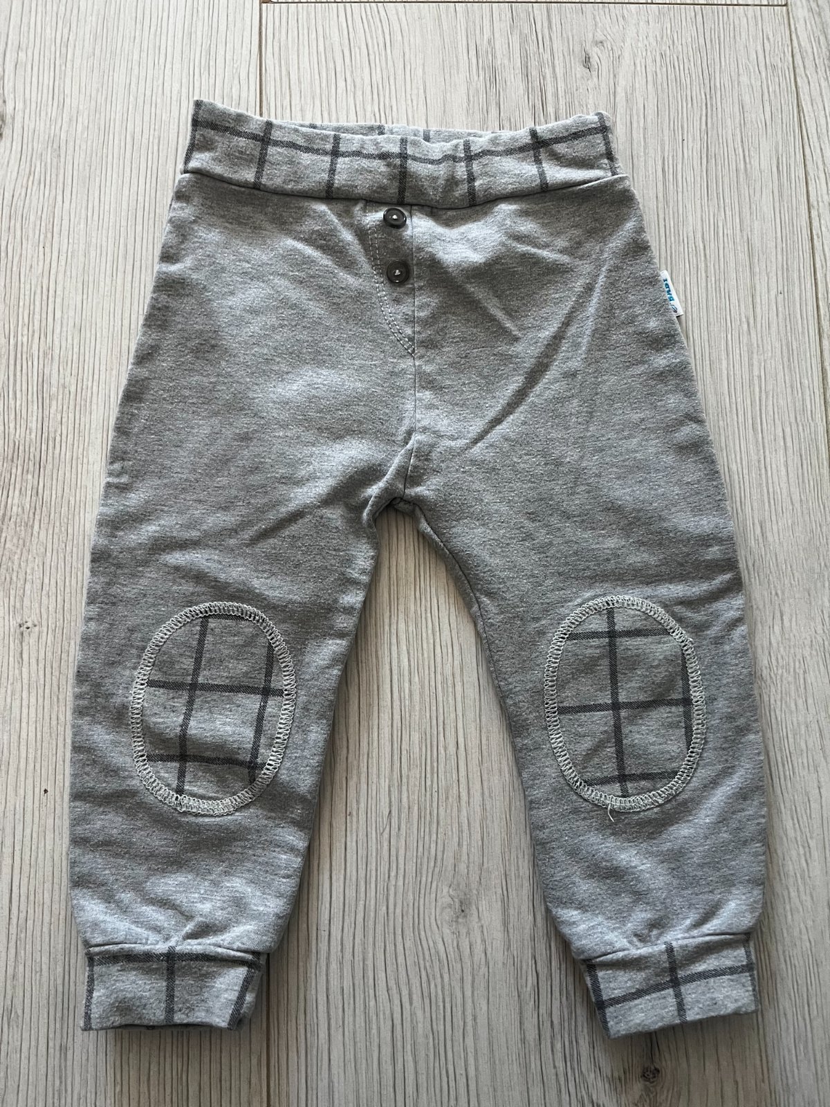 Predám sivé teplákové nohavice s nášivkami na kolenách značky NEW BABY, veľkosť: 92