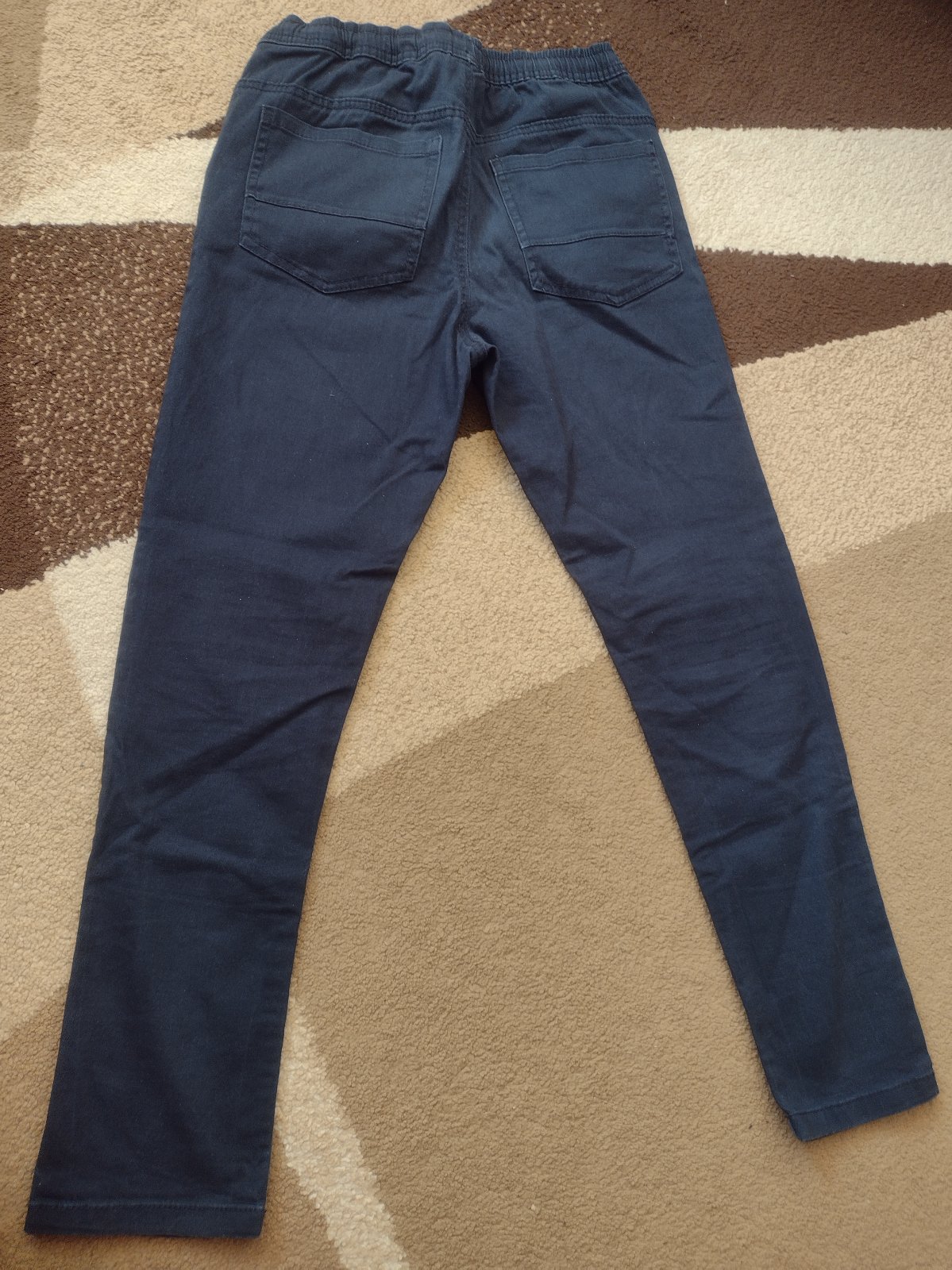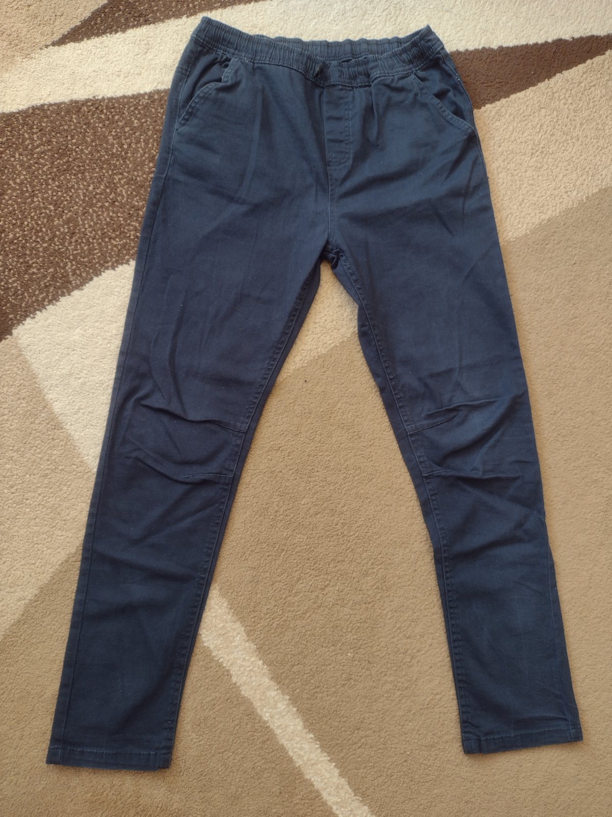 Modré tenšie nohavice. Výborne sa nosia. V páse na gumu. Bez poškodenia. Dĺžka 94 cm. Šírka v páse 35 cm v kľude.