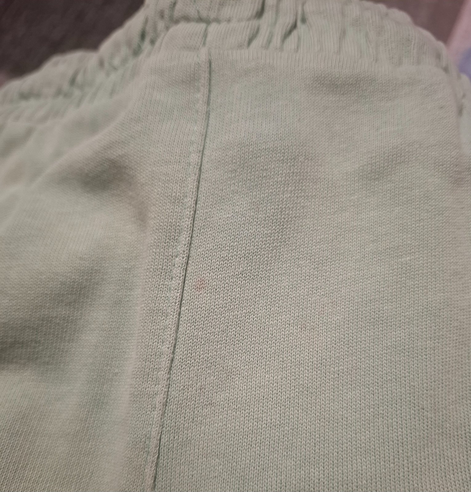 Na zadnej strane teplákov - na páse trošku vypáraný šev (ďalej sa nepára, šikovná mamička zašije) a mini fliačik (bodka) o niečo nižšie na zadočku