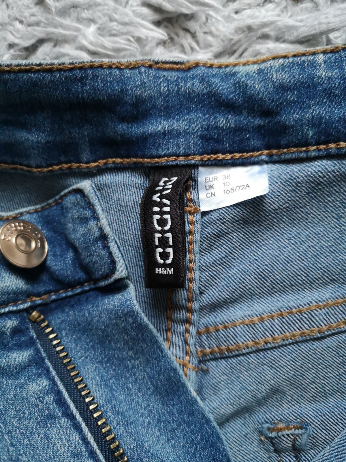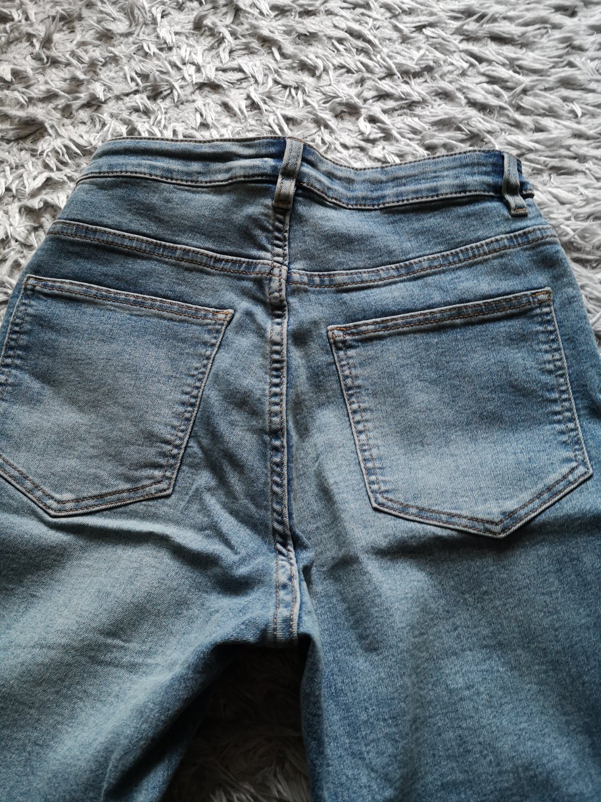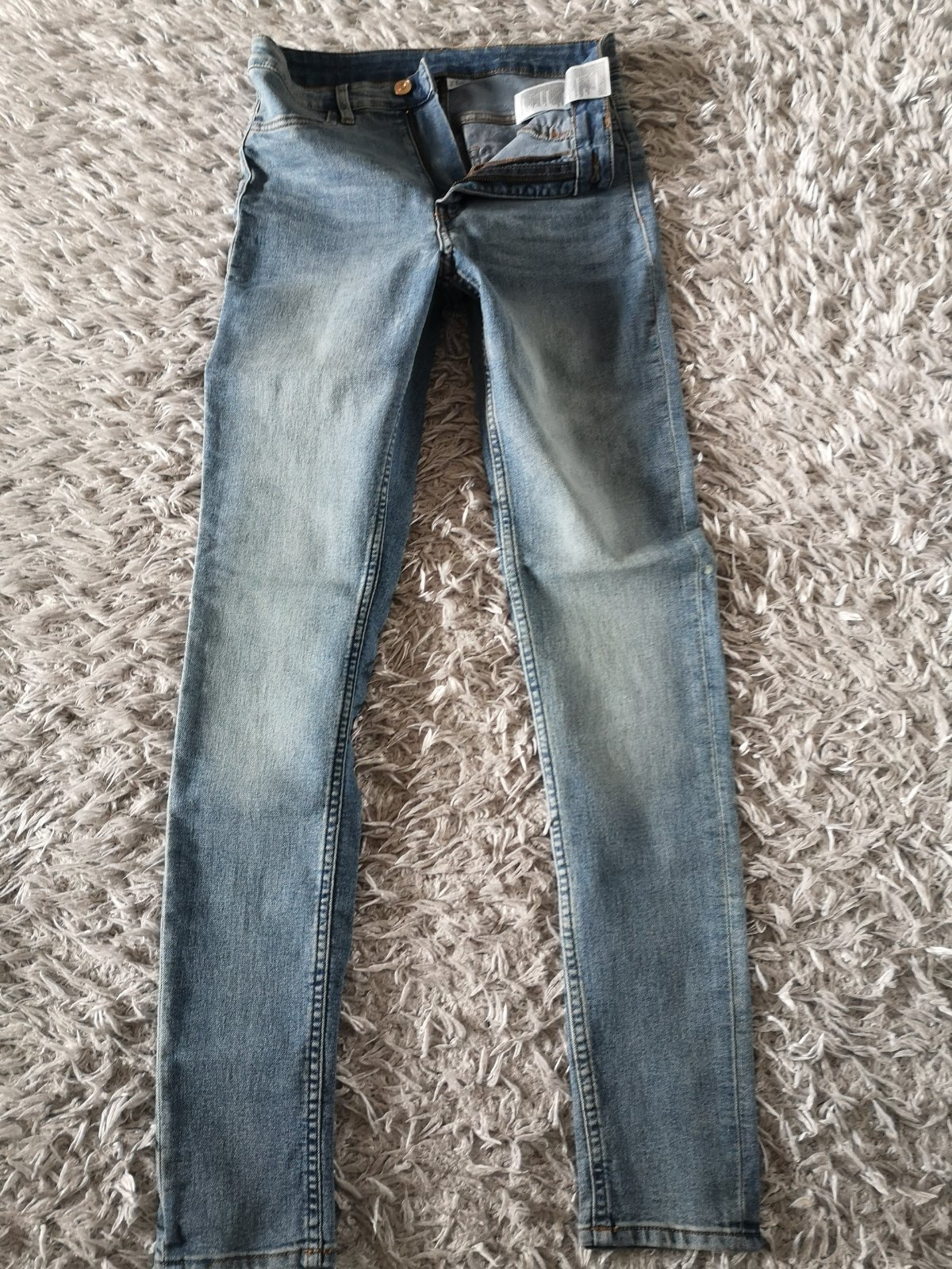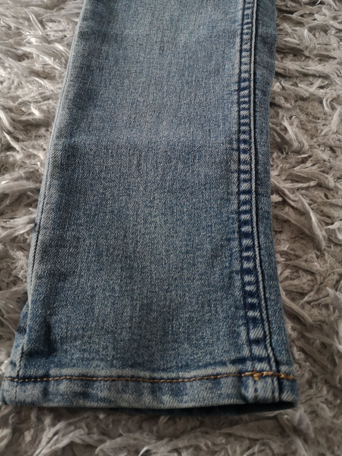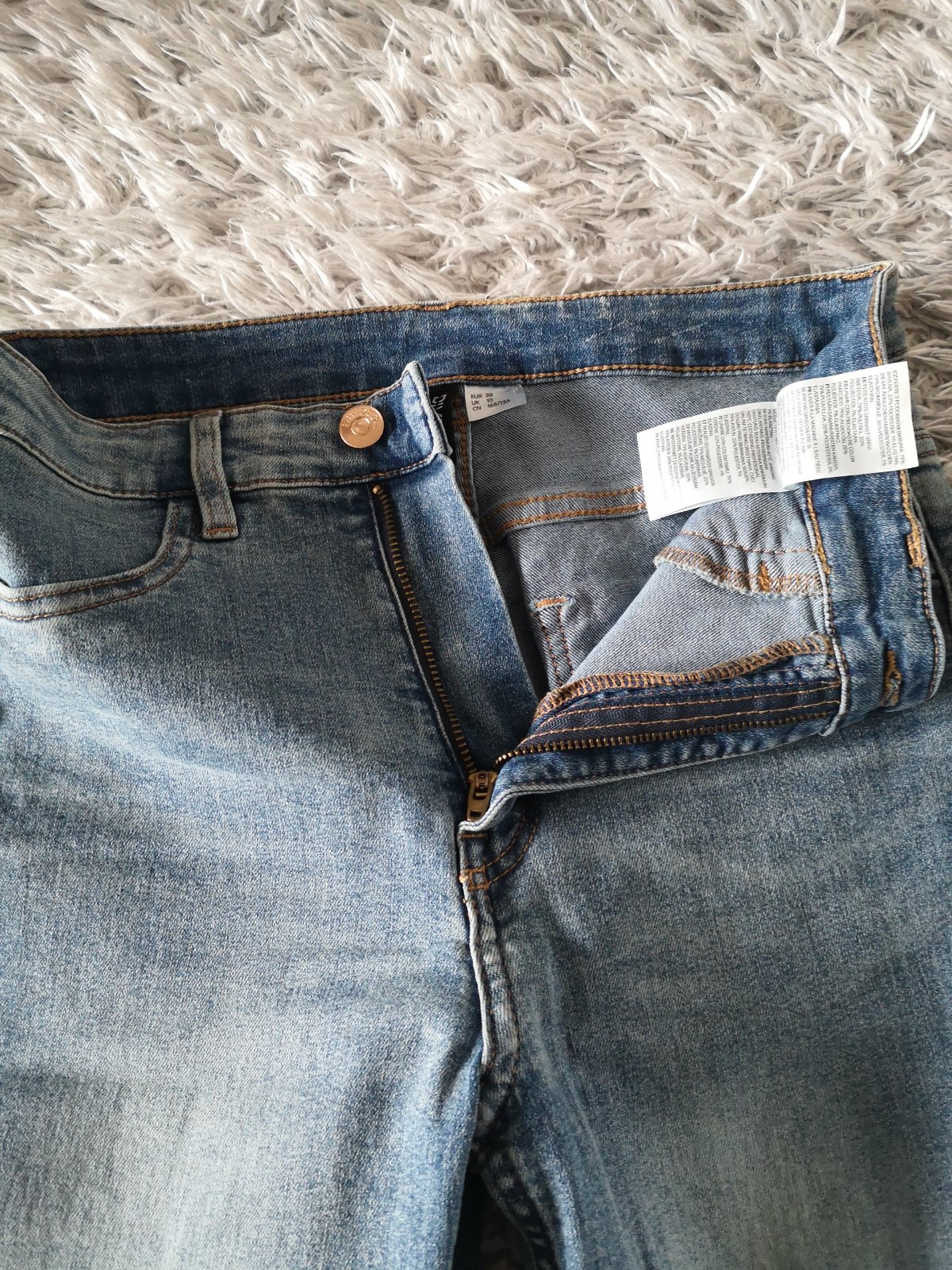 Džínsy mimoriadne priliehavého strihu z mimoriadne pružnej pranej texaskoviny s vysokým pásom, zapínaním na zips a gombík, s falošnými vreckami vpredu a skutočnými vreckami vzadu.