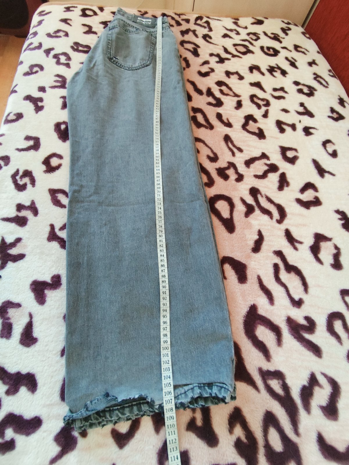 Nenosené denin rifle veľkosť M. Rozmery:pas-2x37cm,boky-2x 43cm a dĺžka 97cn.su elastické. Ešte povolia. Kupované v takku