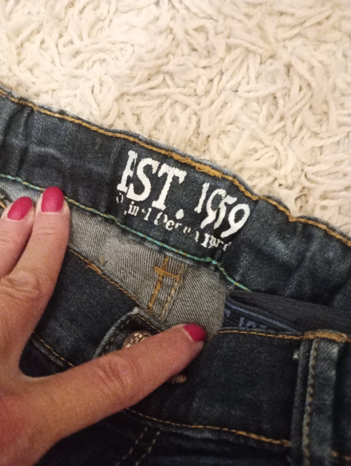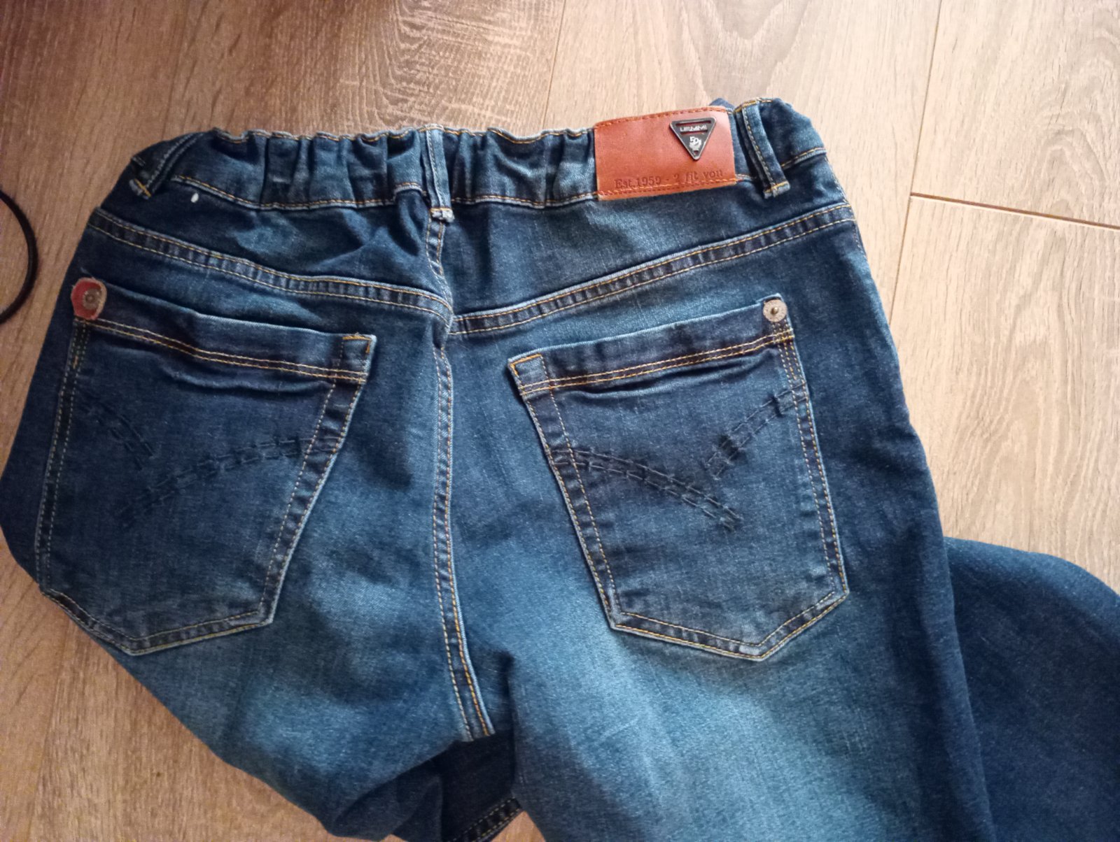Rifle sú bez chyby, pekná tmavomodrá farba, uvedené 152, ale určite zodpovedajú 158. Trošku povytiahnuté gumičky, ale je to len estetická vada. Rifle viete na pase regulovať