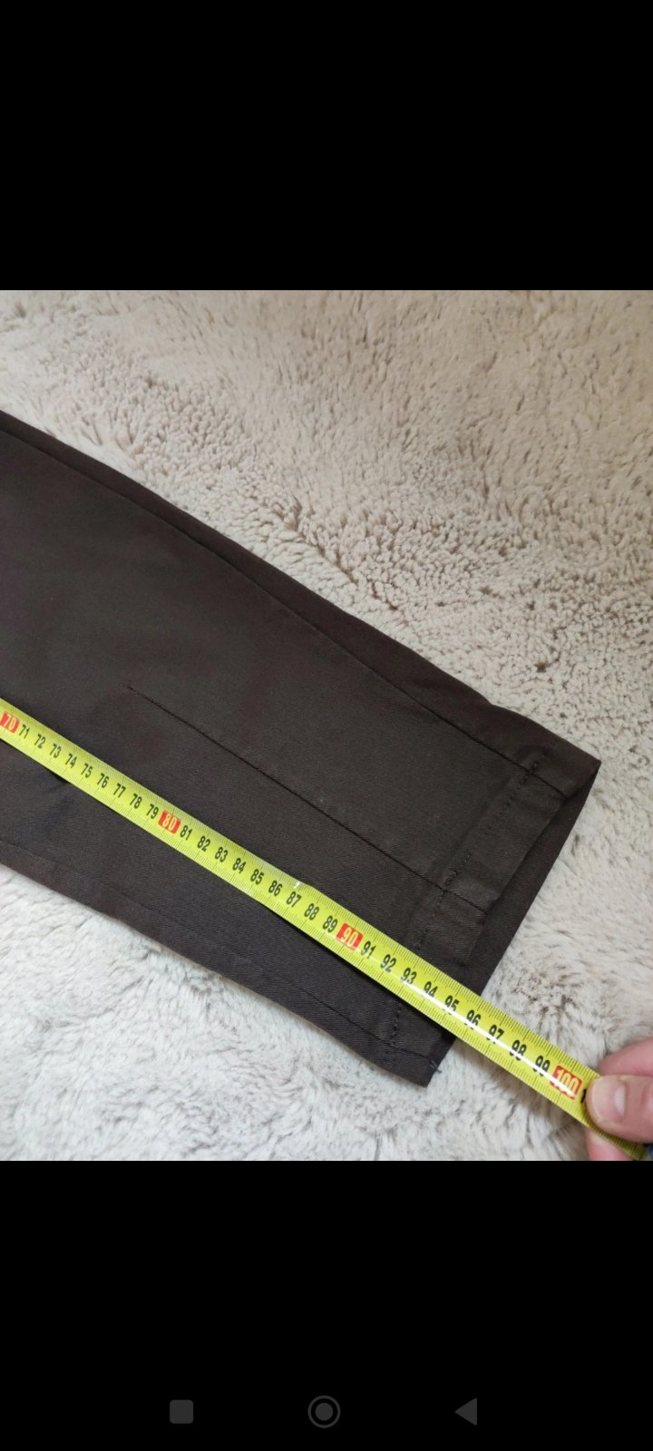 Nohavice menčester, pás na gumičku a funkčnú šnúrku, 2 bočné vrecká, ozdobené striebornými gombíkmi. Pás v kľude 2x36 cm, pustí 2x55 cm, boky 2x53 cm, dĺžka 99 cm, dajú sa vyhrnúť . Boli raz oblečené
