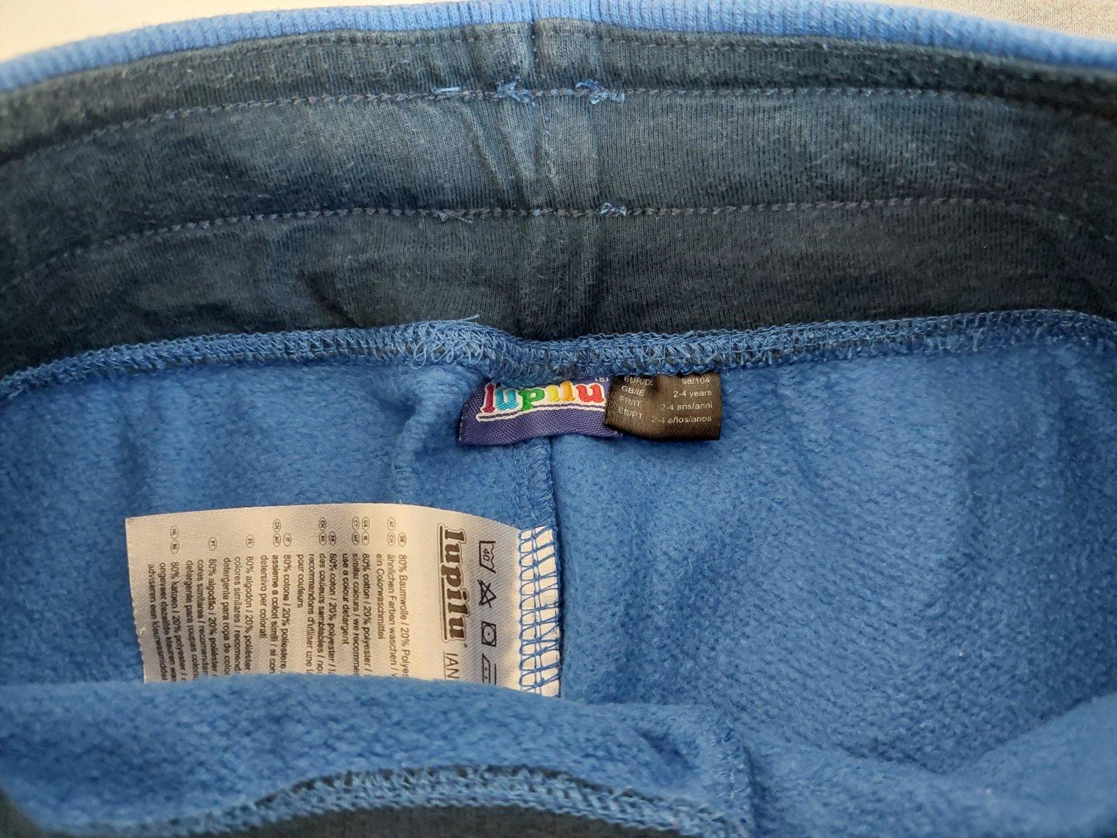 Tepláky zn. lupilu, veľkosť 98/104 (2-4 roky). Modré ešte v pohode do škôlky a sivé v prípade záujmu pribalím (tie už majú vyšúchané kolienka-zatiaľ bez dierok)