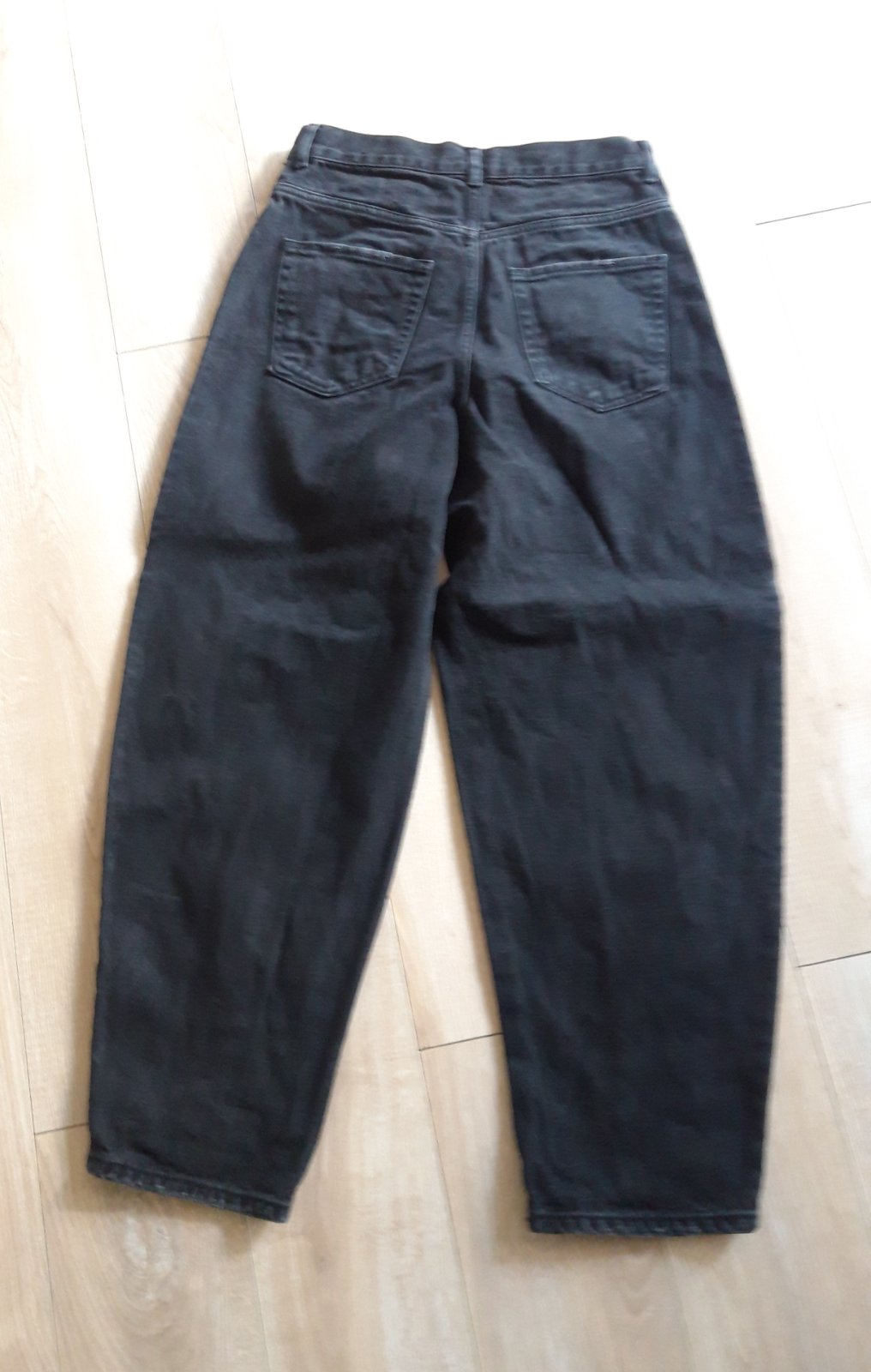 Výborný stav,riflové, vysoký pás,dole gumičky, pás je gumickovy vzadu, sýto čierne, veľkosť 36, pás 34-42 x 2 cm,d.96 cm, Vnútorná d.67 cm,sedy 30/40 cm