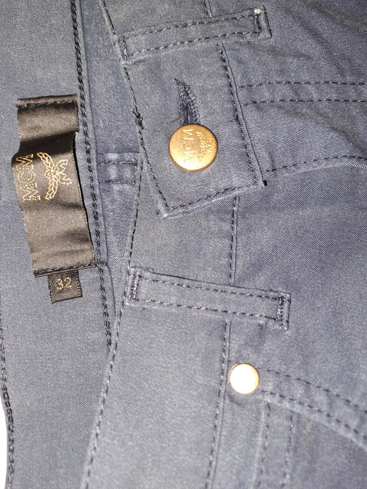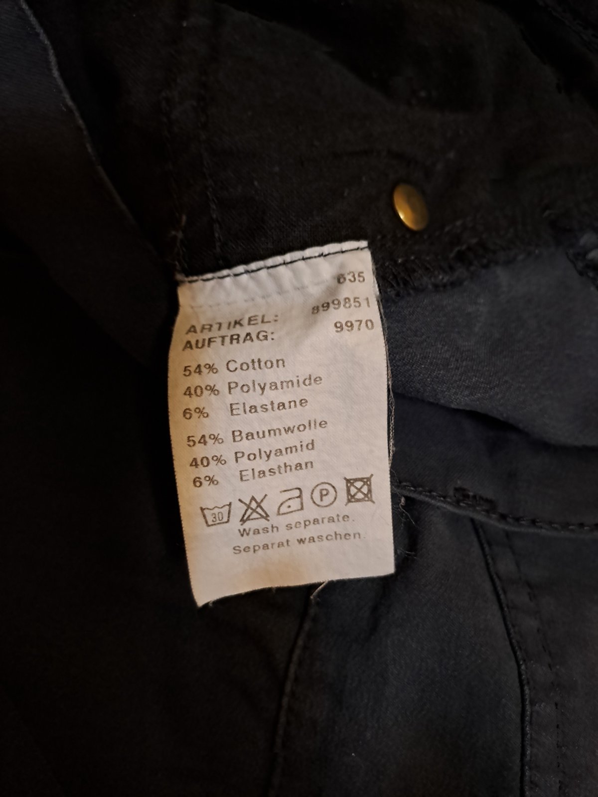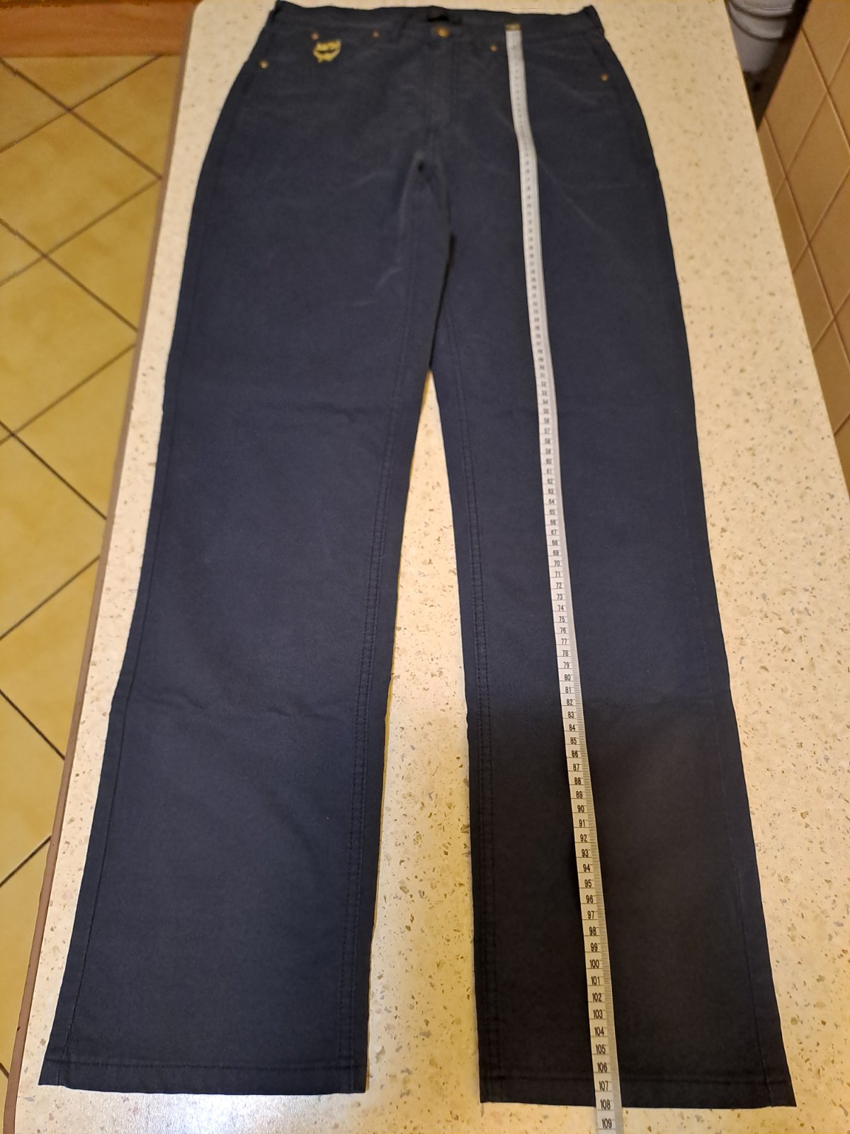 Tmavomodré nohavice. Veľmi zachovalé. Dobrý materiál: bavlna, polyamid, elastan. Príjemné na nosenie. Veľkosť cca 38, píše 32. Pás: 2x38-41 cm, elastický pás. Dĺžka 108 cm.