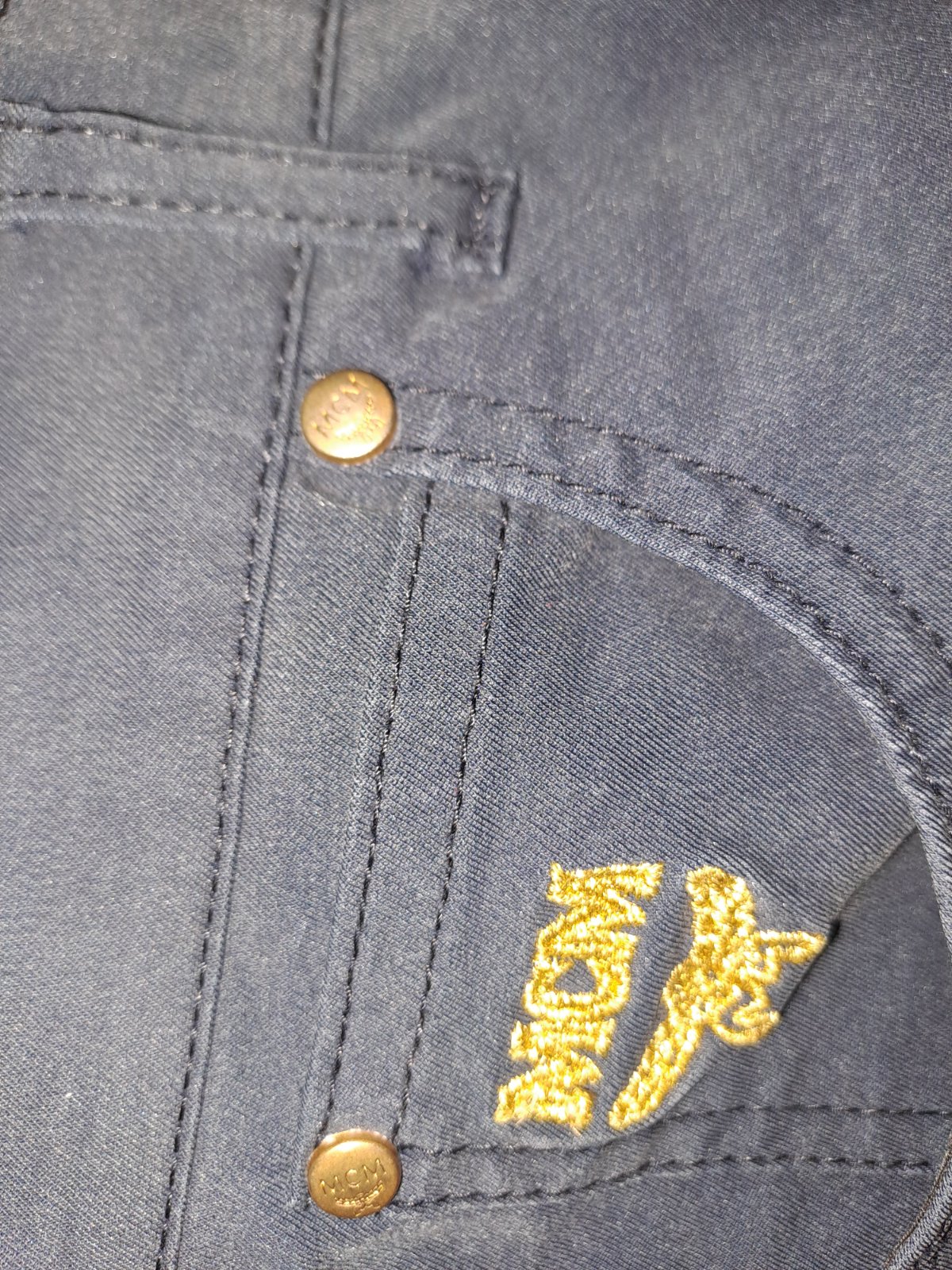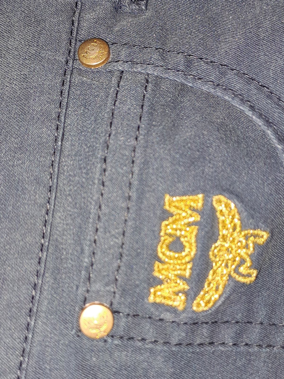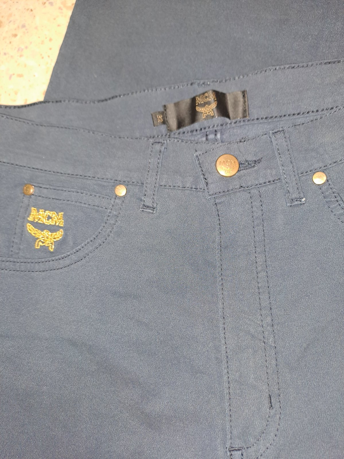 Tmavomodré nohavice. Veľmi zachovalé. Dobrý materiál: bavlna, polyamid, elastan. Príjemné na nosenie. Veľkosť cca 38, píše 32. Pás: 2x38-41 cm, elastický pás. Dĺžka 108 cm.