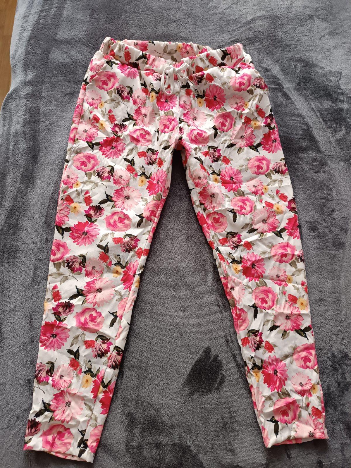Predám asi 1x vzaté kvetované nohavice ("pokrčené"). V. Uni (odporúčam ale od L/XL - na menšie veľkosti by boli veľmi voľné). V páse sťahovanie šnúrkou, majú bočné vrecká.