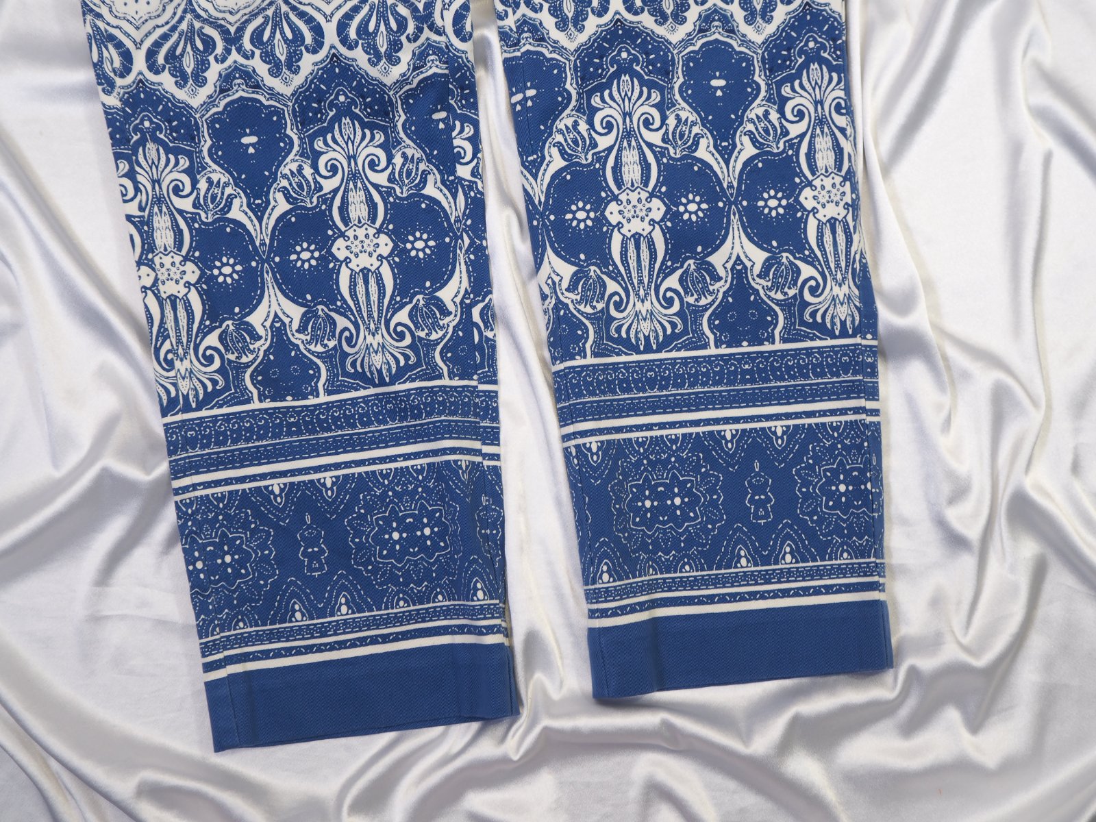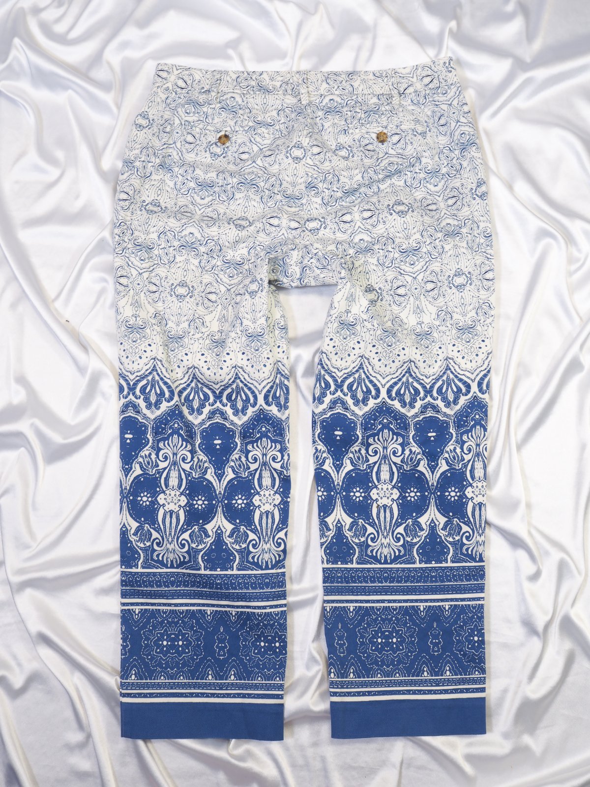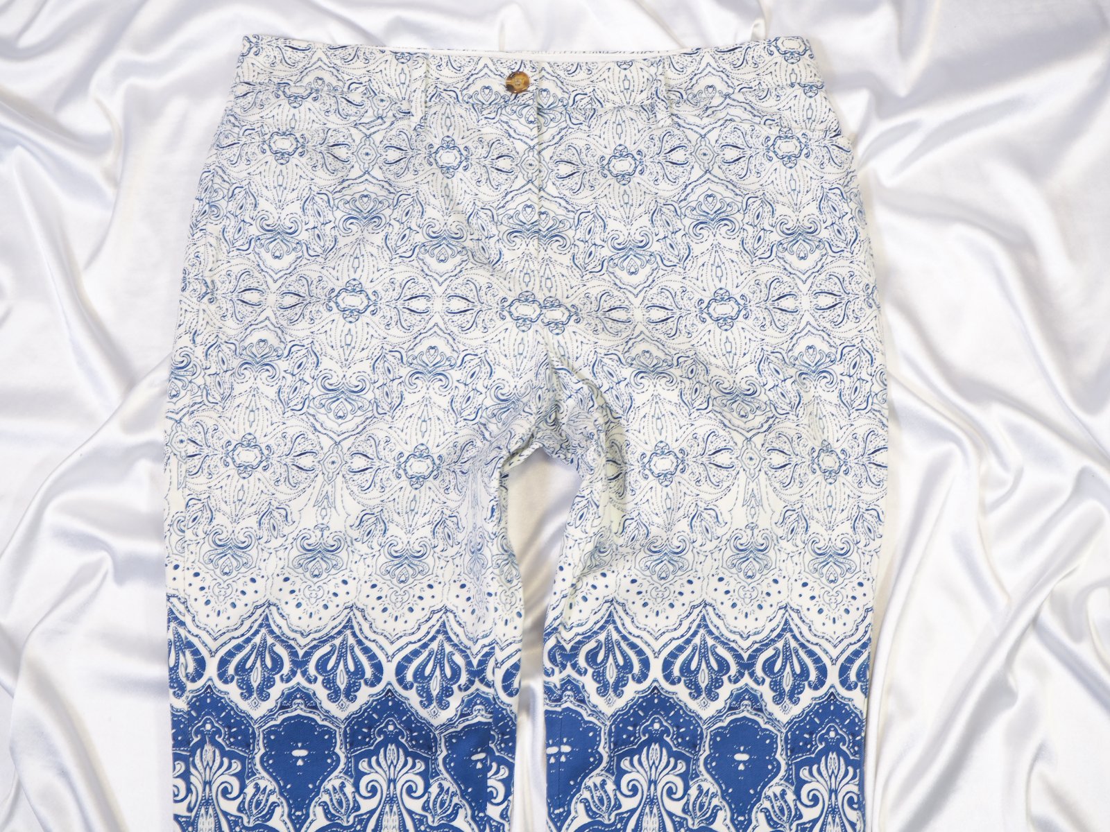 Kvalitné letné nohavice, vzorované bielo- modré, materiál 98% bavlna, 2 % elastan, sú také 7/8, super stav.