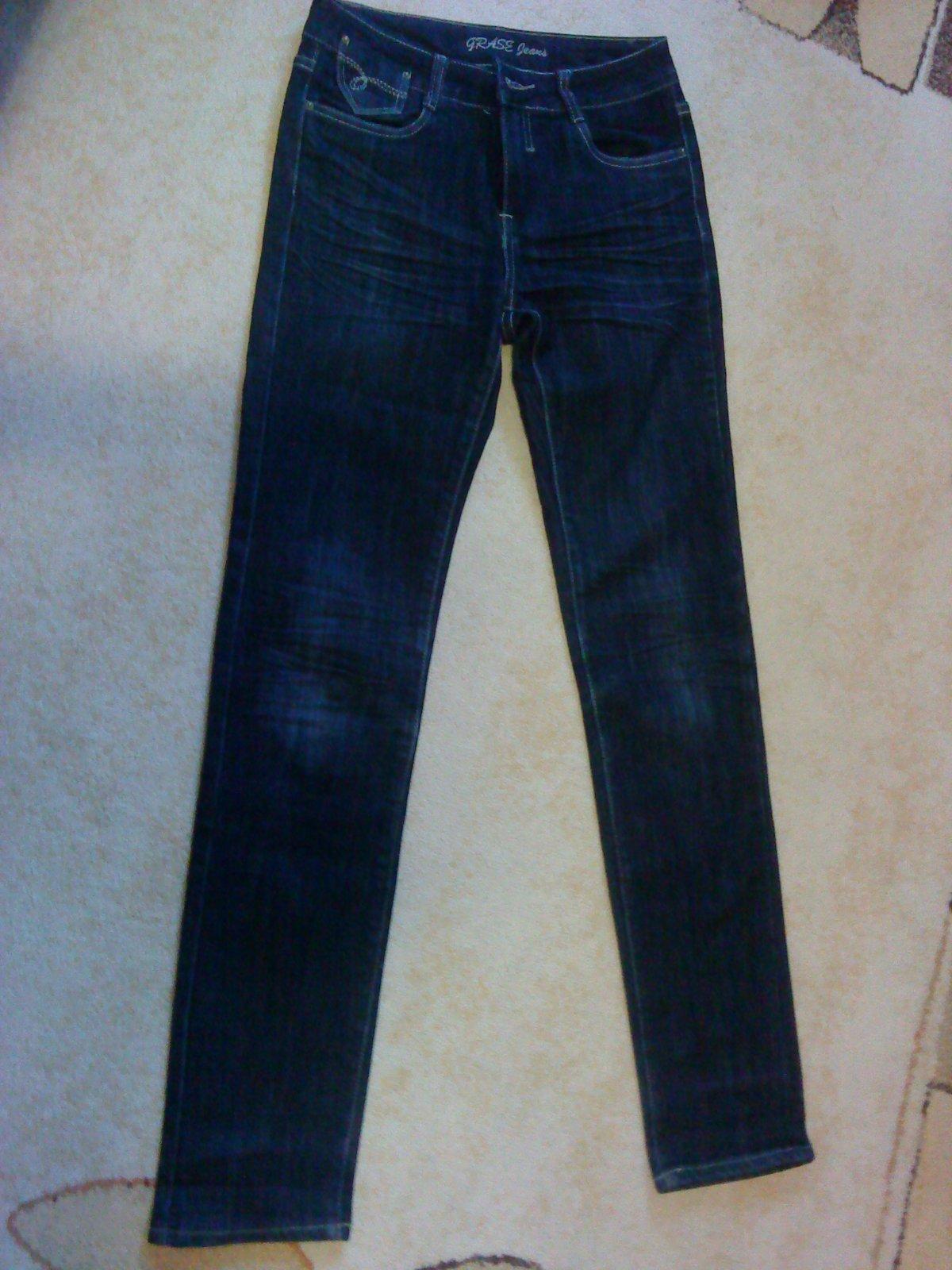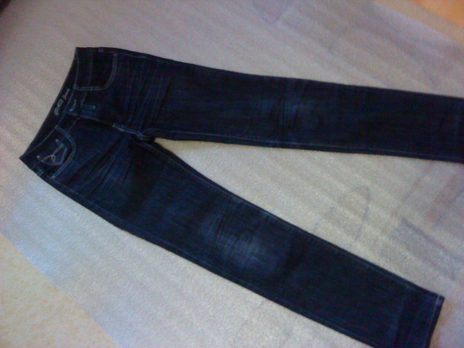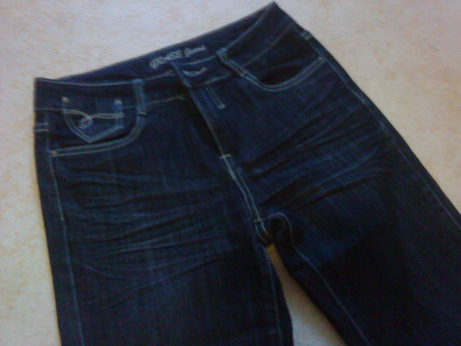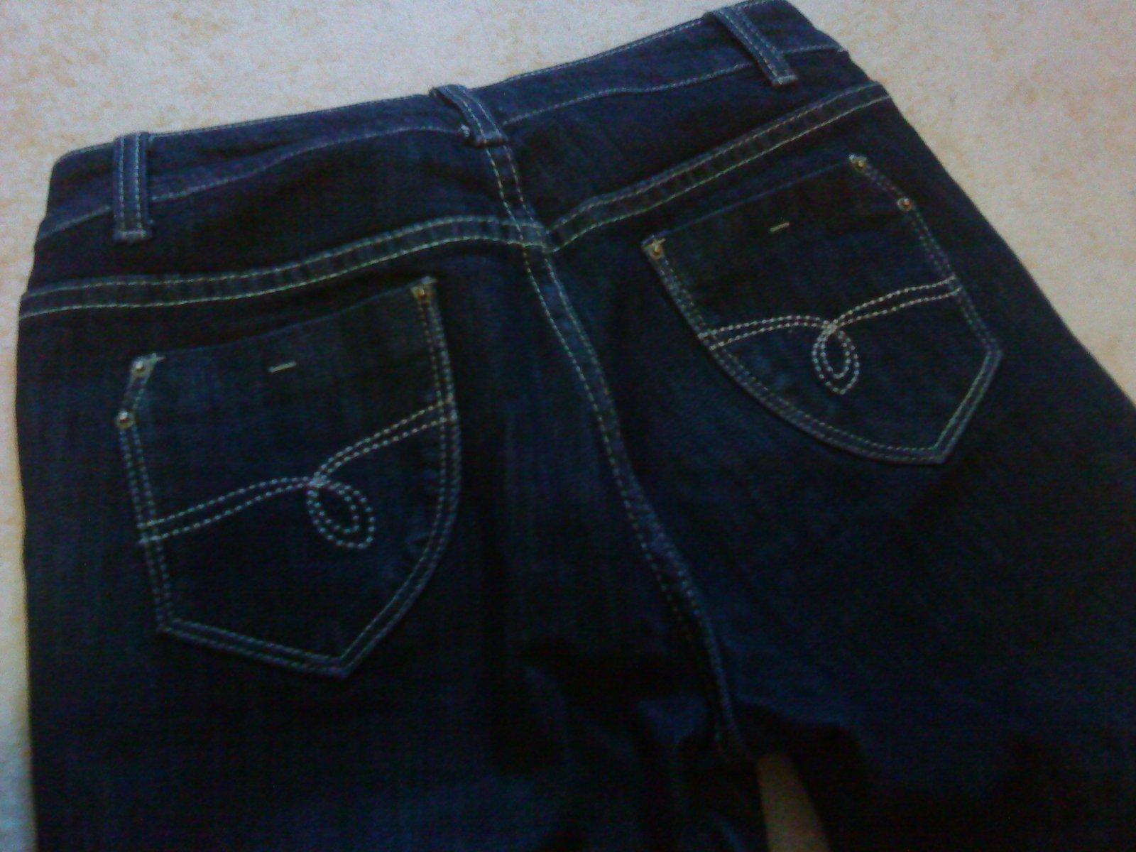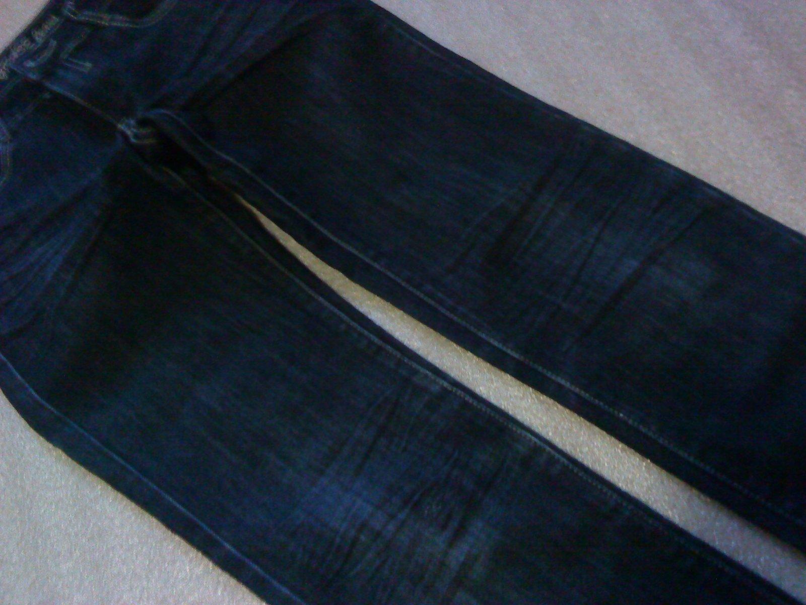 kupované v značkovom, málo nosené velk. 38, na kolene -pravom, záplata asi 2 x2cm , nie je to moc vidieť, hoci som sa to snažila nafotiť, je to kvalitne zamaskované,okrem toho nemajú žiadne poškodenie ani ošúchanie, boli nosené asi 6 krát, pás 36 *2, natiahne sa na 40 *2.Bočná dlžka 104cm.Predný sed 24 cm, zadný sed 35cm