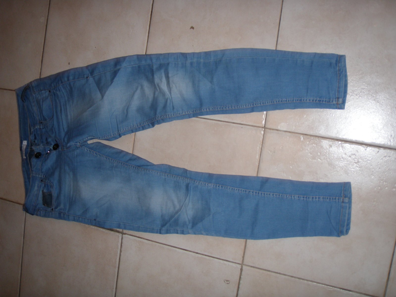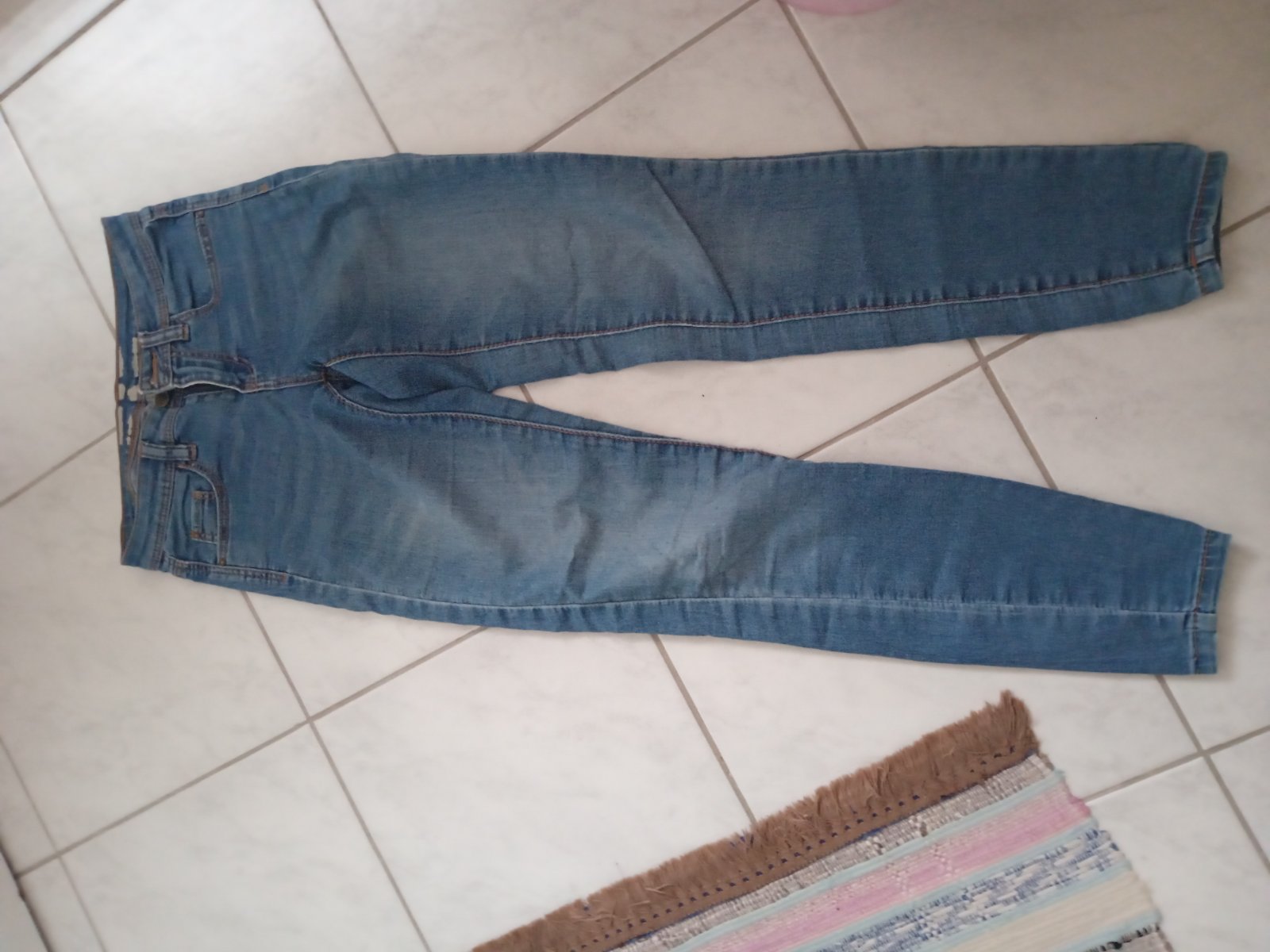 Naživo odost krajšia farba, skôr svetlomodrá Super stav, elasticke po celej dĺžke aj v pase , príjemná riflovina Dĺžka 96cm, šírka pasu 38cm, šírka bokov 46cm