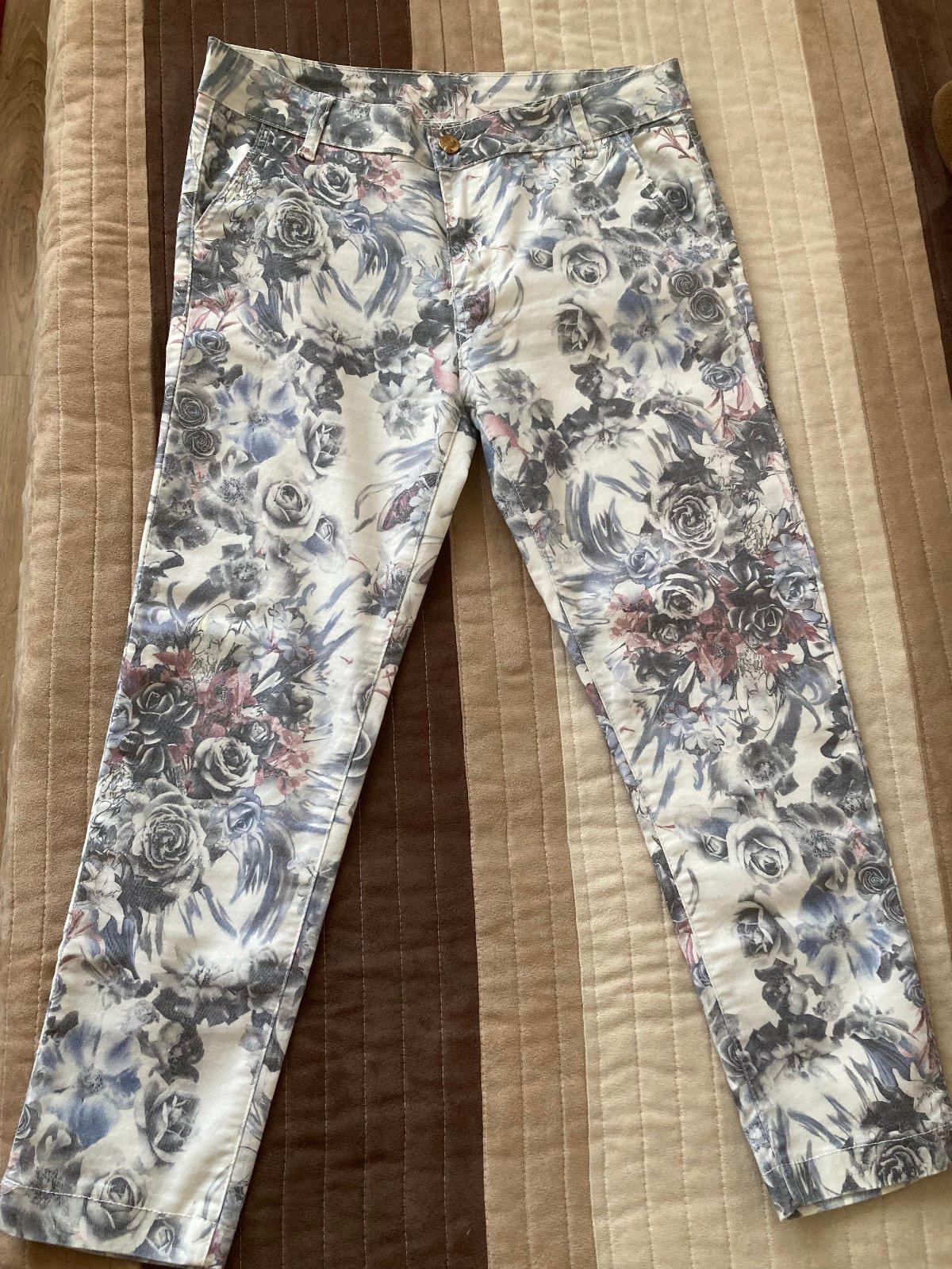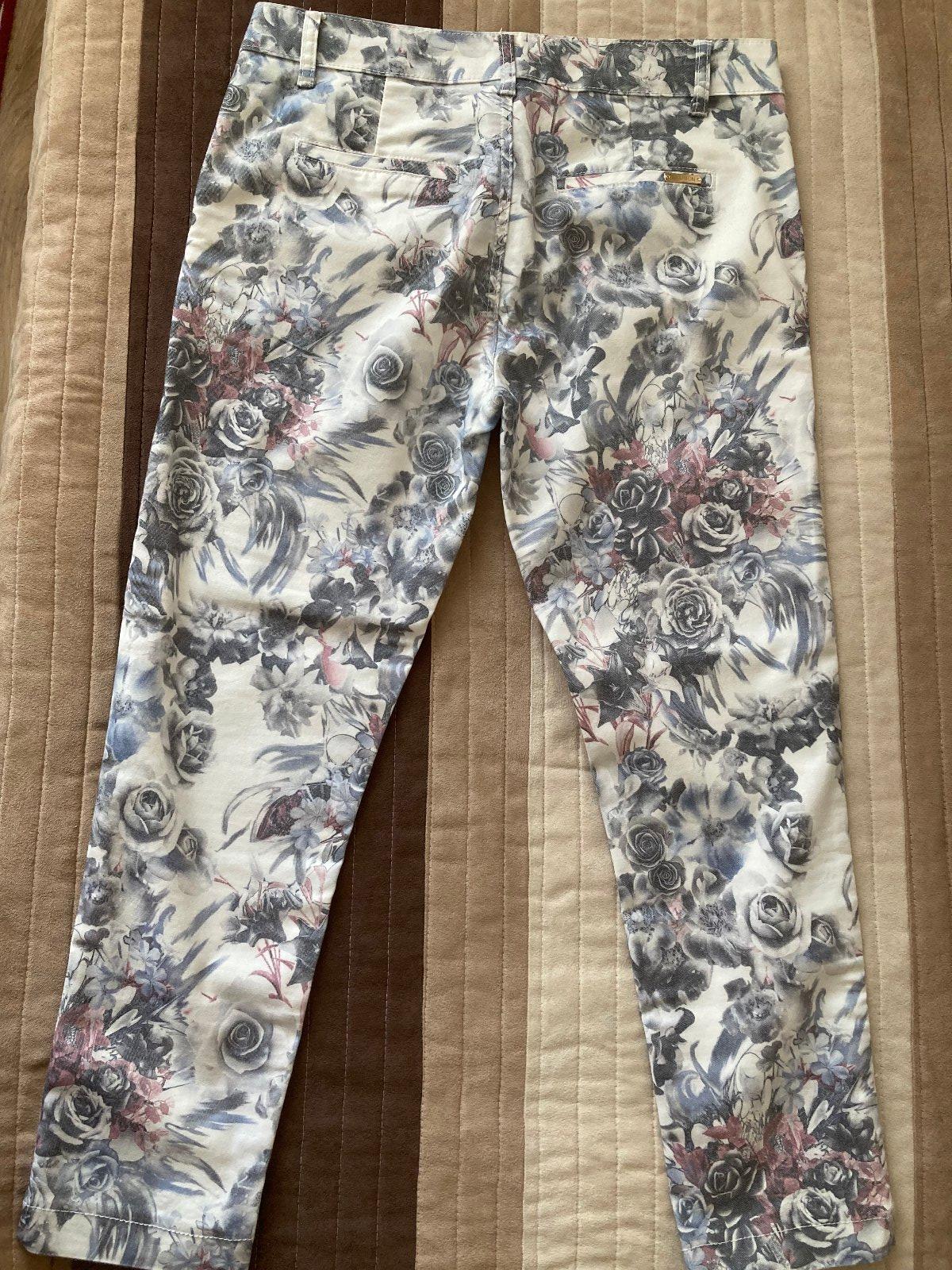Nové biele nohavice vzorované, strecovy materiál, rovny strih. Velmi príjemný material. Dĺžka 107cm, pás 38cm. Velkost na štítku EUR 36, podľa mna je to skôr 38. Na S-kovej postave budu asi voľnejš...