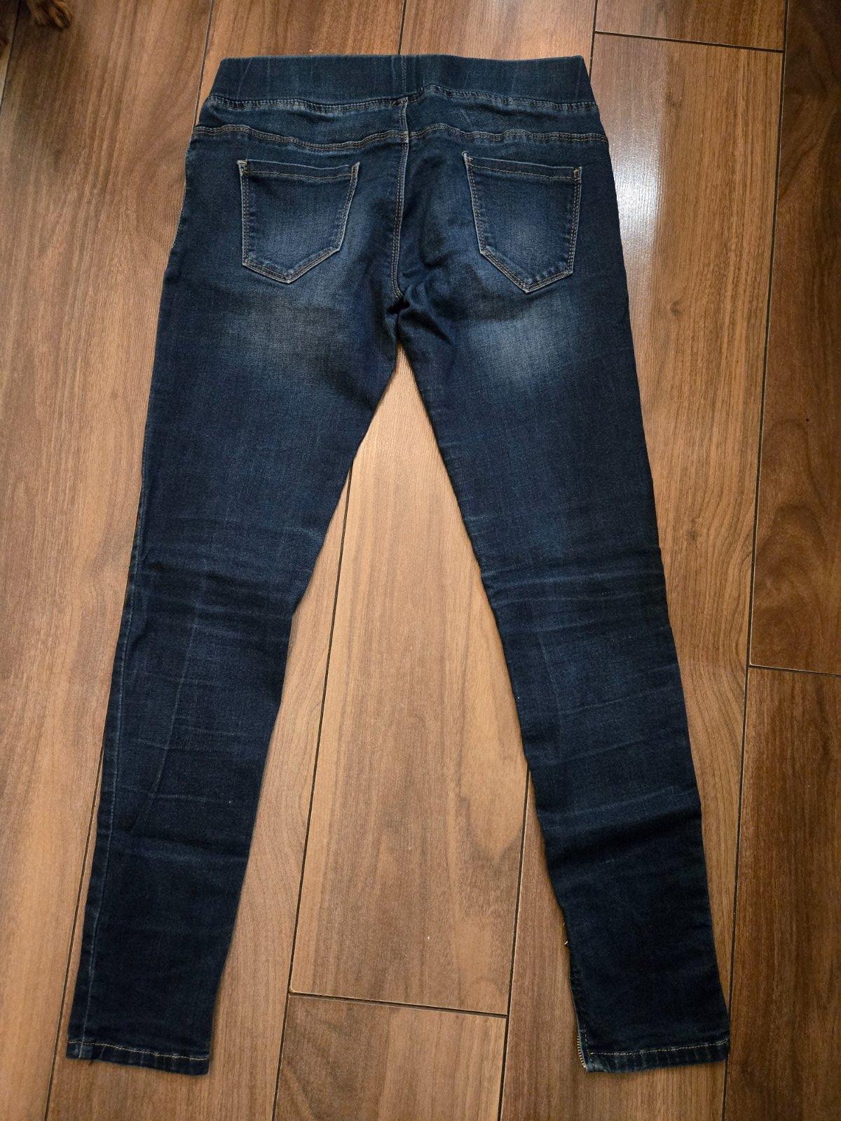 Tm. modre potrhane rifle, v dobrom nosenom stave, bl. modre kombinovane so sedou trickovinou, skor 7/8velkost.Cena spolu.