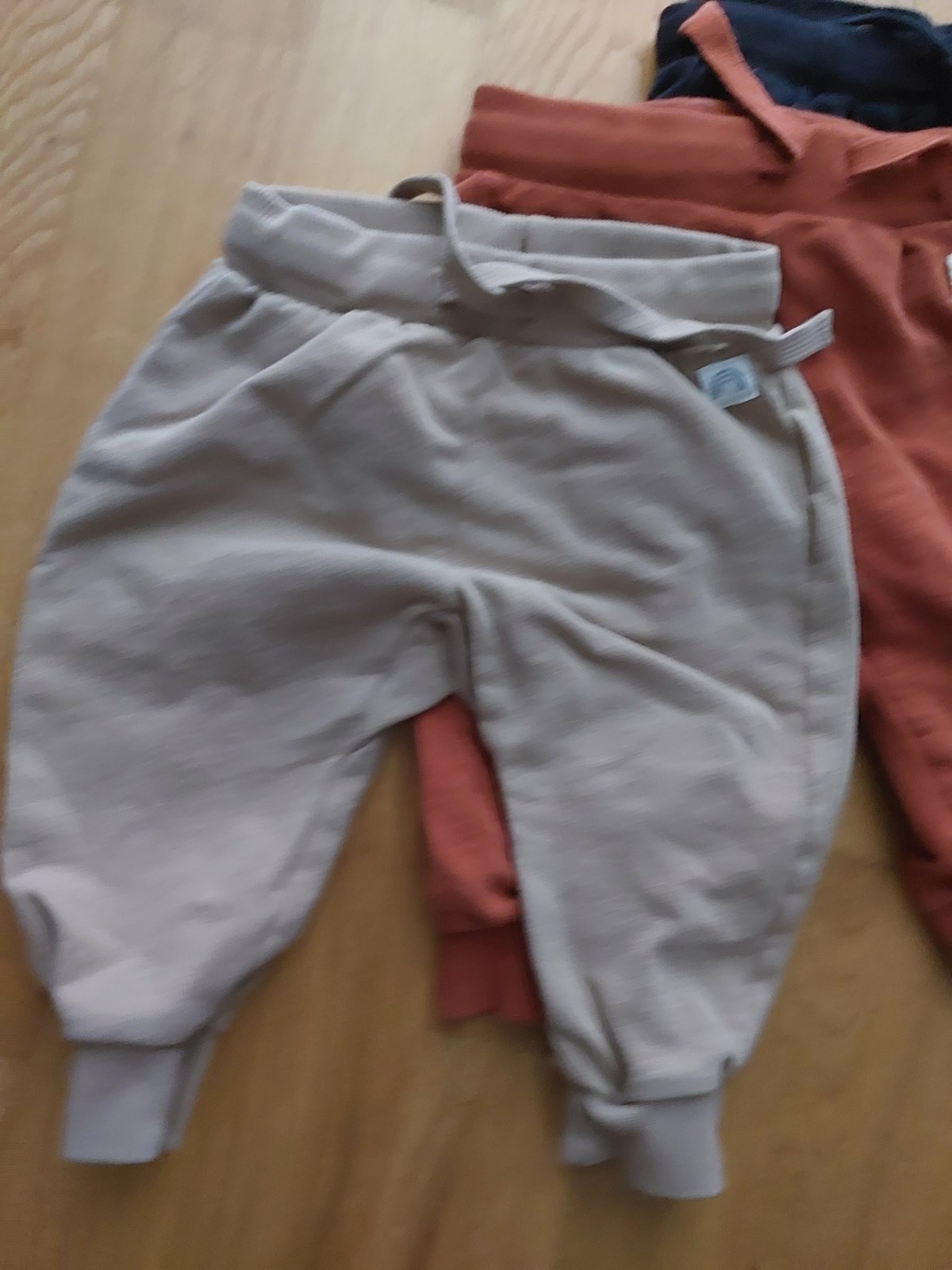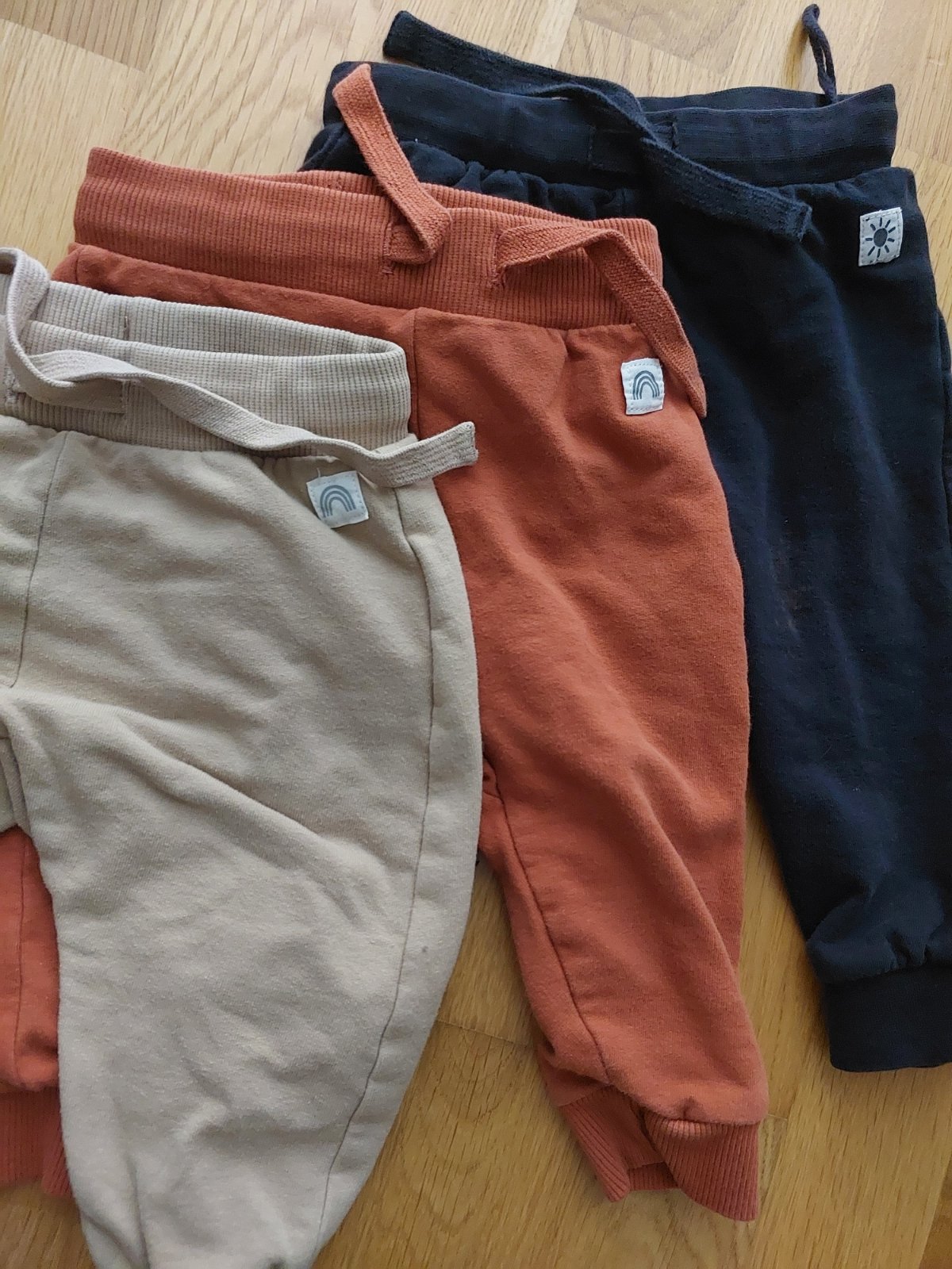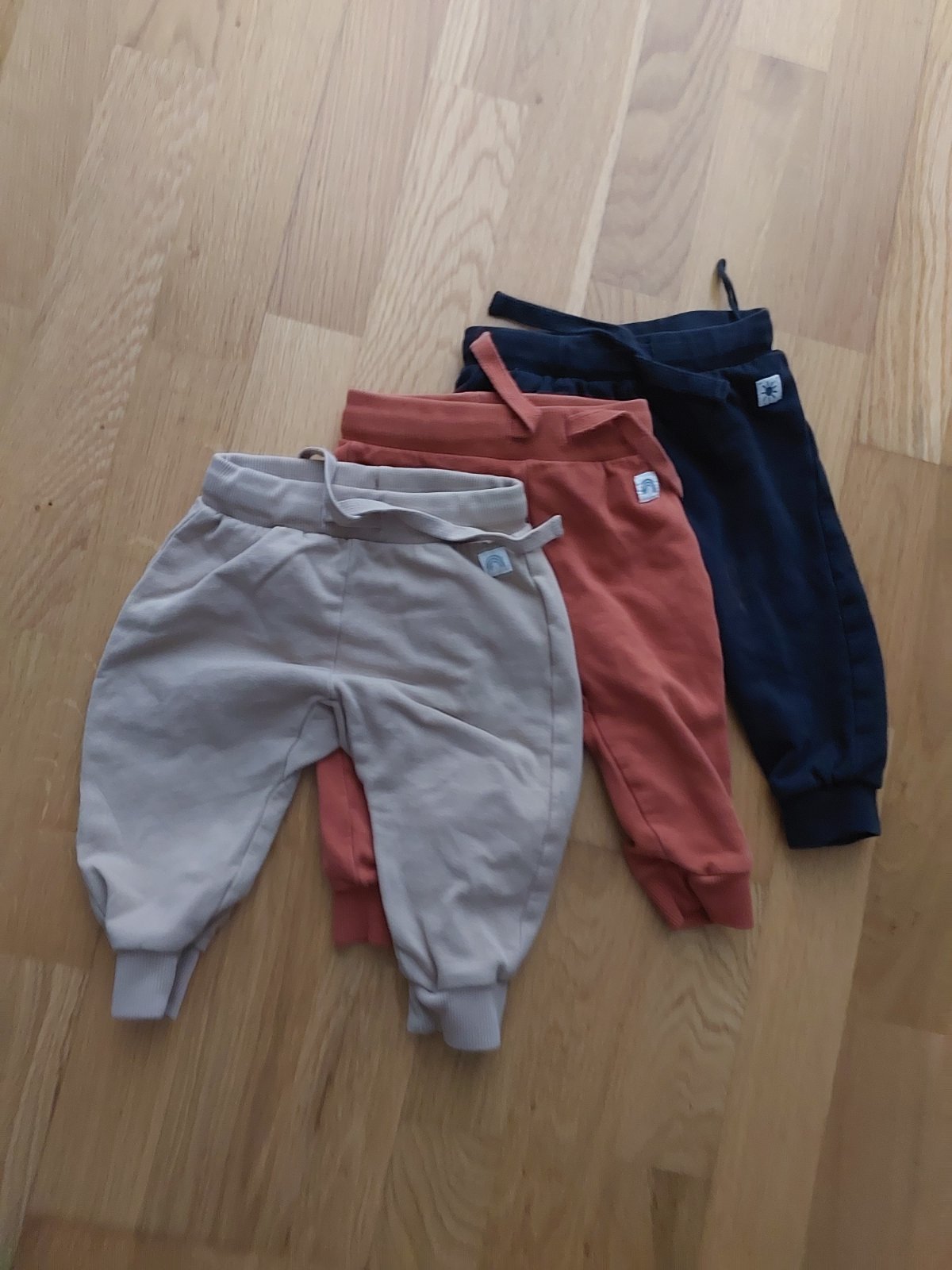 Veľmi pekné tenšie tepláky. Rada som ich obliekala. Nemajú poškodenia. Spodok na nohách mali zahnutý, ja som vypárala a tým pádom predĺžila o záložku a nosili sme dlhšie. A aj ponosíte dlhšie určit...