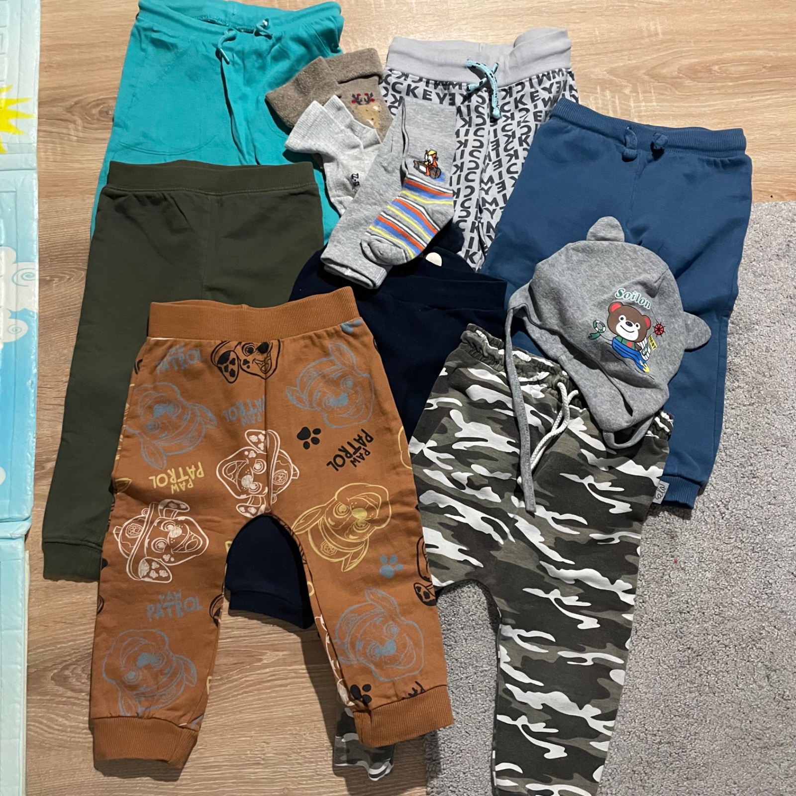Balík obsahuje 7ks tepláky dlhé na jeseň/zima, všetky veľkosť 86/92, vynikajúci stav všetky, nepoškodené. čiapka, ponožky a pančušky sú grátis.