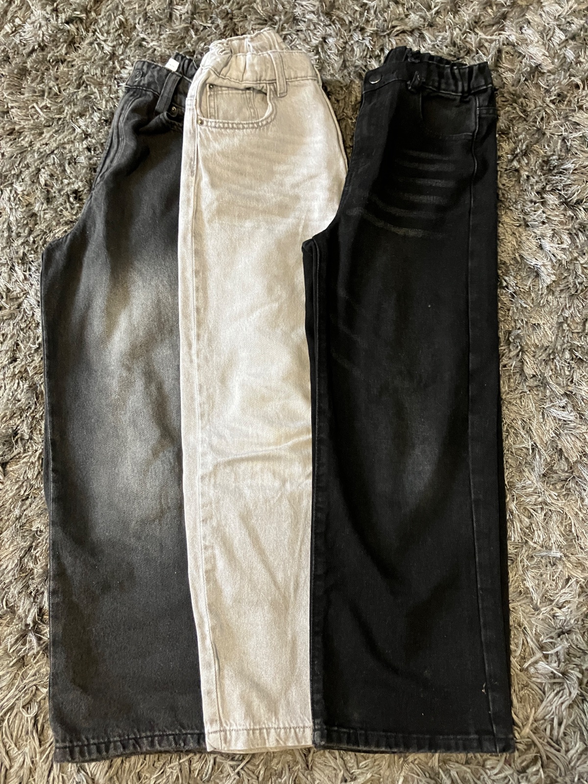 Troje širokých “skejťáckych” riflí, kupované nové, nosené jednu sezónu. Všetky majú vnútri sťahovaciu gumu. Na bledosivych je malinké zatrhnutie, viď foto. Farba: bledosivé, tmavosivé, čierne vyšúchané. Cena spolu.
