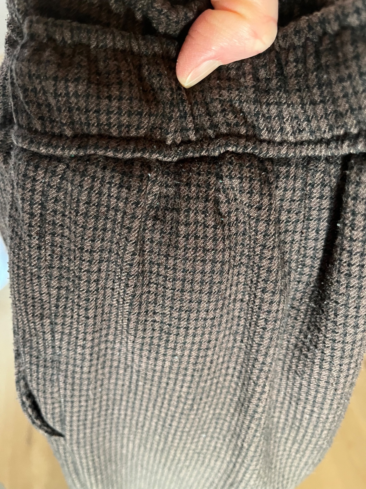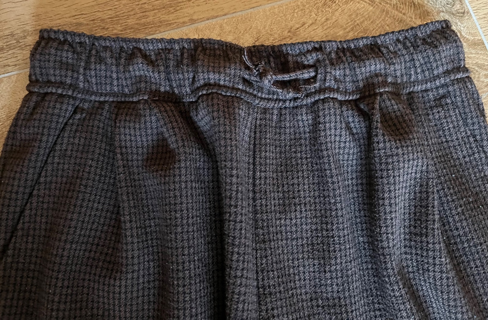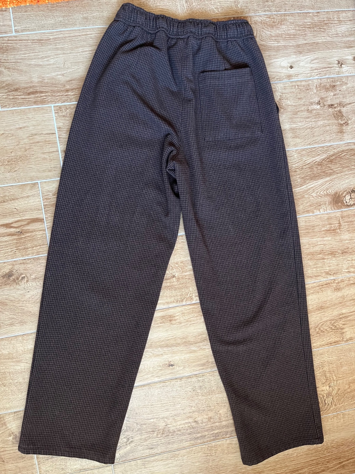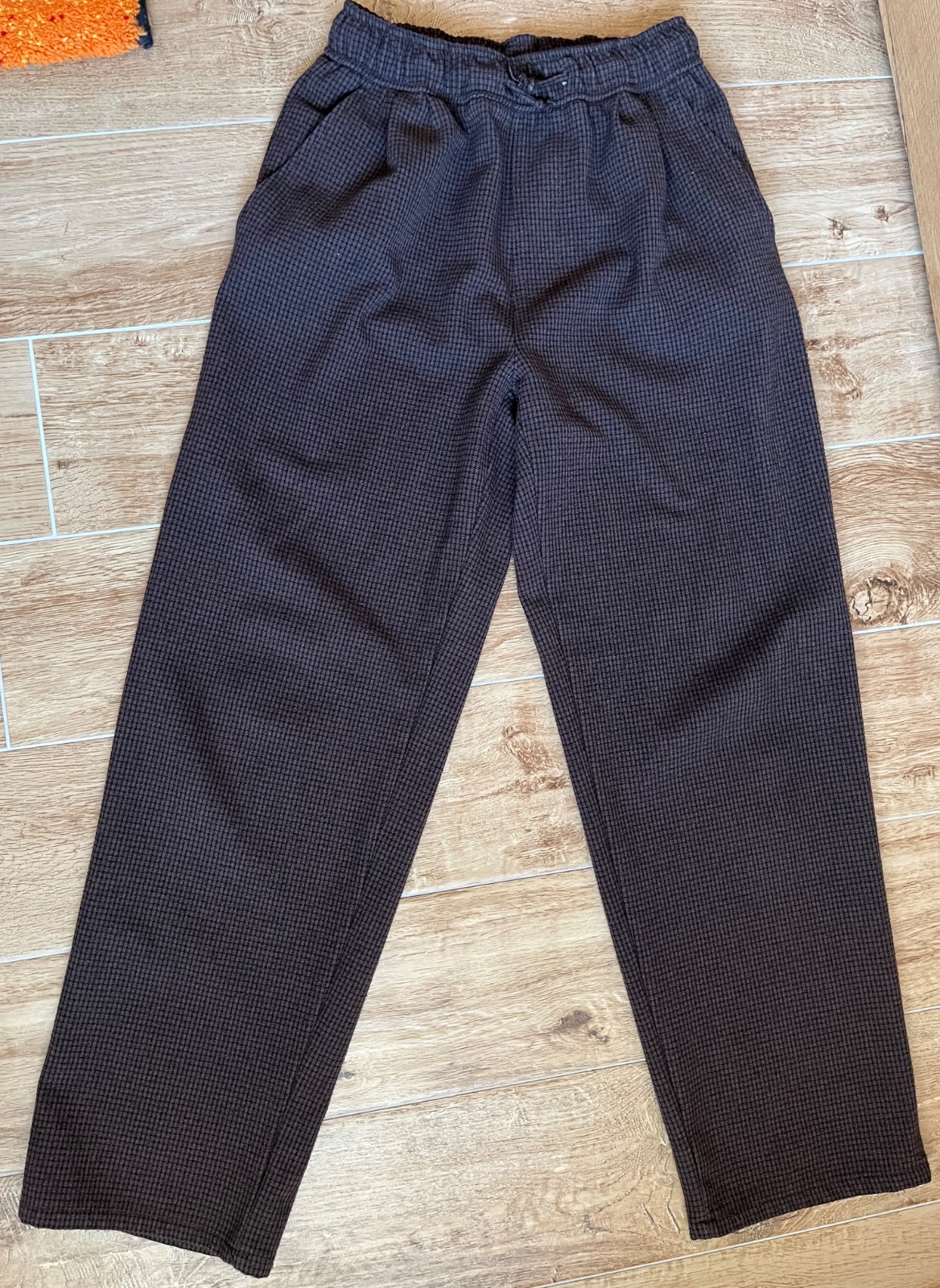 Nosené, veľmi dobrý stav, teplejšie, farba skôr ako na fotkách z blízka, dĺžka vpredu 91cm, vnútorná dĺžka 68, pás na gumu a šnúrky 28 cm, pohodlný voľnejší strih, boli synove obľúbené.