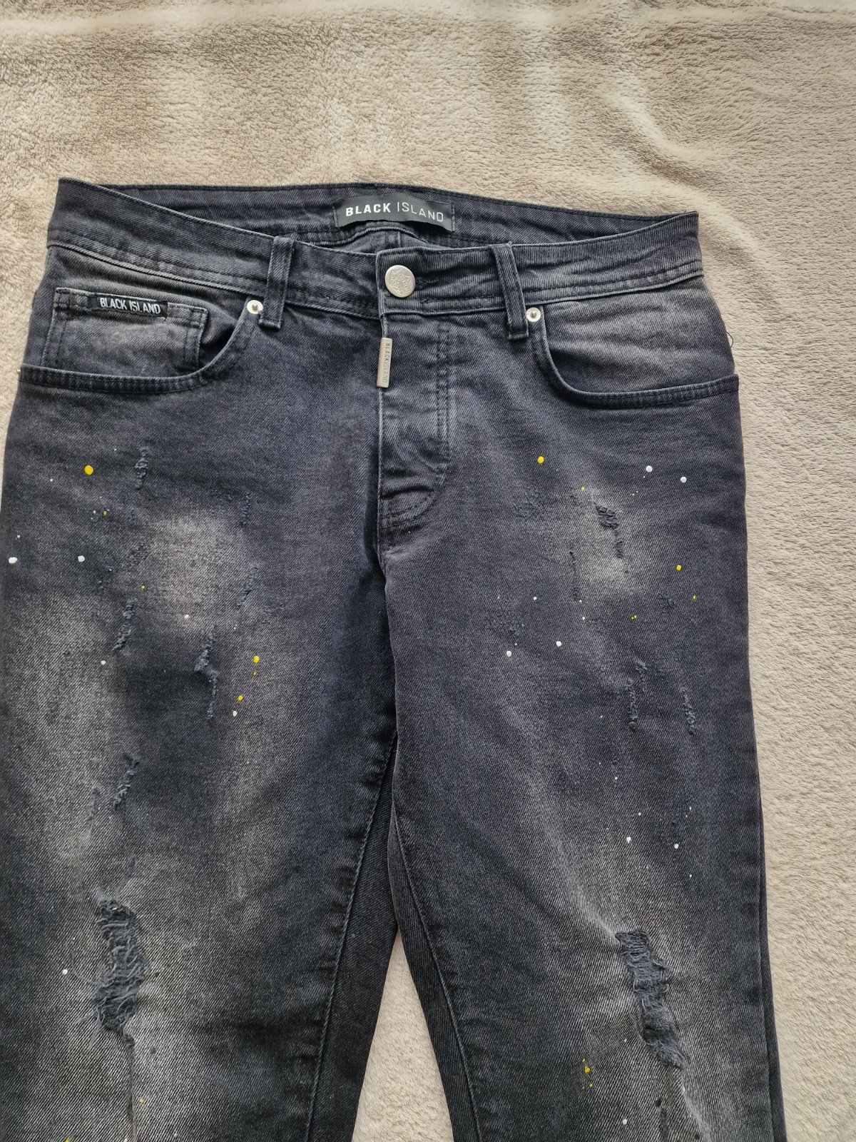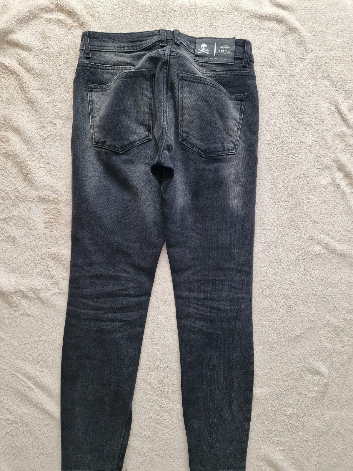 Extravagantné štýlové rifle tureckej značky Black Island. Pre odvážnych. Veľkosť XS/S. Dole zipsy, úzky strih slim, dĺžka kratšia po členky. Celé akoby pofŕkané bielou a žltou farbou. Jedinečný kúsok. Dĺžka 98 cm, pás 42 cm. K nim mám nátelník Black Island a kovovú bundu čiernu. Celé dokopy je to brutálny imidž. Všetko slim, XS/S, 170-180 na chudého pána/chalana.