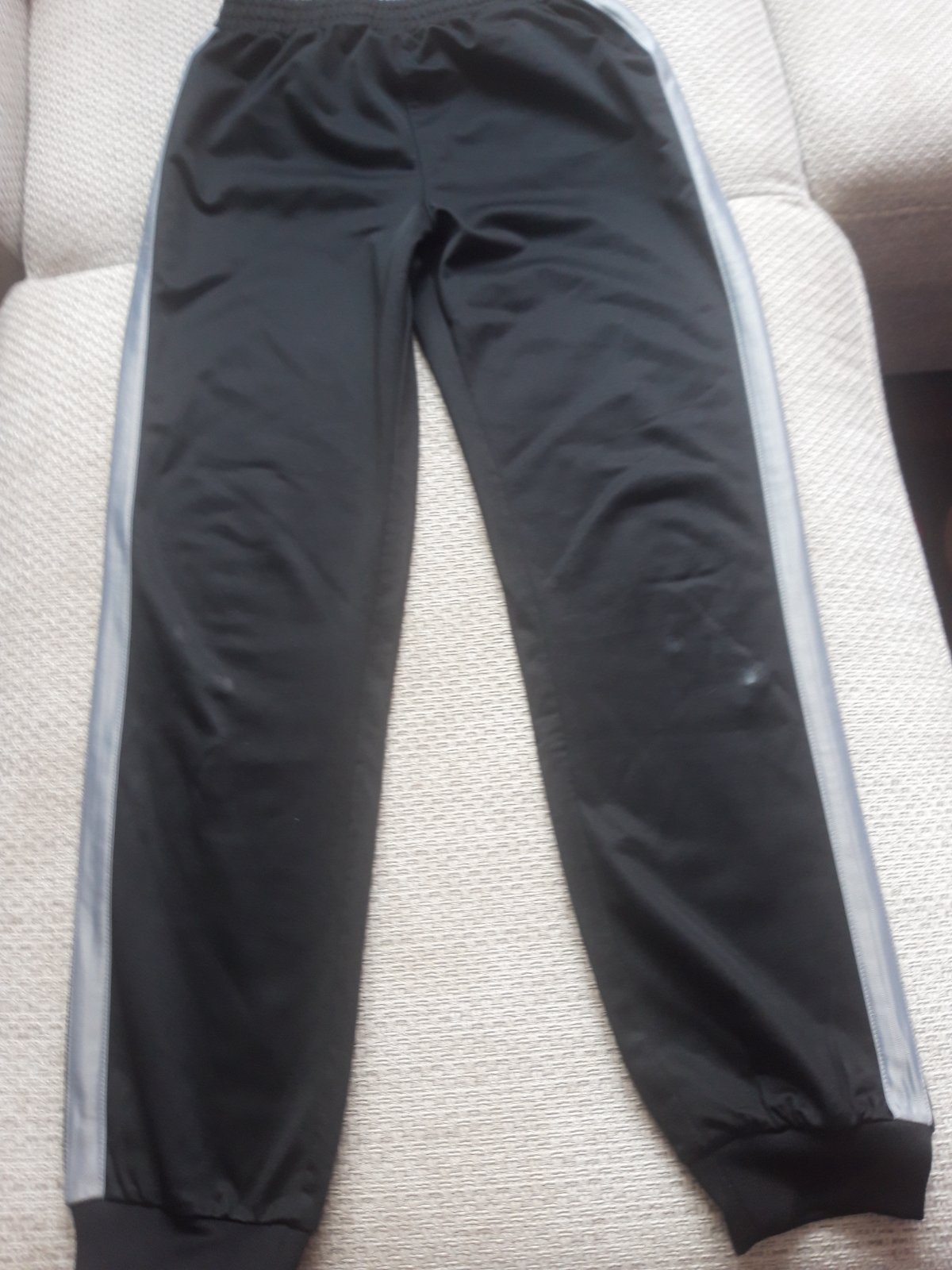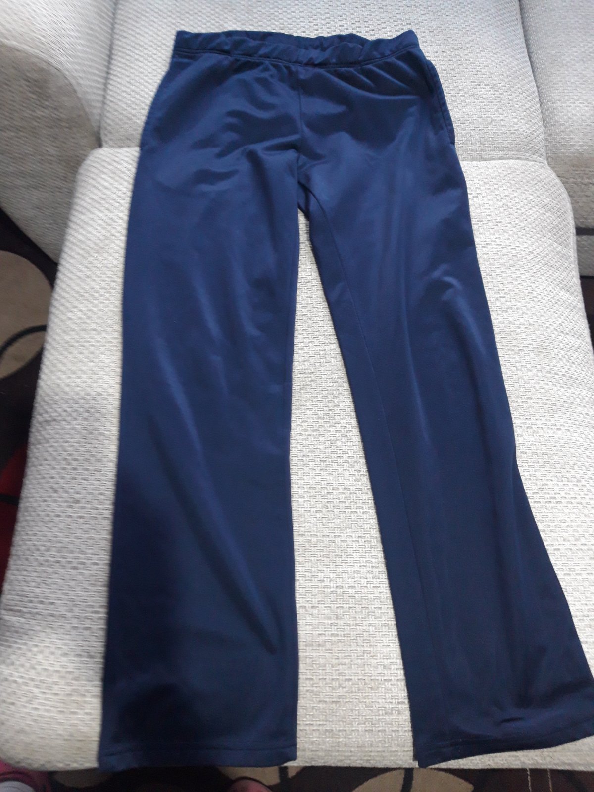 Polyesterové tepláky, nosené,zachovalé,nepotrhané, modré tepláky chýba v páse guma, čierne tepláky majú fĺaky v oblasti kolien aj vzadu /vid fotky/ ináč bez chyby, vhodné na doma,na behačku, cena spolu