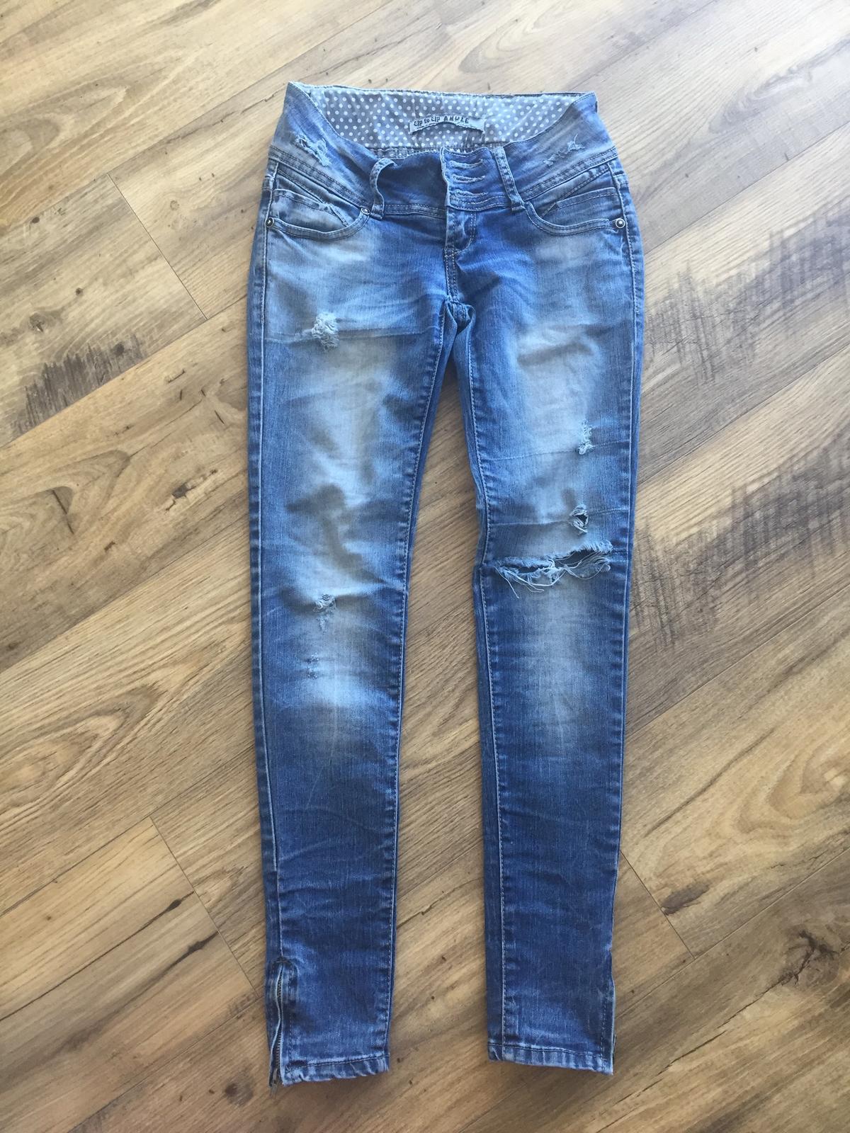 Predám nenosené rifle s kamienkami. Dĺžka 98 cm, sed 25 cm, pás 35 cm, boky 41 cm. Veľkosť sedí na XS.
