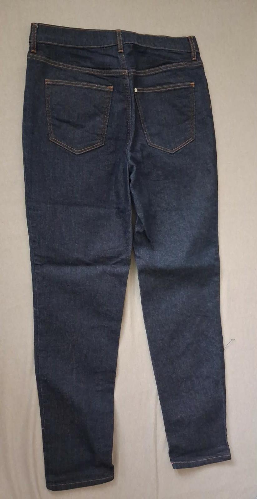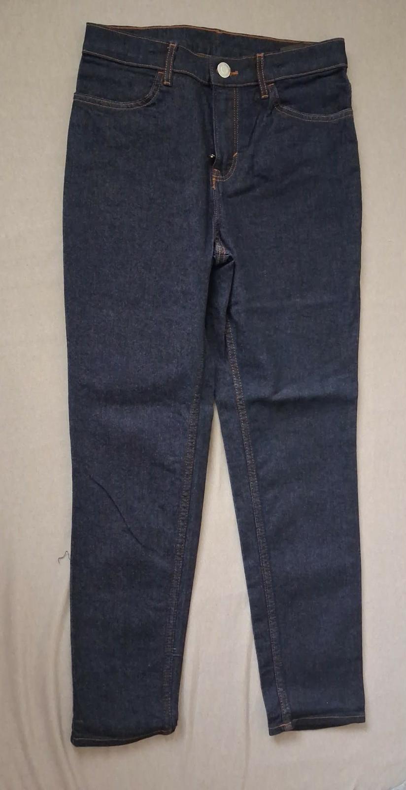 tmavo modré rifle H&M, veľkosť 158, zapínanie na gombík, v páse nastaviteľná guma, dlžka 95 cm, top stav - ako nové, cena 12 €