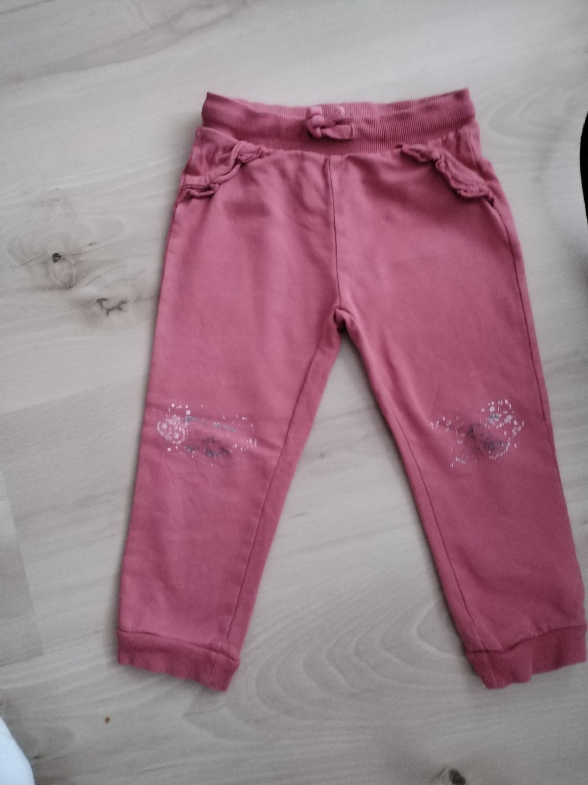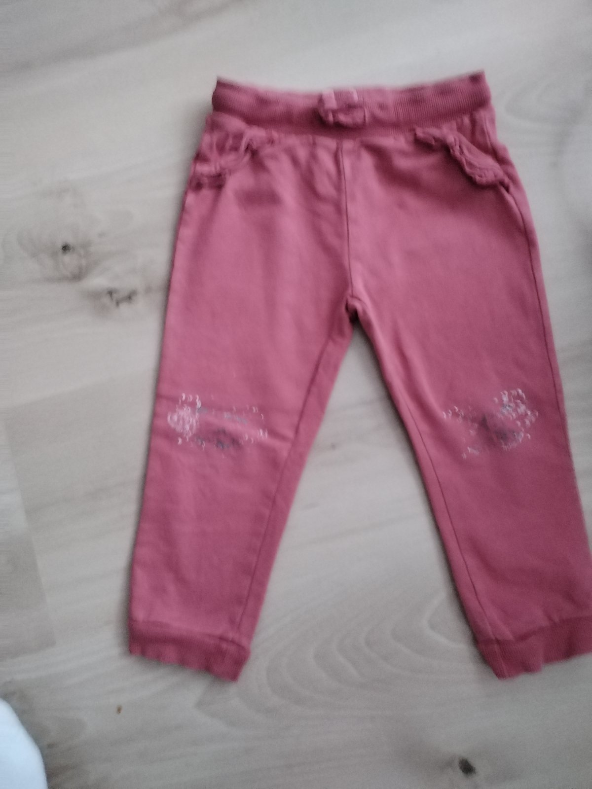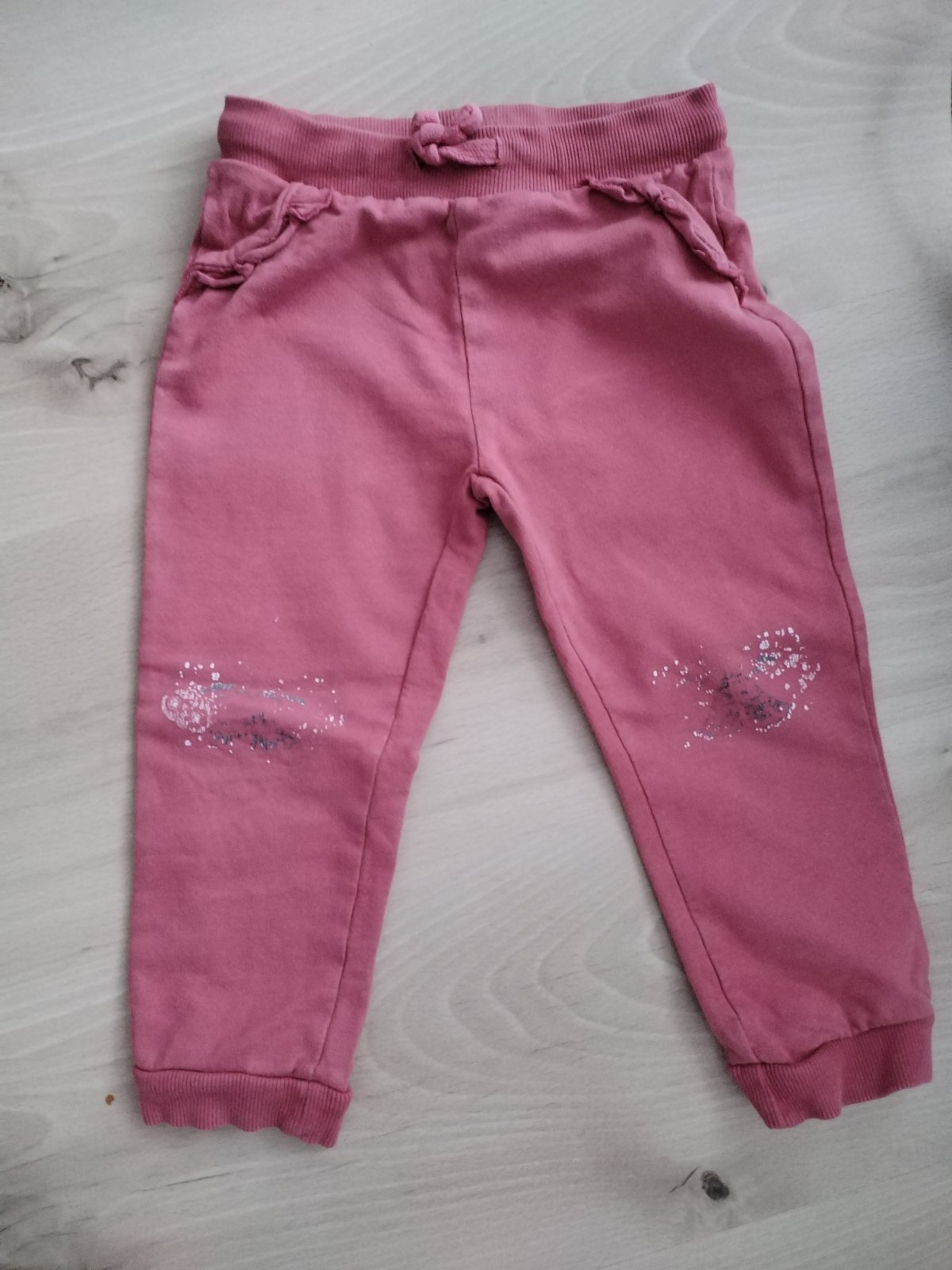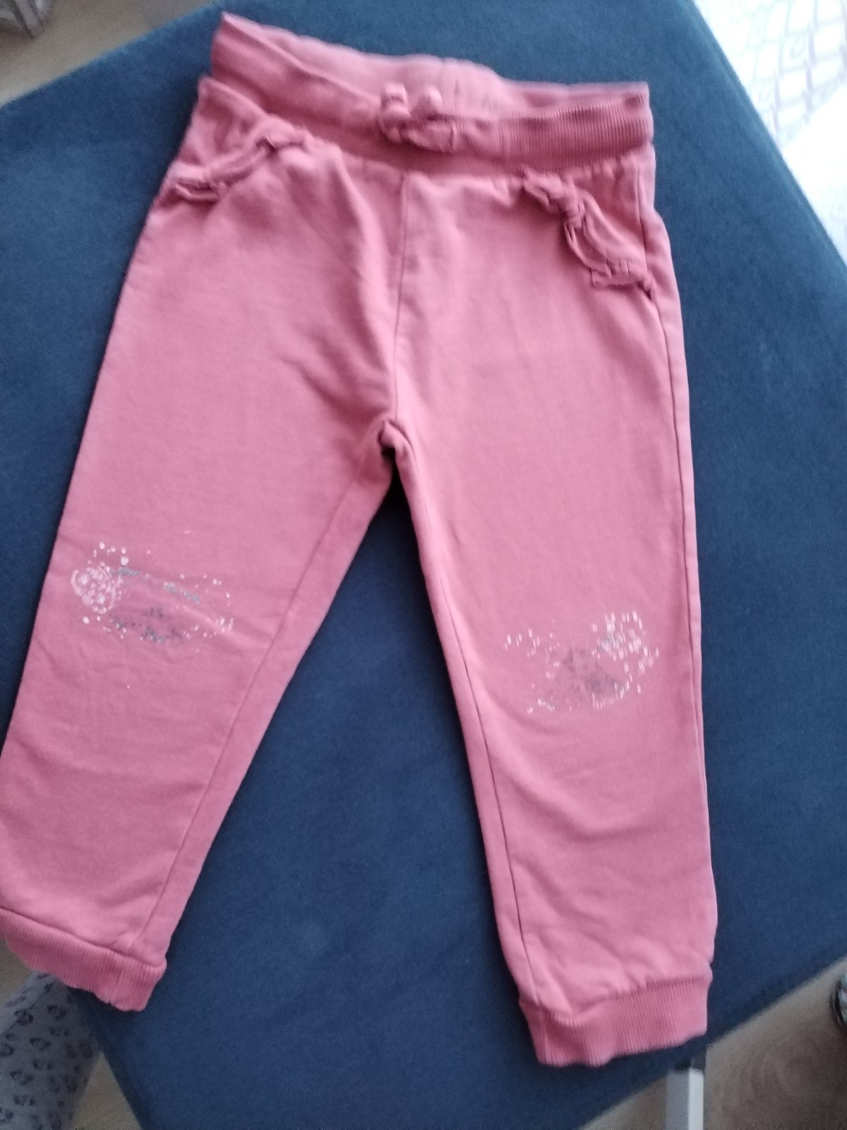 Predám krásne tepláčky tehlovej farby, boli 2 x oblecene a na kolenach bol obrazok, ten je trosku vyprany inak teplacky v top stave a kvalitne, bavlnene, bez vyblednuti a bez zmolkov, krasna farba, bavlna. Daju sa nosit od 86 sedia az do 98. My ich mame tolko, ze dcerka tieto mala max 2 x. Su krajsie ako na fotke.