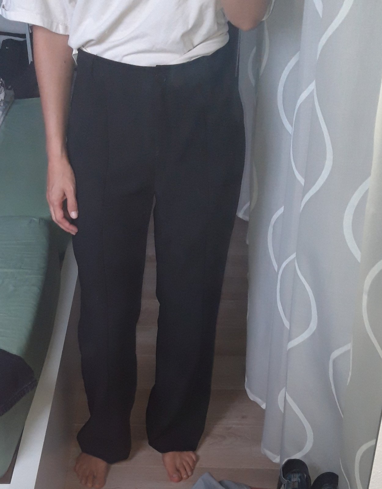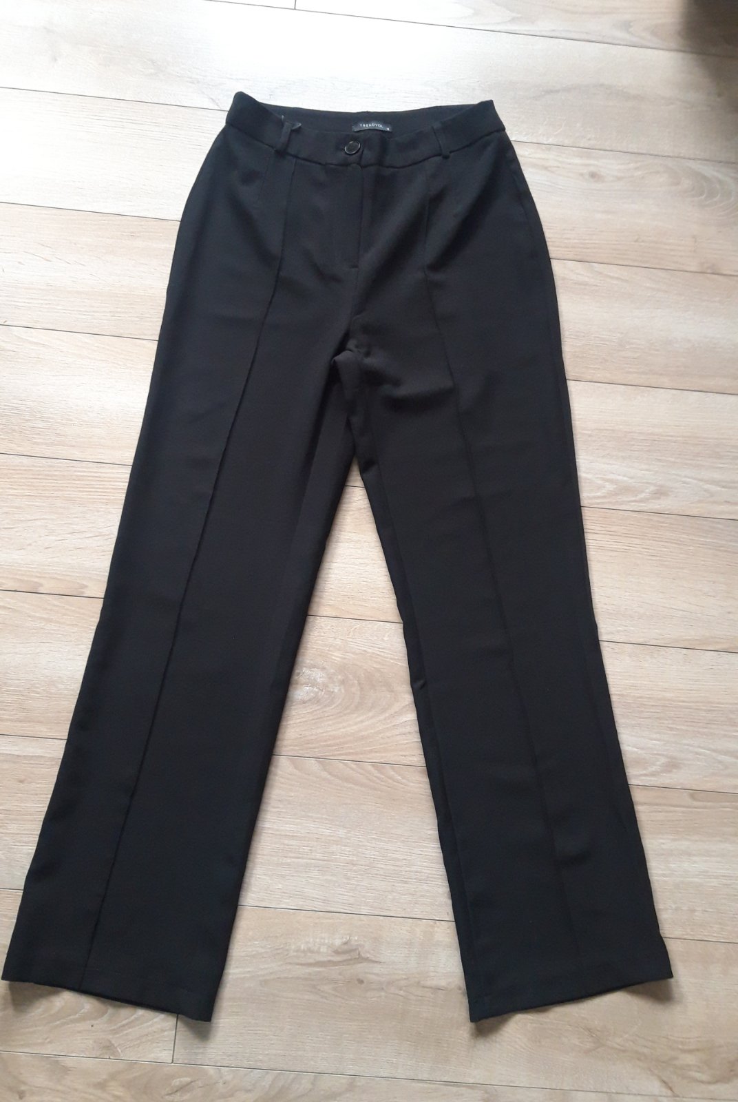 Kvalitné sýtočierne nohavice, oblečené 1x. Materiál 90% polyester, 10% elastan, vzhľad ako semiš, veľmi príjemné na dotyk. Zapínanie zboku na zips + 1 gombík, zipsy sú aj na spodnej vonkajšej stran...