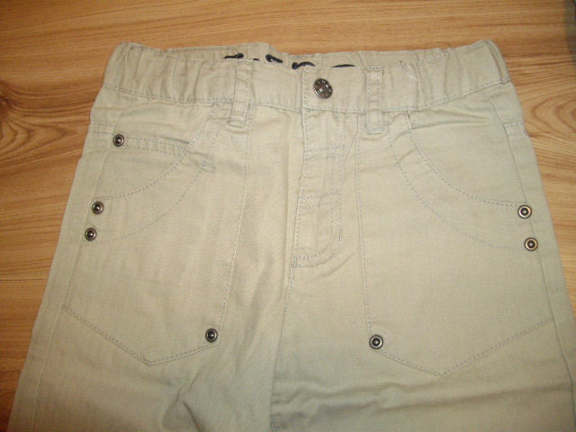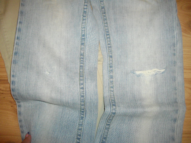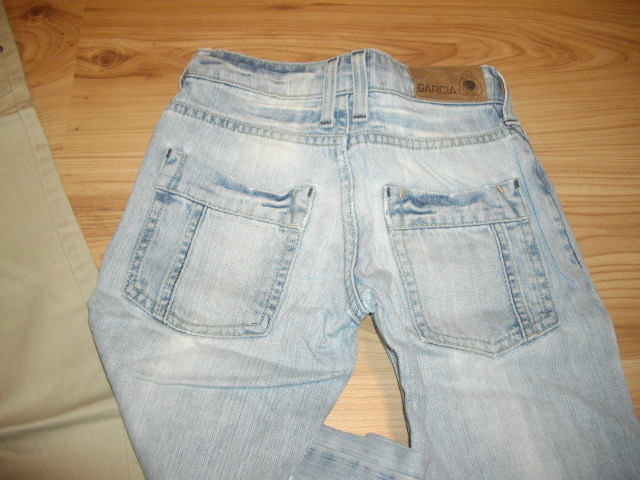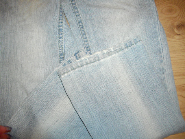 Bledomodré rifle - Štýlový ,vyšúchaný efekt, na jednom kolene je dierka, na druhom sa začína tvoriť. Spodky sú šuchnuté. Takto sme ich kupovali. Pás na nast. gumičku, max. 2*30cm, dĺžka 78/57cm.