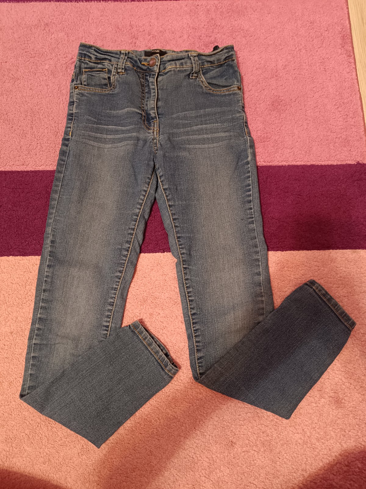 málo nosené pekné rifle s výšivkou kvetín,bez poškodenia,v páse aj na sťahovanie gumou +gombík zips dĺžka 91cm, na 11-12rokov pás sa dá natiahnuť až do 72cm
