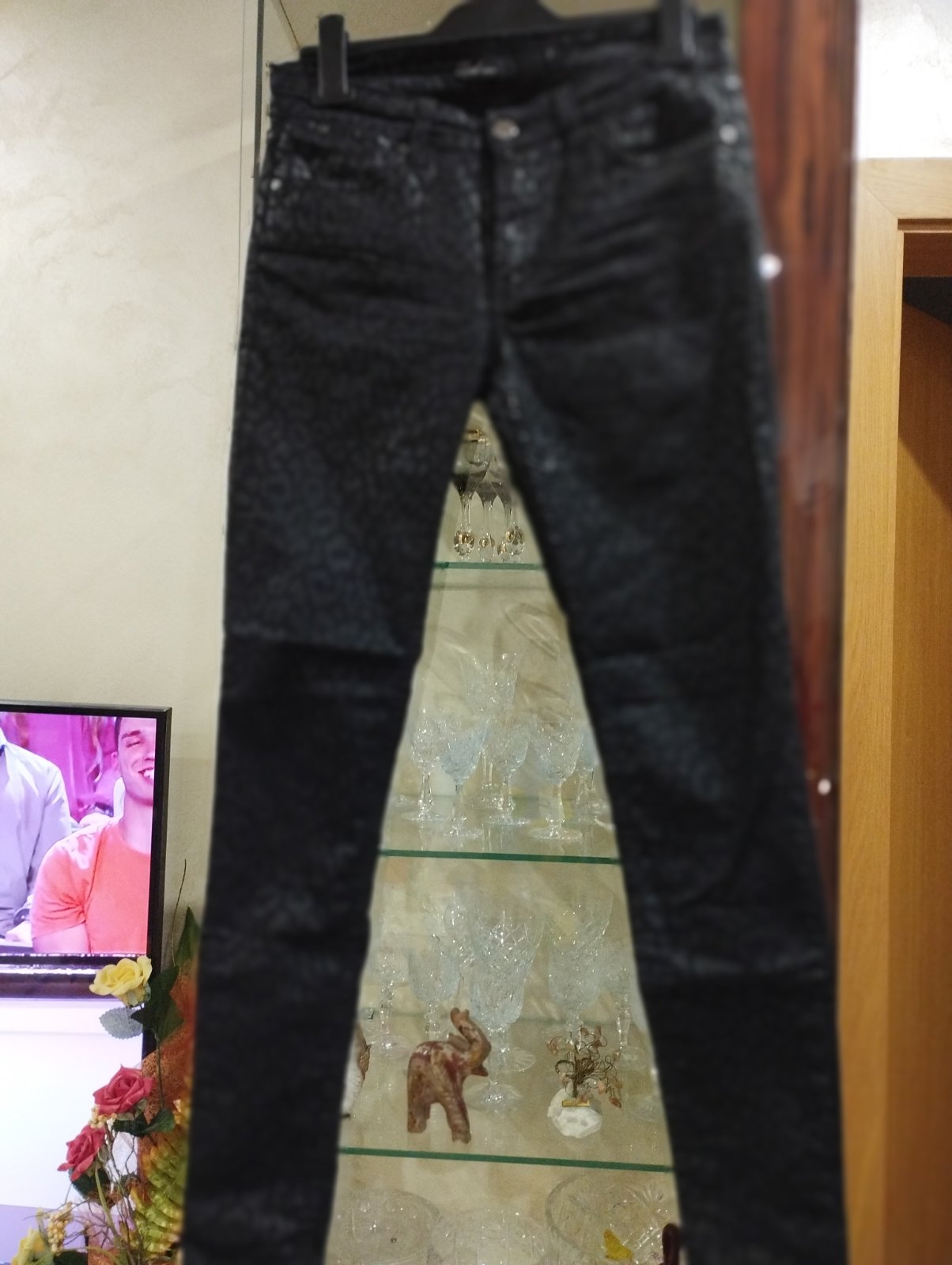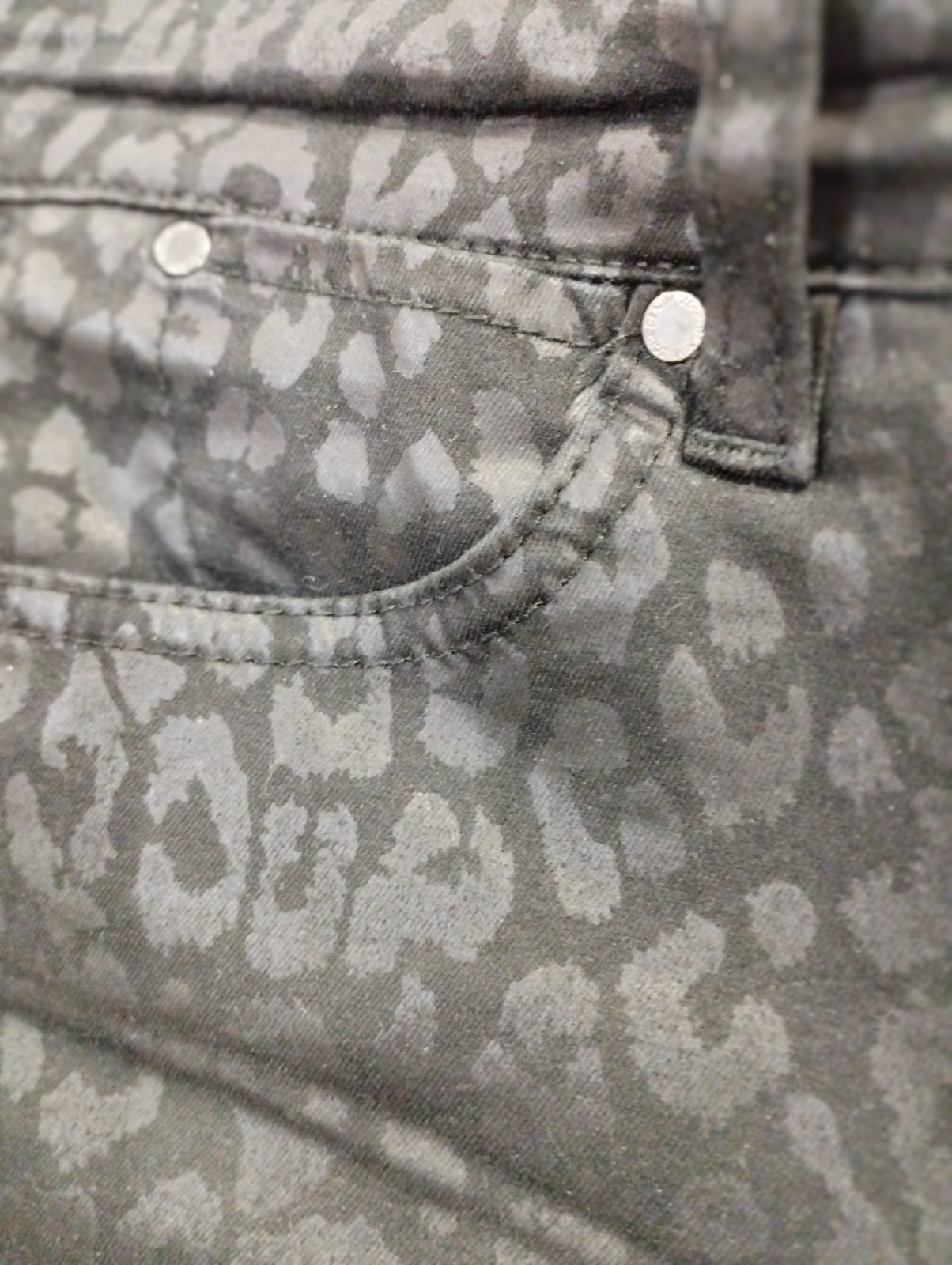 Čierne elastické nohavice so zvieracím vzorom. Pás 78 cm. Dĺžka 99 cm.