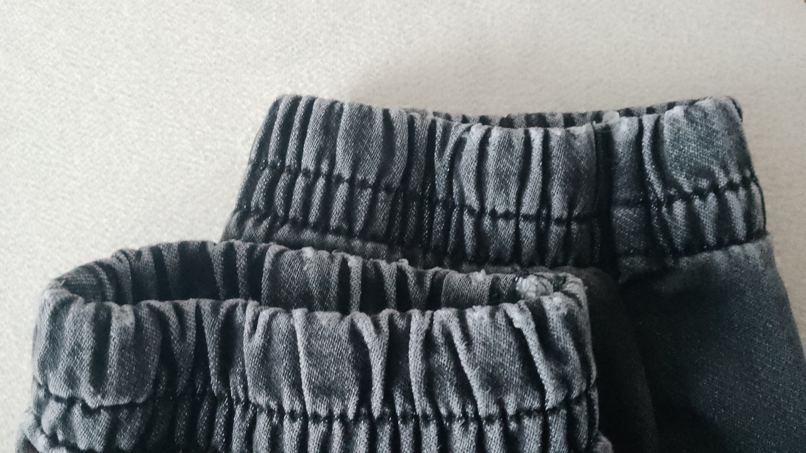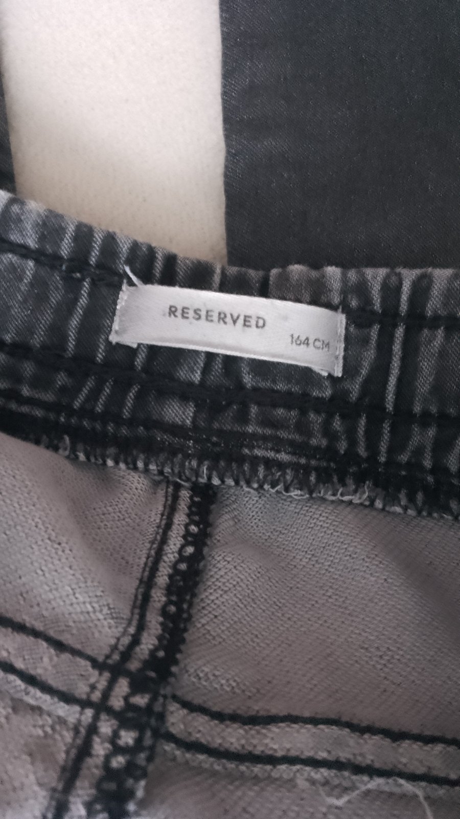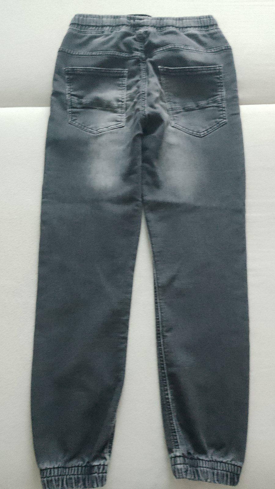 V zachovalom stave, dĺžka 99 CM, pás 36/46 CM, elastický materiál, na spodku nohavíc a v okolí vreciek je jemné predratie materiálu, viď foto.