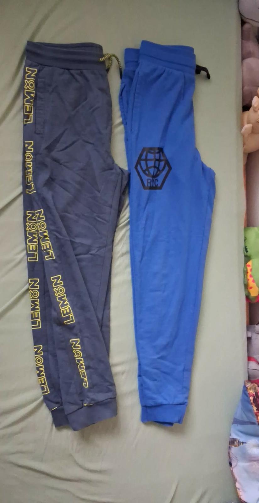 2x tepláky - bledomodré ,,Pepperts, veľkosť 146/152, v páse guma a šnúrka, dlžka 90 cm, pekný stav, cena 4 € + tmavo tyrkysové, ,,Coccodrillo", veľkosť 152, na bokoch nápis Lemon, v páse guma a šnúrka, dlžka 88 cm, pekný stav, cena 9 € - oboje spolu 13 €