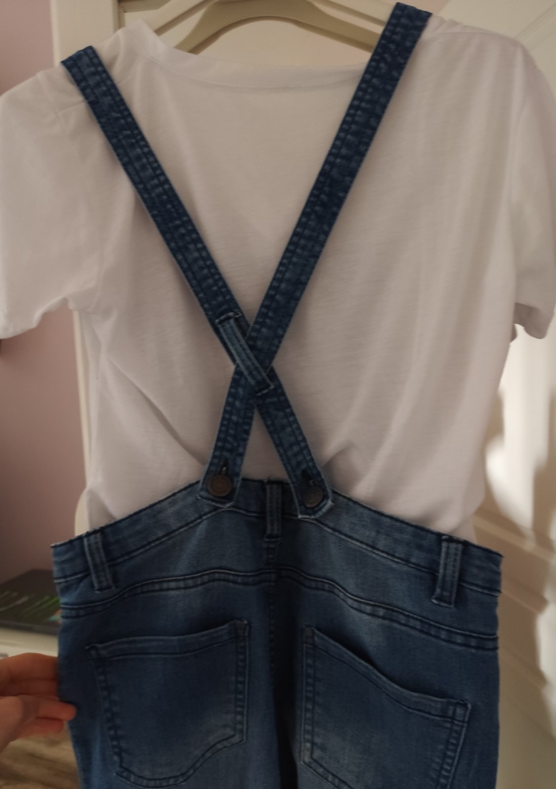 Predám len párkrát oblečené dámske (dievčenské) rifle na traky, sedia na veľkosť 34/36.Nemajú tie fľaky, to je slnko. Rozmery: pás-36cm,vnútorná dĺžka-80cm, vonkajšia-99cm.