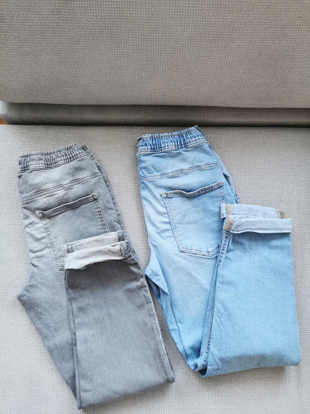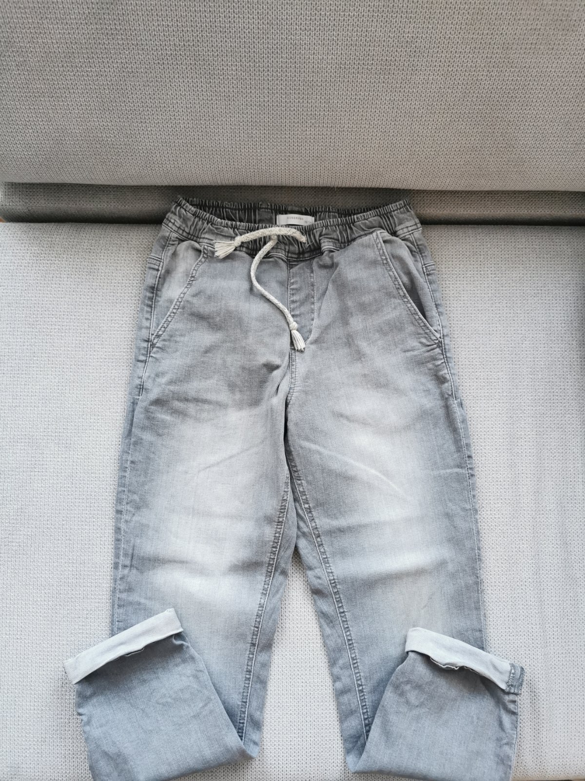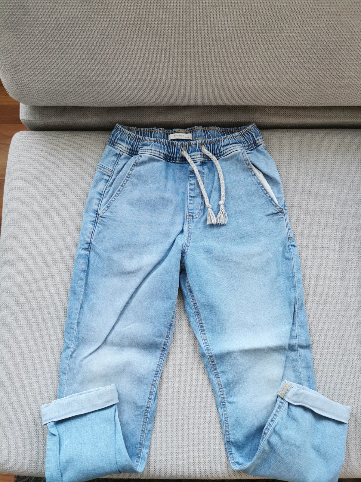 Bez poskodenia, snurka na stiahnutie v pase, obe su velkosti 152, spodne zahnutie rifloviny je napevno od vyroby.