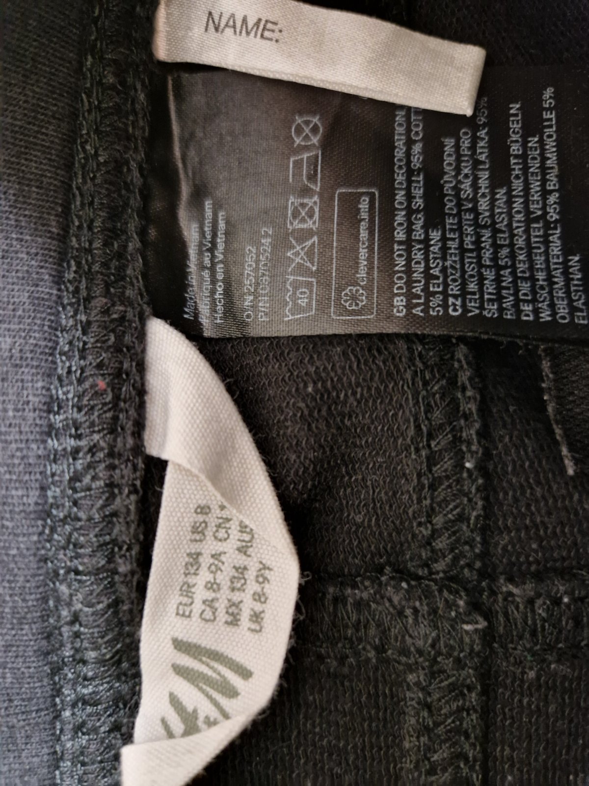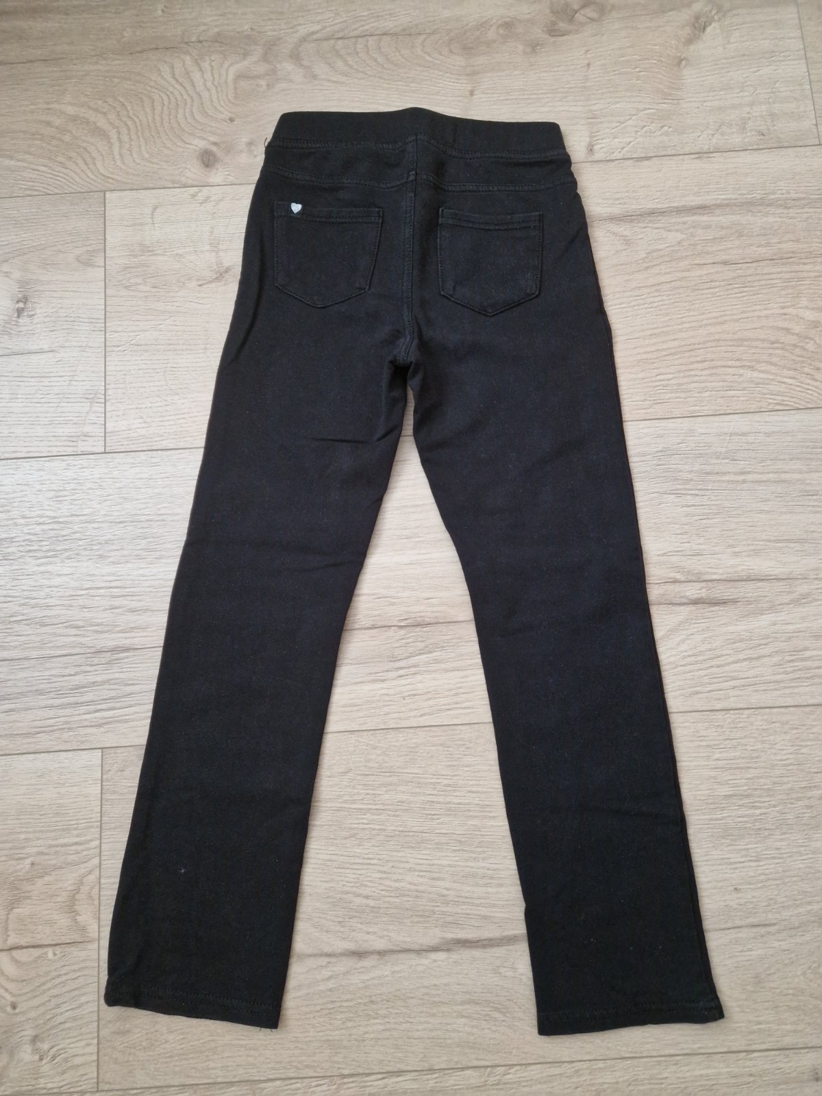 Nohavice čierne, takmer nenosene.elasticke, 134, H&M. Dĺžky 77/55cm, pás 52cm, šírka spodku nohavice 13,5cm. Vrecka vzadu, v páse široká guma, netlačí. Pohodlné. Daju sa nosiť aj na jazdenie. Vid etiketa. 2xprane.