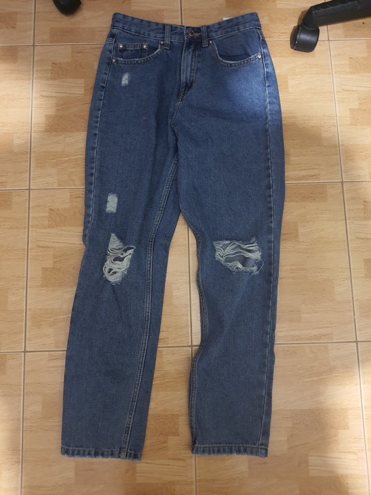 Nenosene rifle na nižšiu postavu rovného strihu s elastanom. Su velmi pohodlne. Zn. John Baner objednane v Bonprixe. Dl. 97 cm, od rozkroku 74 cm, pas je znížený 74-75 cm.