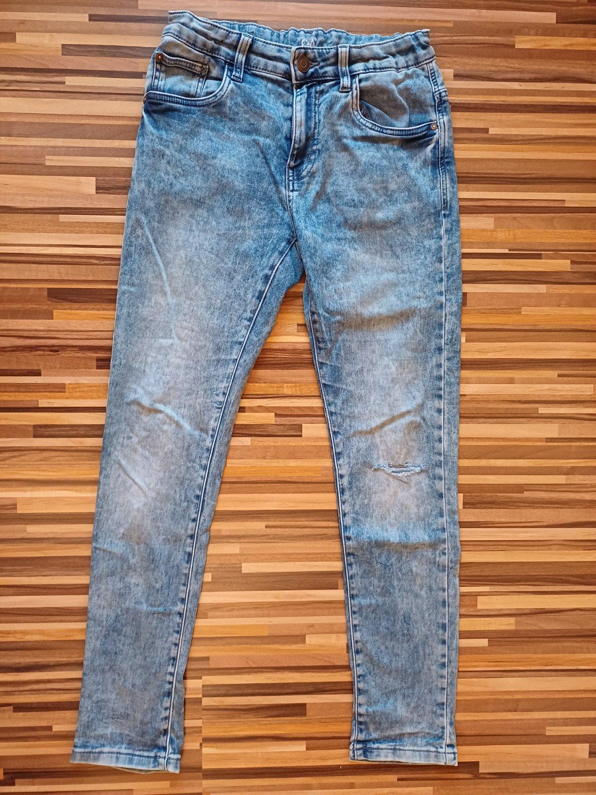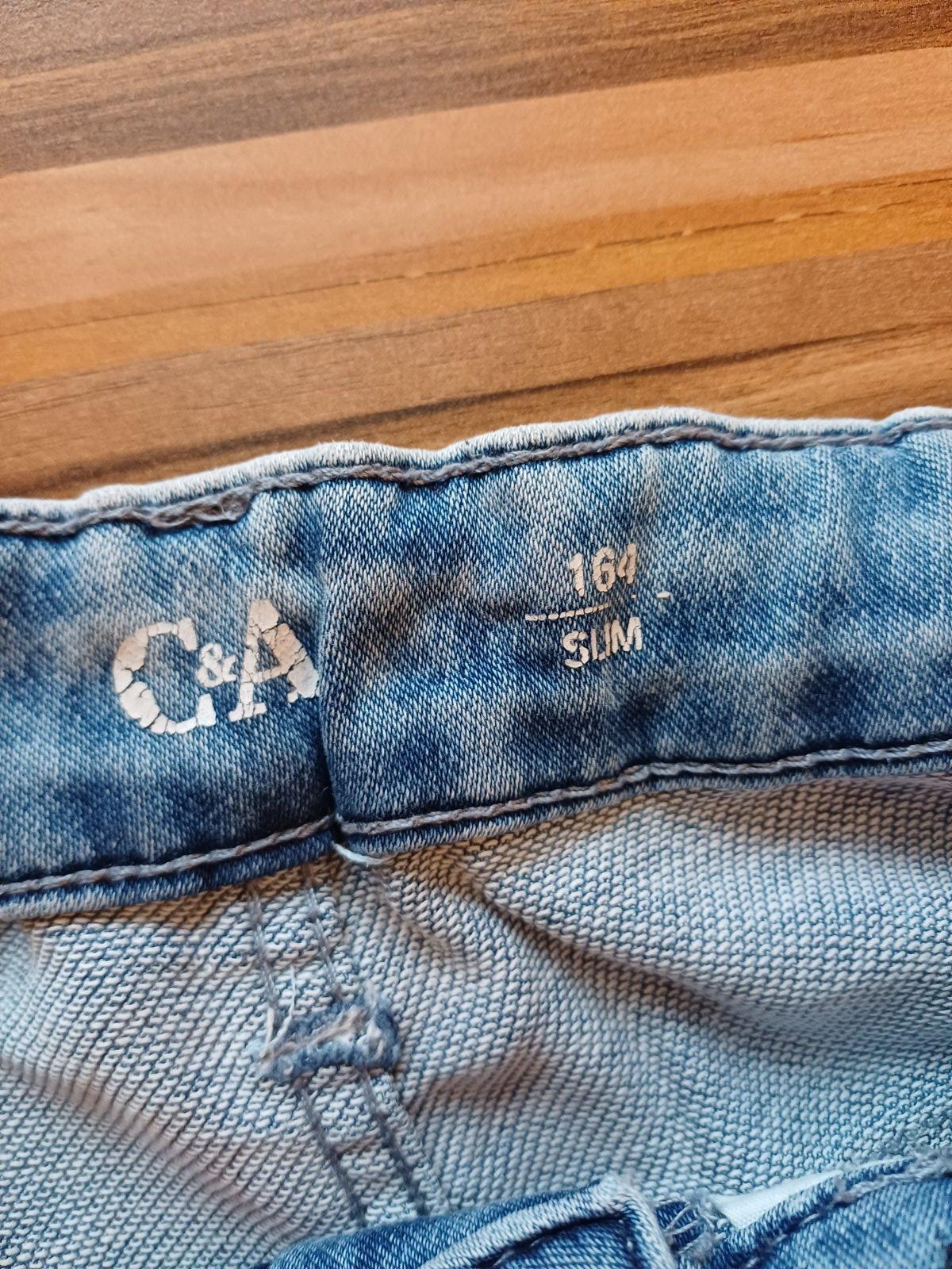 Rifle zn. C/A, veľ. 164, bledomodré. Materiál: 88% bavlna, 11% polyester, 1% elastan. Elastické, zapínanie na gombík + zips, 3 bočné vrecká + 2 zadné. Rozmery: postranná dĺžka 98 cm, od rozkroku dolu 72 cm, šírka v páse 35 cm.