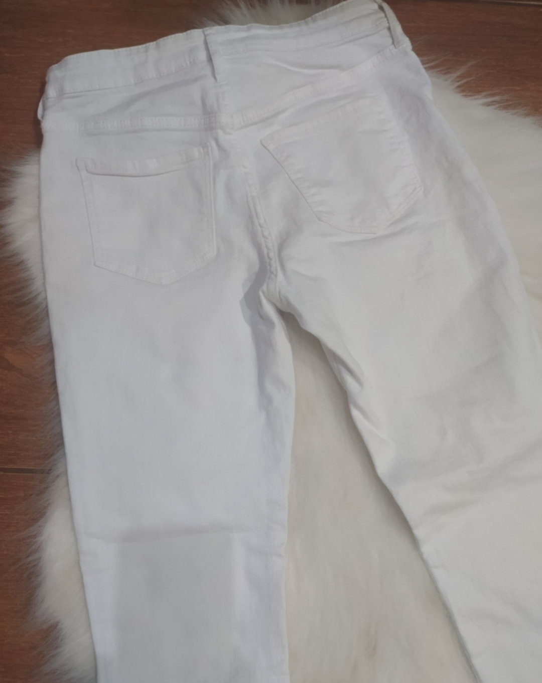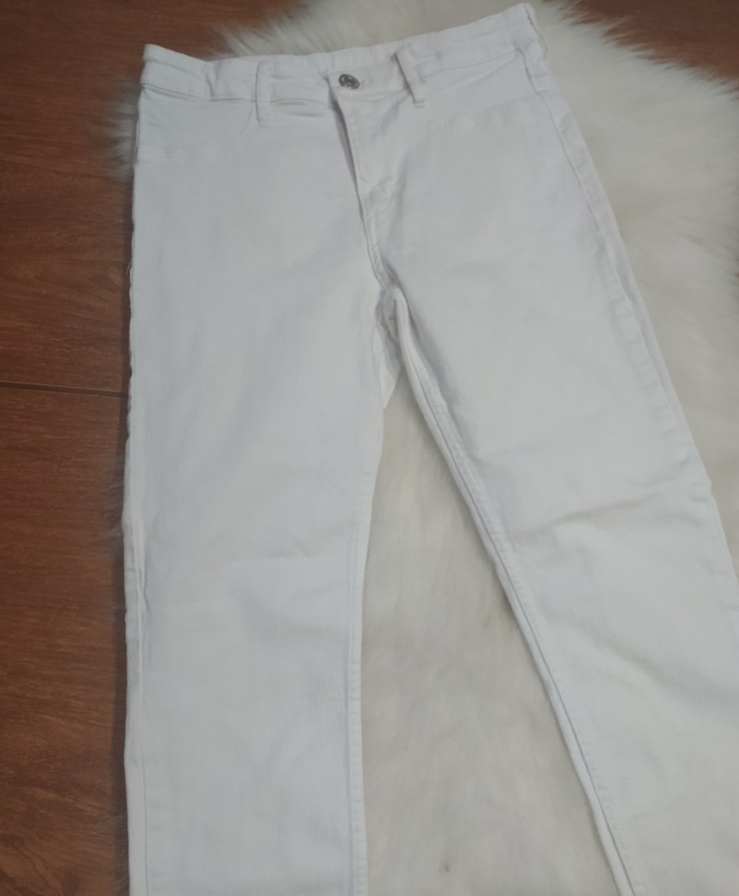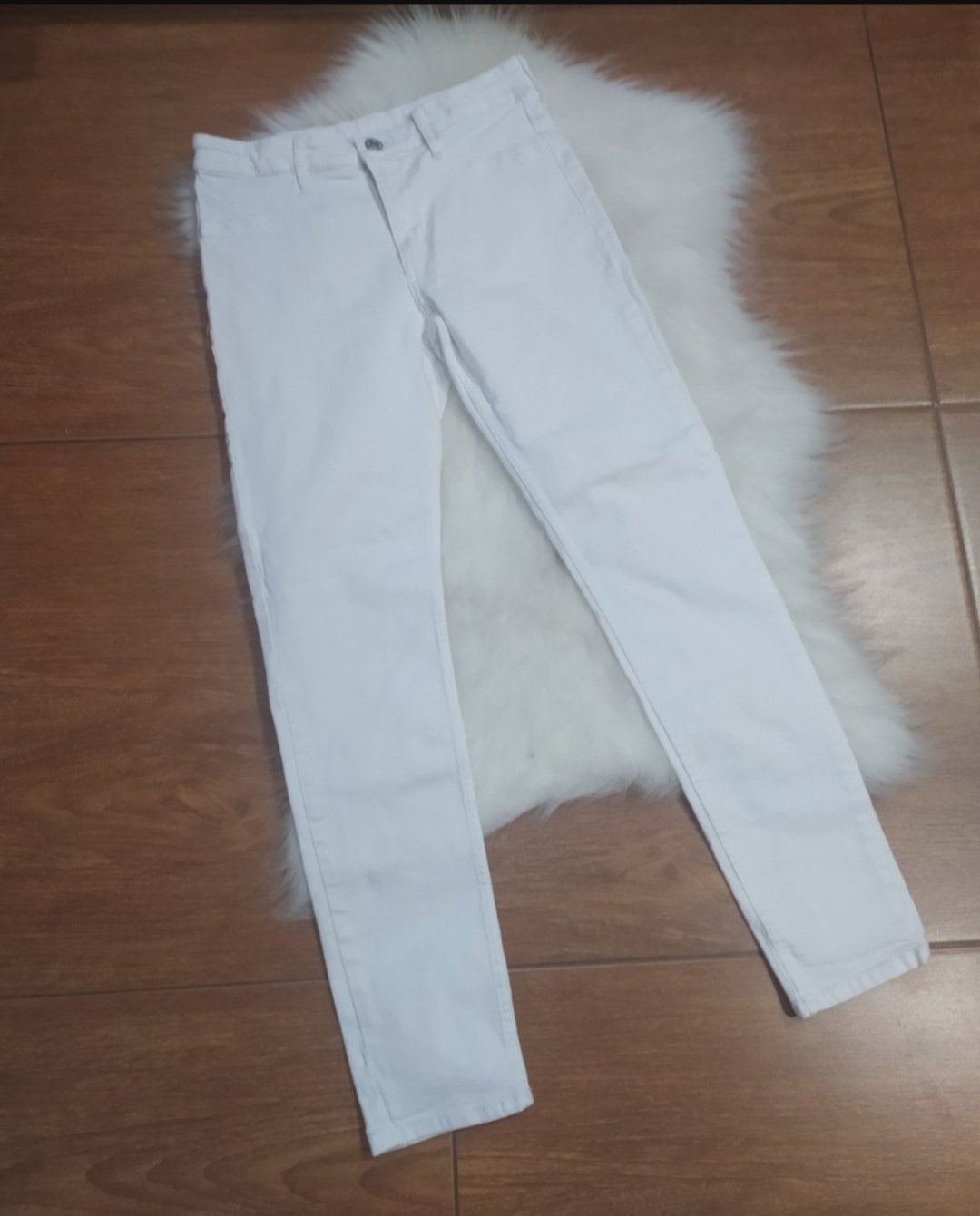 Biele frajerske rifle pre štíhle dievča, látka je poddajna. V peknom stave. Nosené ako 11,12 rokov. Čiže neviem presnú veľkosť. Pás 32cm v kľude až do 41cm. Dĺžka 95cm.stehno 20cm v kľude.