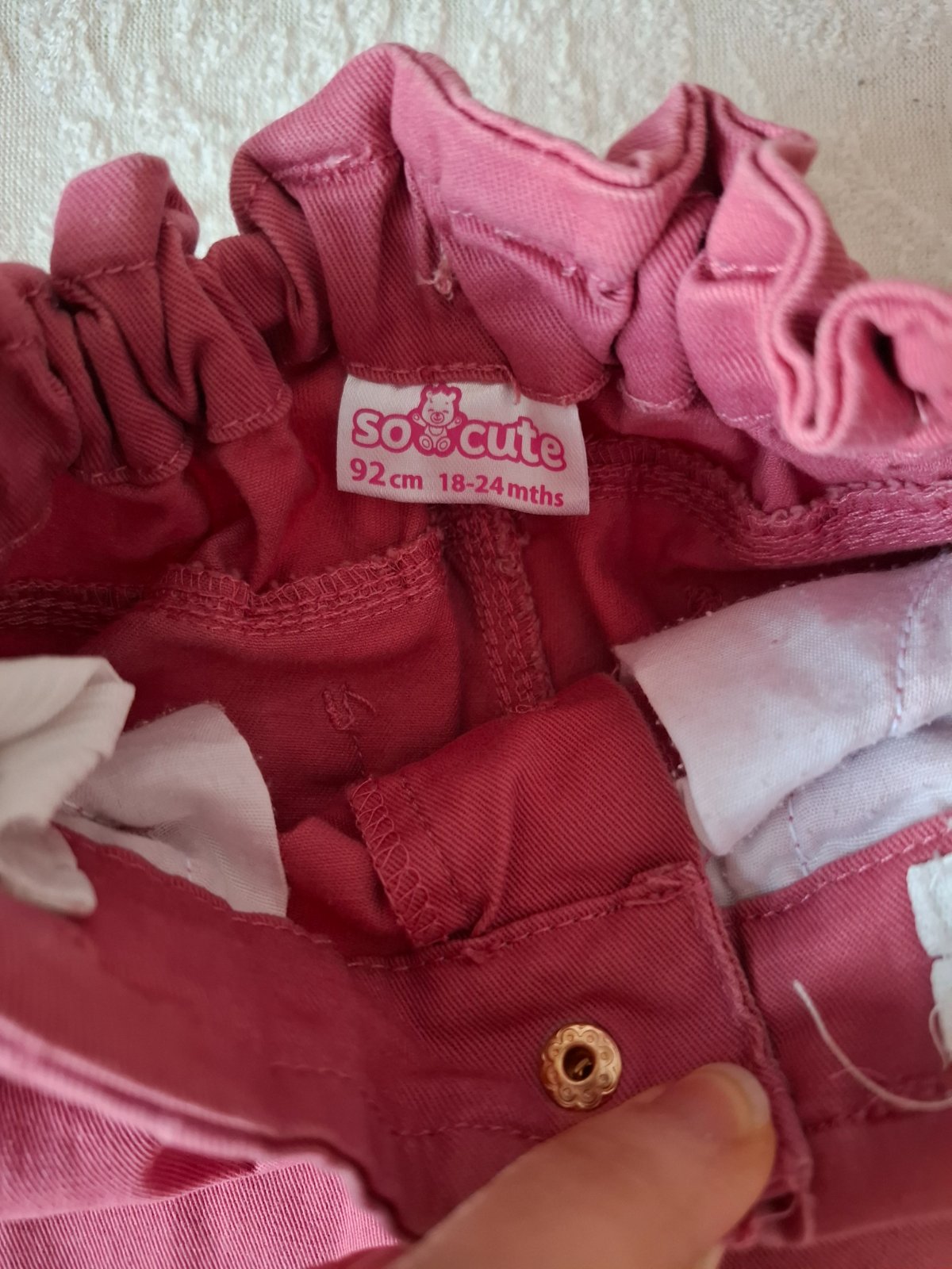 Oblečené raz, na kolene fliačik (viď.foto) farba ružová s oranžovou, 100% bavlna. Obvod pása 43cm, dĺžka 44cm. Váha 50g.