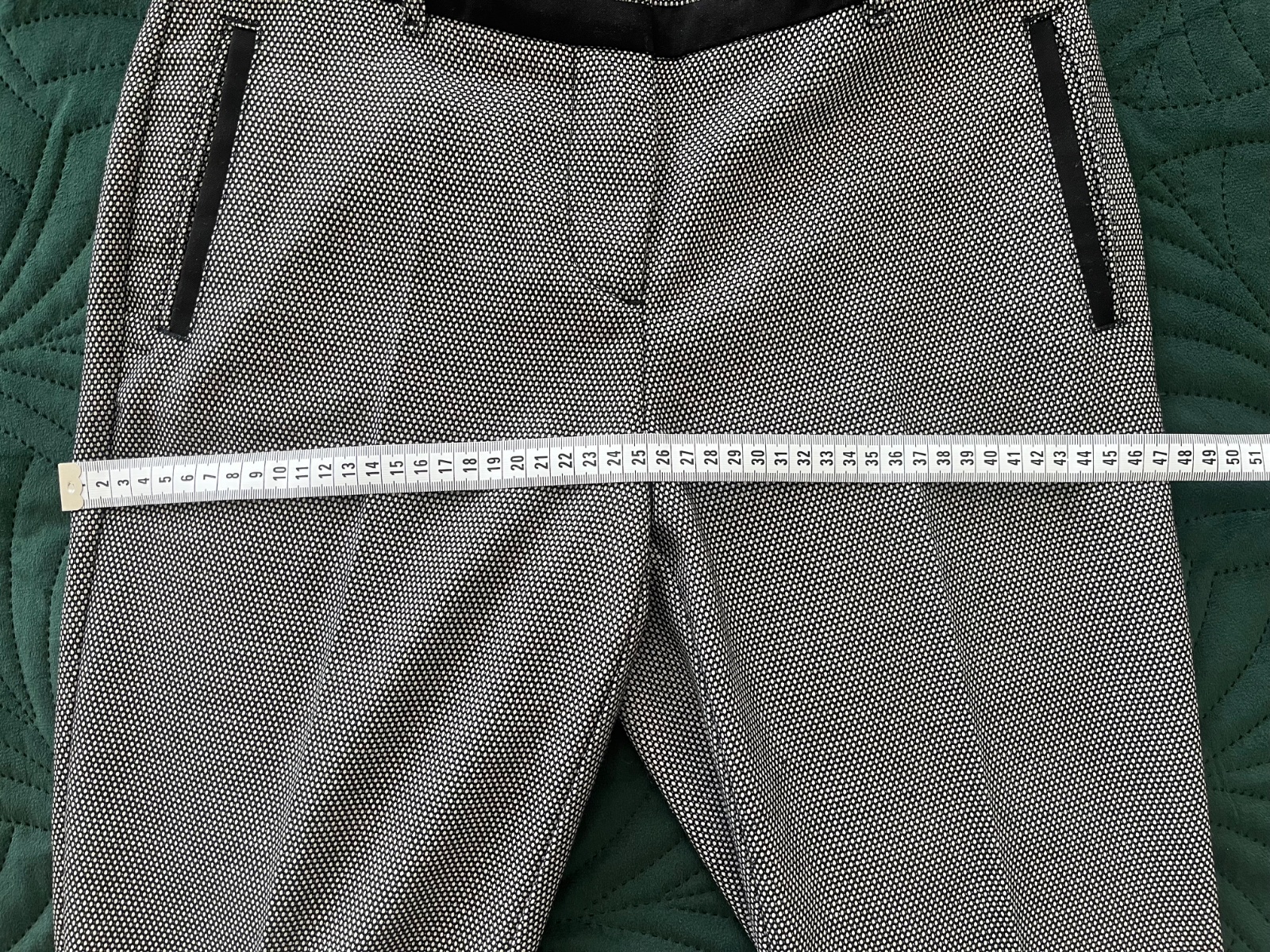Elegantné, elastické nohavice, ako nové Cd 94 cm Pás 37 cm Predný sed 23 cm Stehno 24,5 cm Dole 18,5 cm