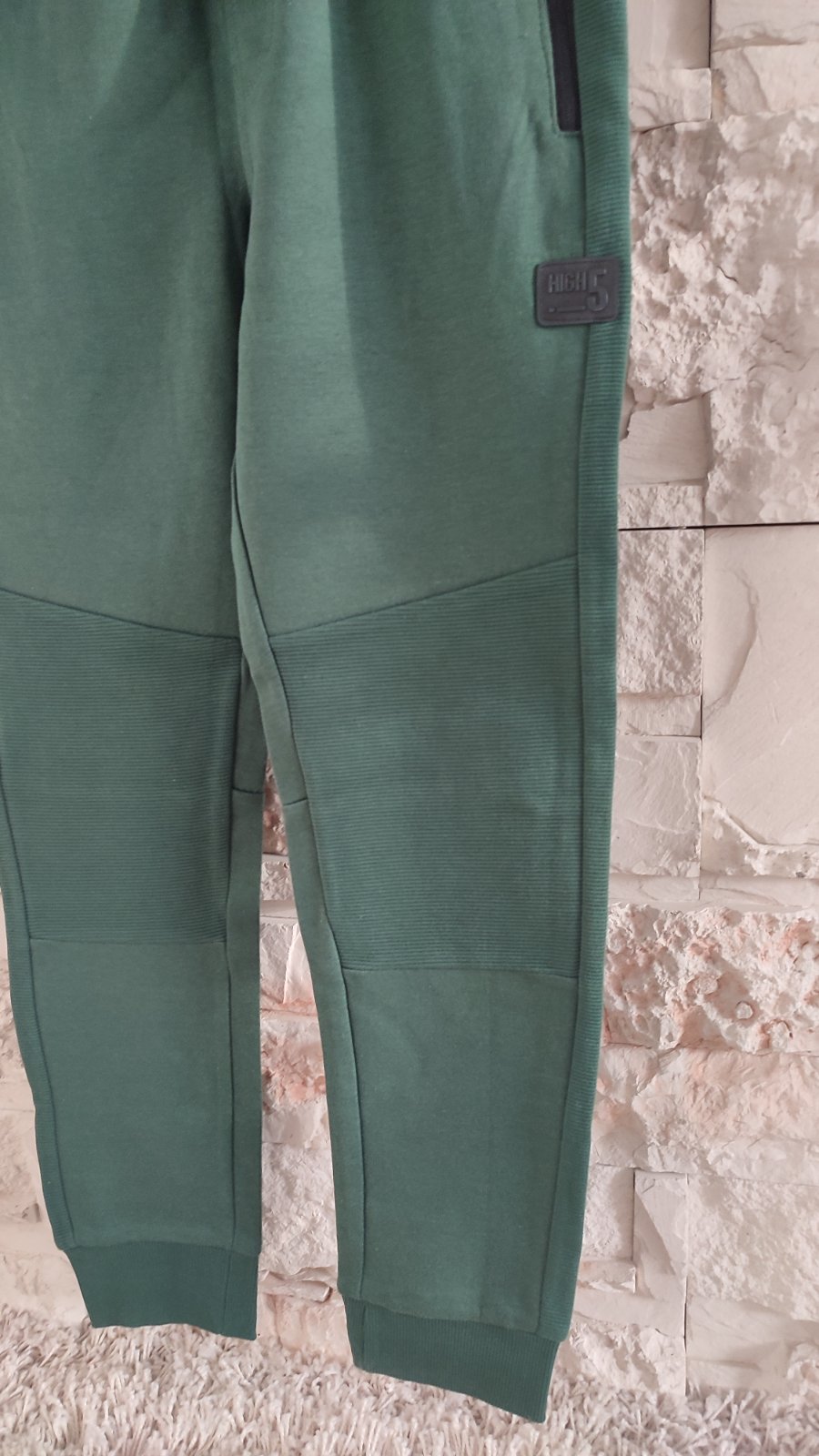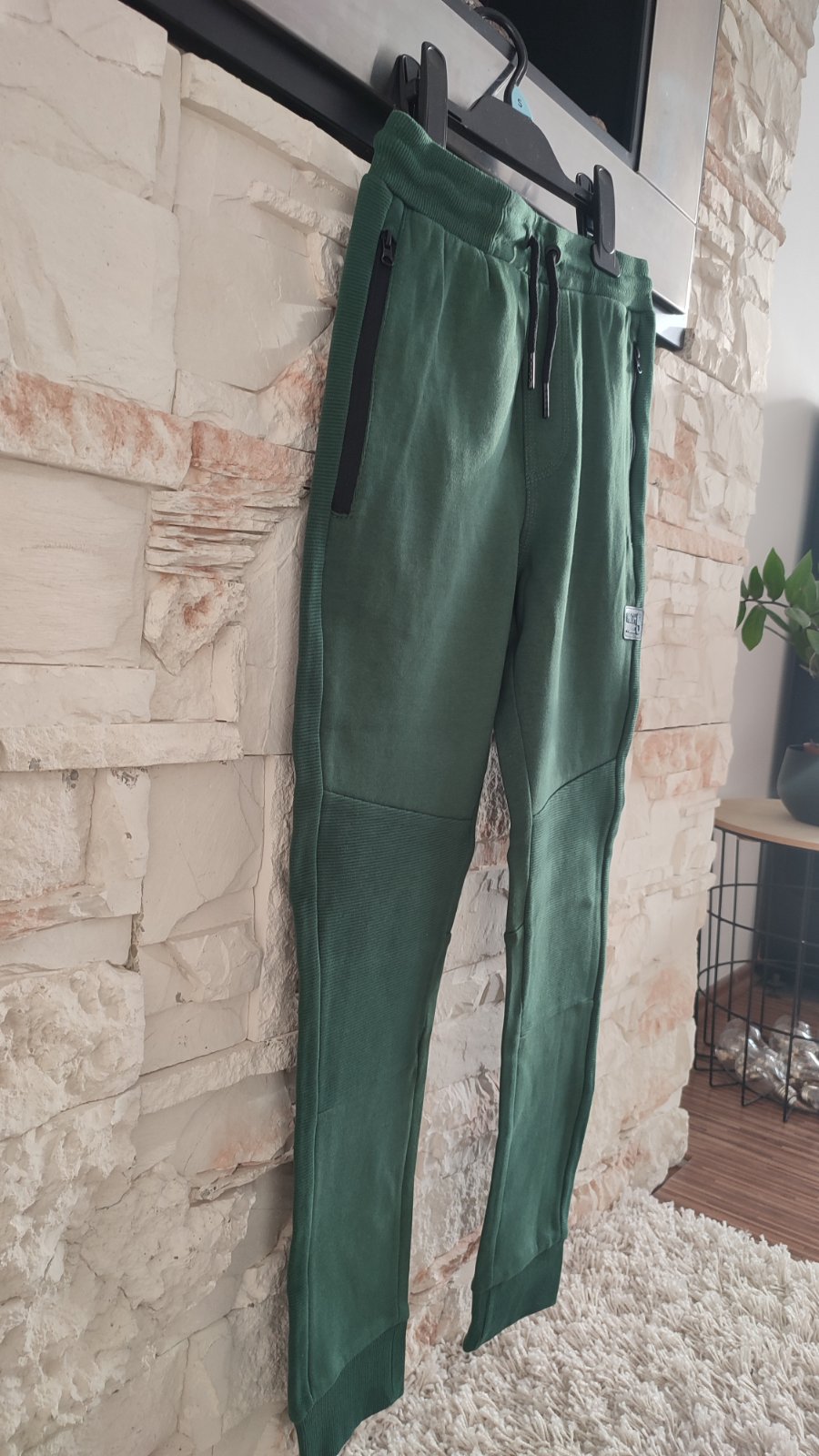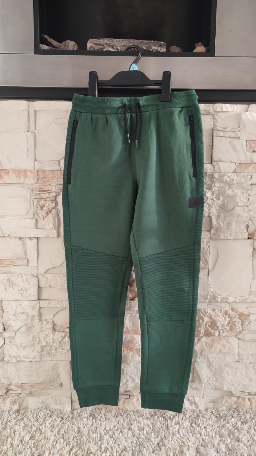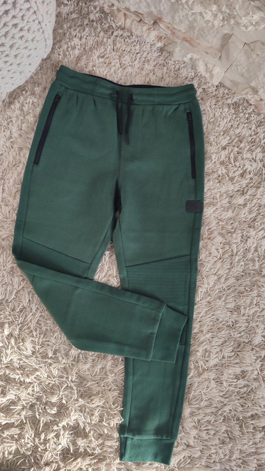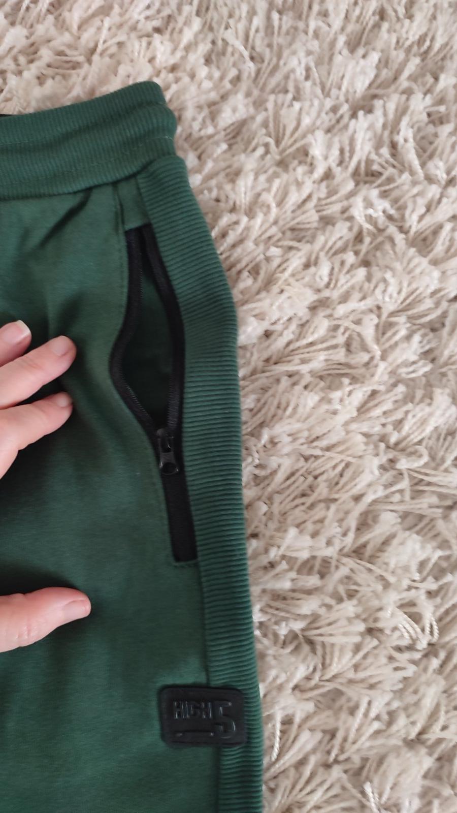 Ponukam tmavozelené teplaky , po bokoch 2 funkcne vrecka na zips. Spevnené kolená, zaujímavé detaily, nášivka , vzadu jedno funkčné vrecko. Pas je na gumu + funkcna snurka.